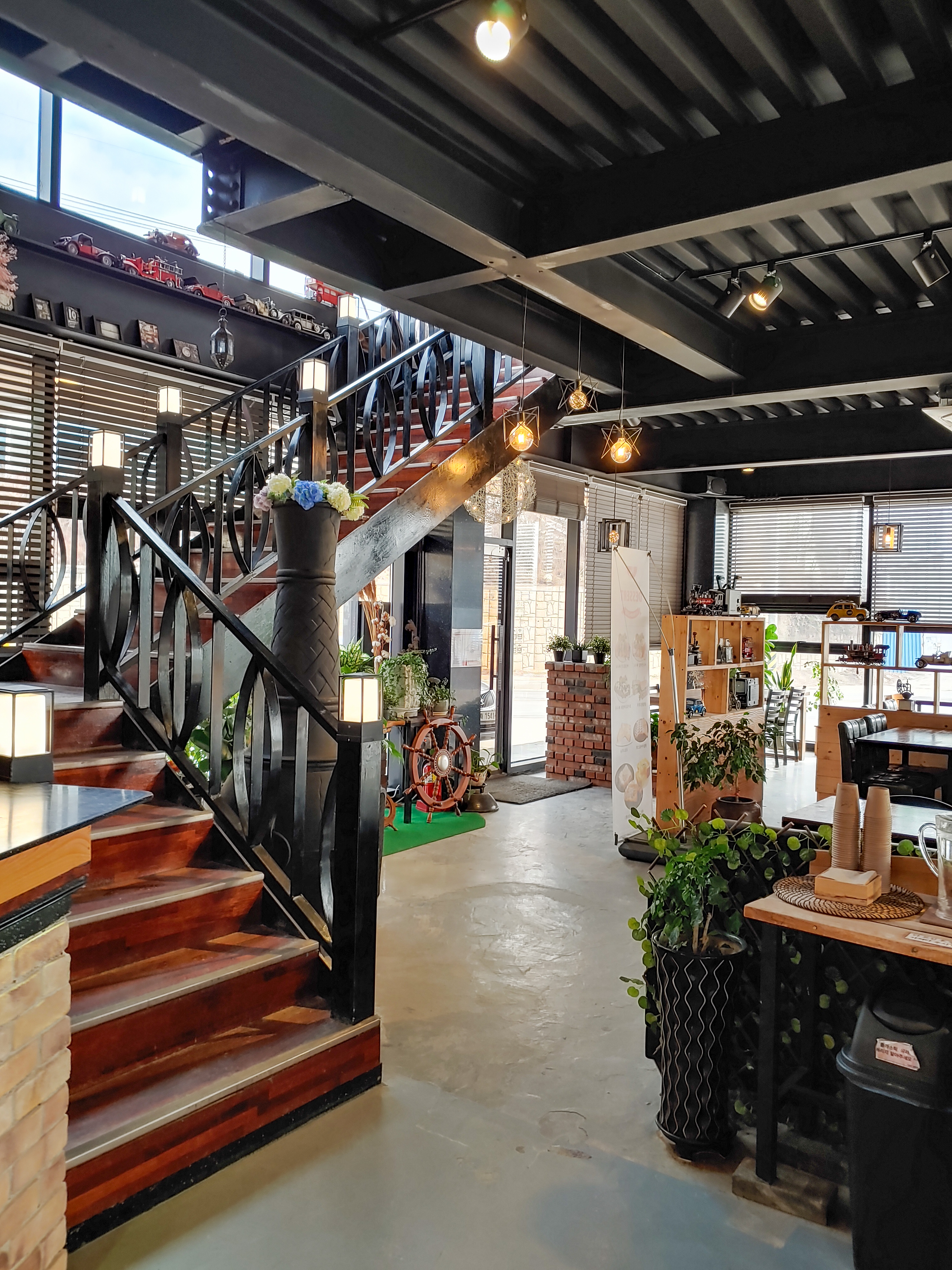 카페가 러프하고 식물들도 잘 배치해서 그런지 약간 야외인 것 같은 느낌도 납니다. 2층으로 이어지는 계단에 배치한 조명도 일부러 더 야외 같은 느낌을 내려고 추가하신 것 같았어요.