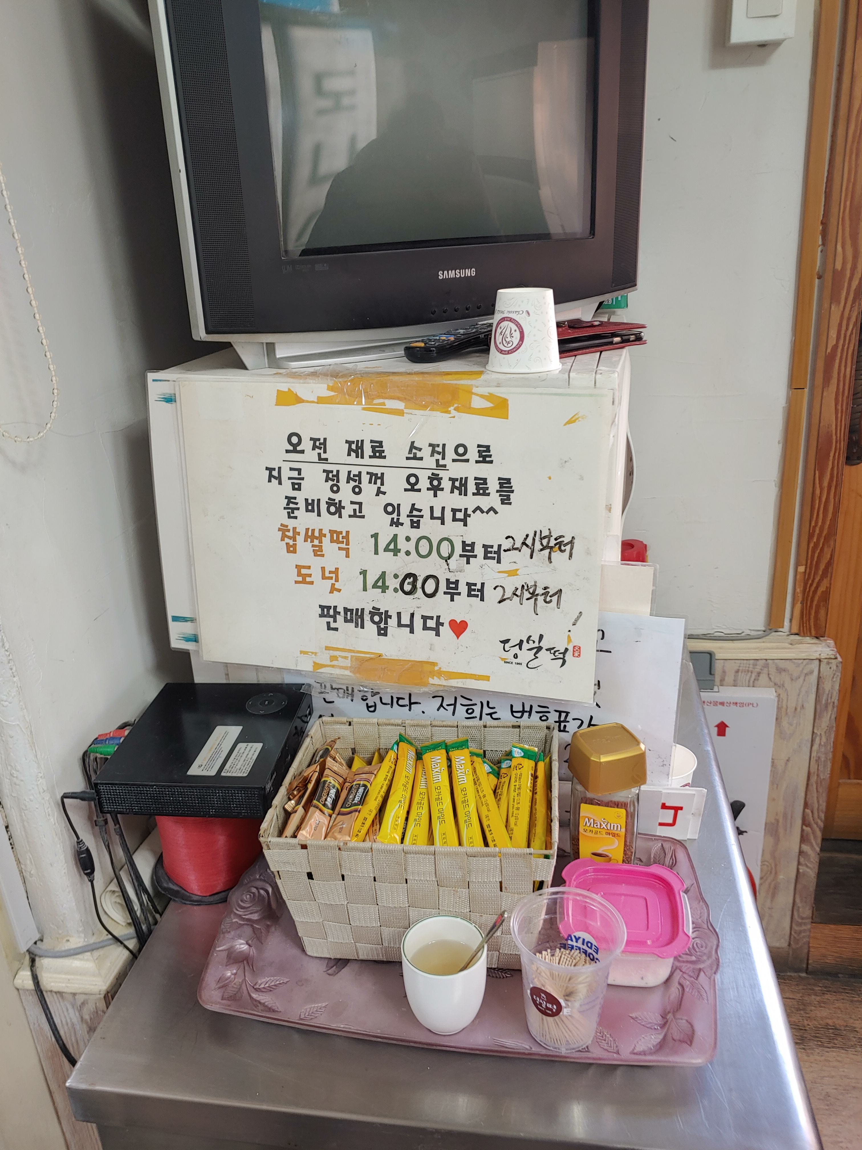 커피 위에 준비되어 있는 문구를 보니, 지금 안쪽에서 준비하는 찹쌀떡은 오후 2시에 완료되는 것 같습니다.