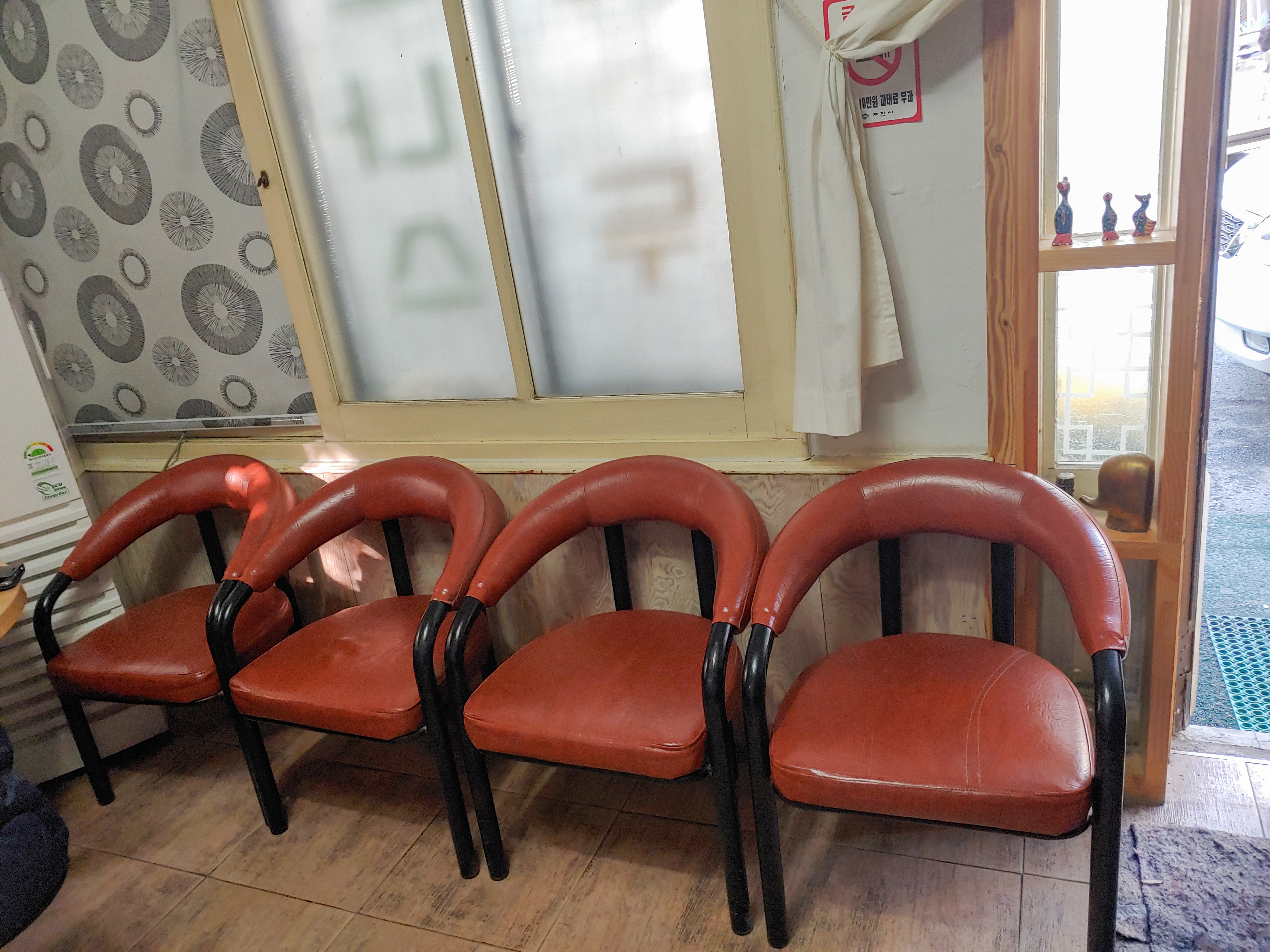 입구쪽엔 대기하는 사람들을 위한 의자 4개가 배치되어 있습니다.