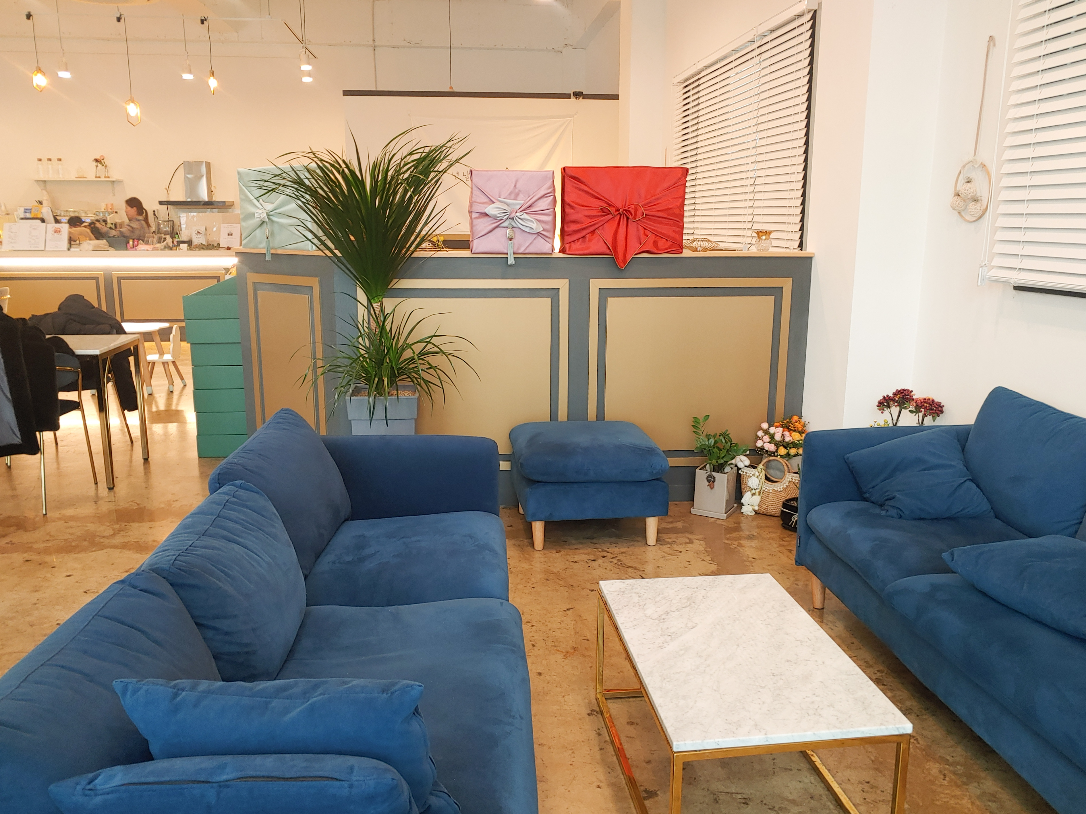 입구에서 들어오자마자 아주 큰 소파가 보였어요. 채도 낮은 소파 때문에 이쪽만 괜히 무거워 보이더라구요.