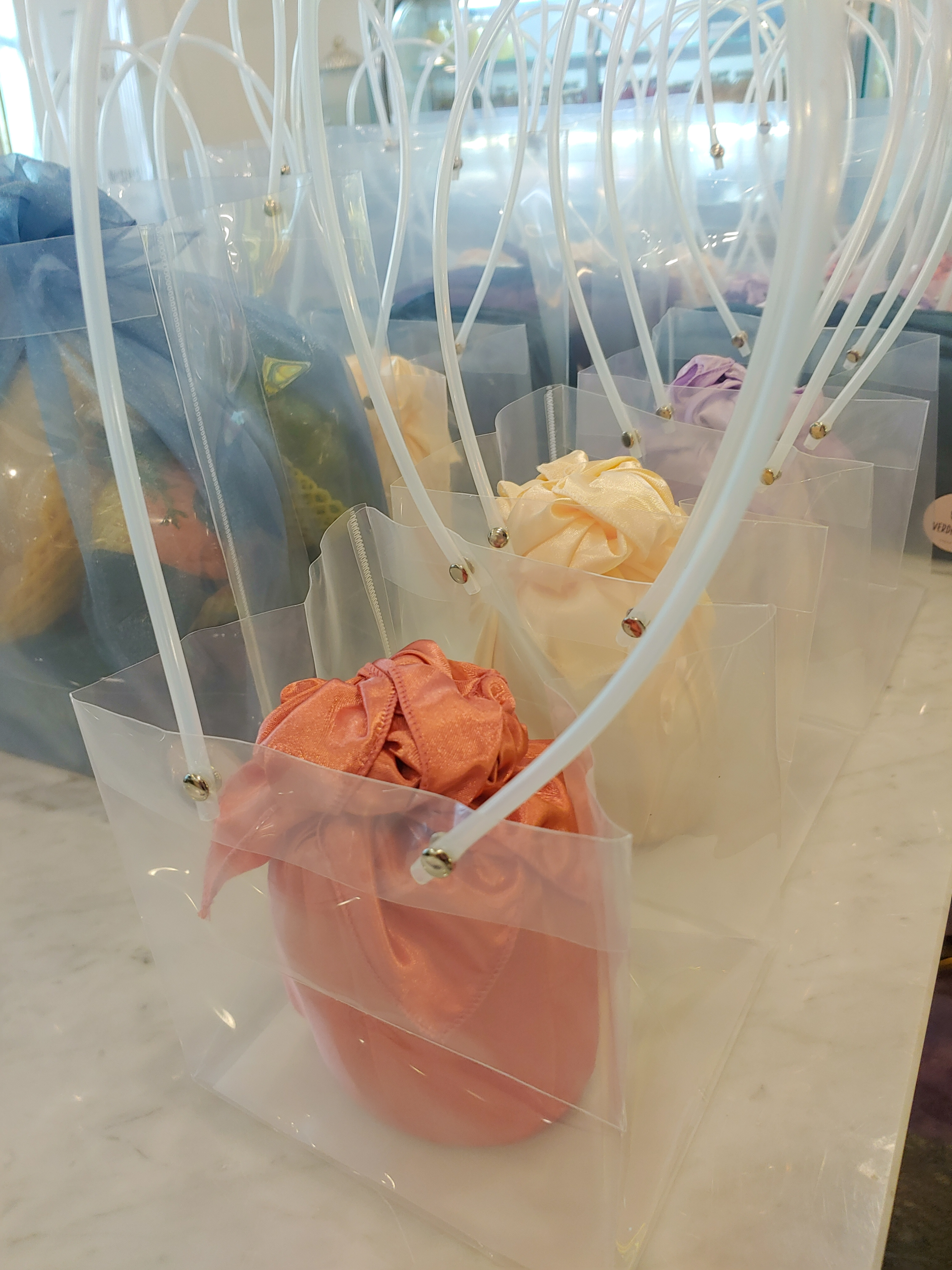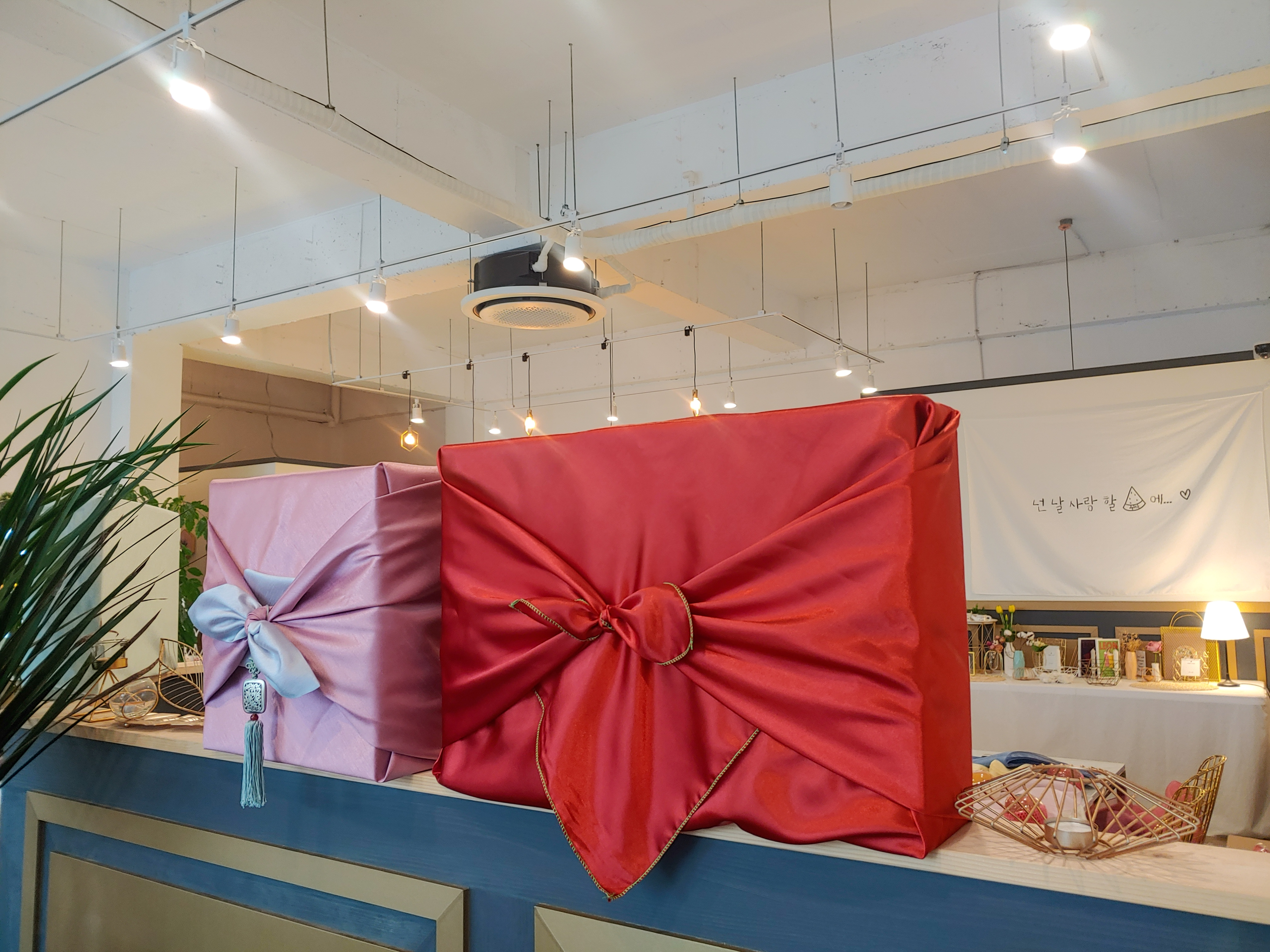 선물용 포장이 한 테이블에 가득 있습니다. 보자기 포장이 참 예뻐요.