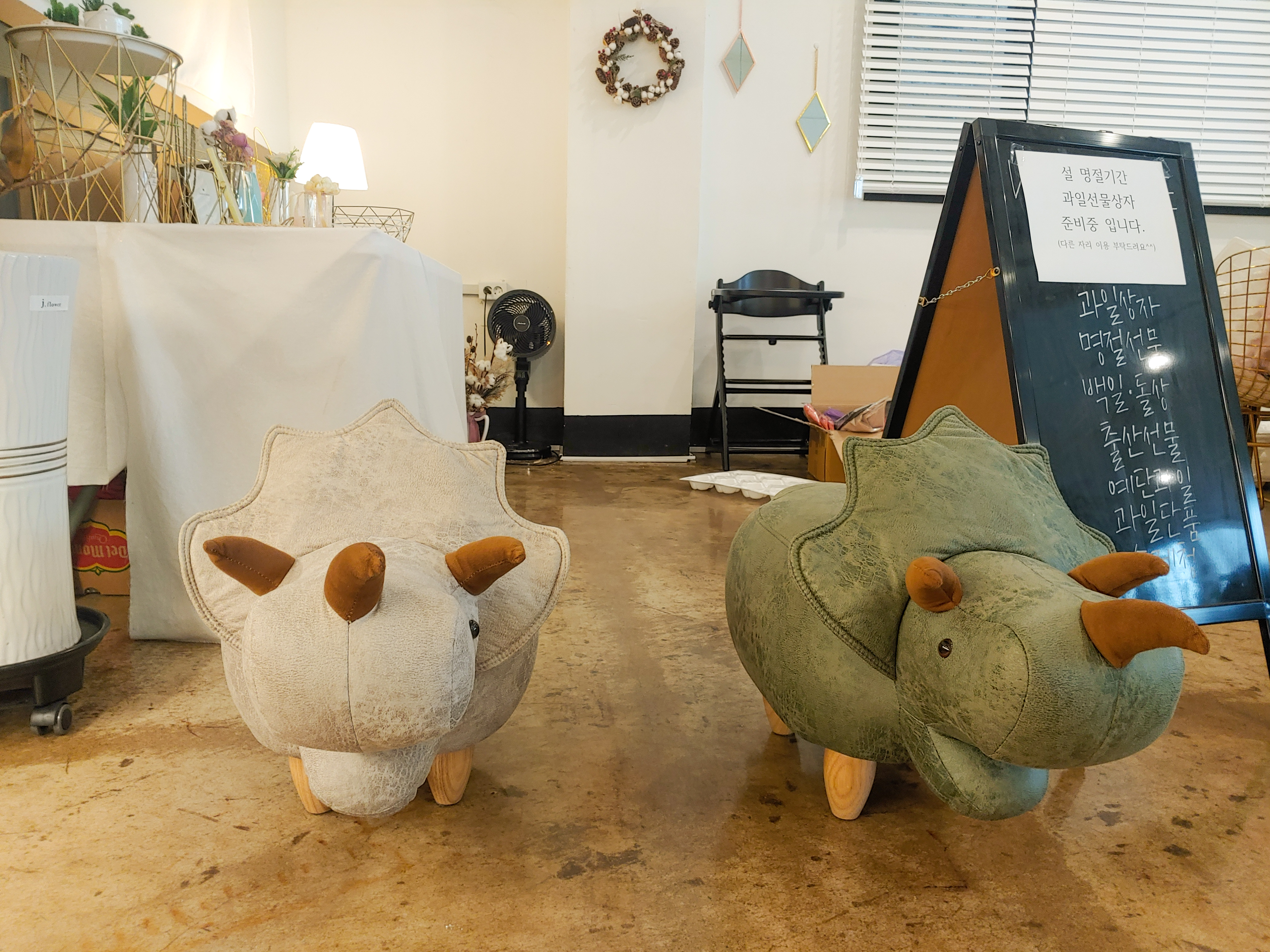 굉장히 귀여운 인형이 놓여져 있는 것을 뒤늦게 발견했는데, 트리케라톱스 공룡 같죠? 공룡을 이렇게 둥글둥글하게 귀엽게 표현하다니.