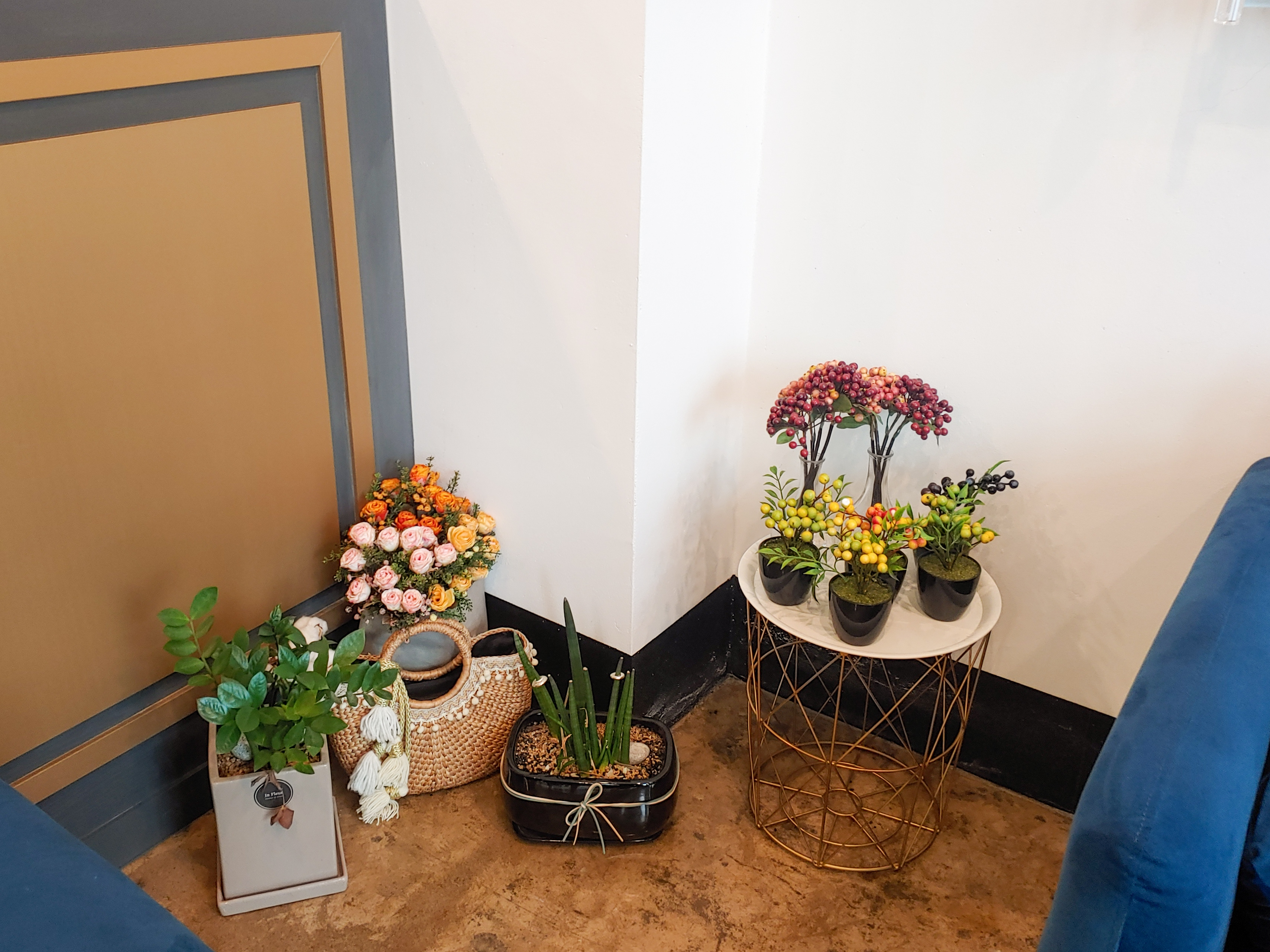 소파 사이에 소심하게 숨어져 있는 화분들과 벽걸이 장식품.