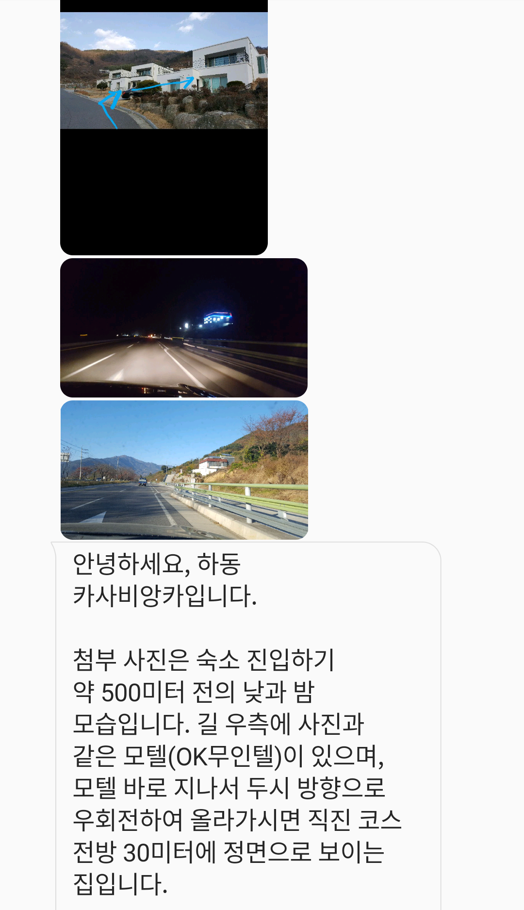 네, 사장님 말씀대로 체크인은 3시인데- 미리미리 헤매일까 오는 길을 사진까지 첨부하며 세세하게 알려주십니다. 취사가 안되는 숙소를 걱정하여 맛집까지 추천해주시는 센스.
