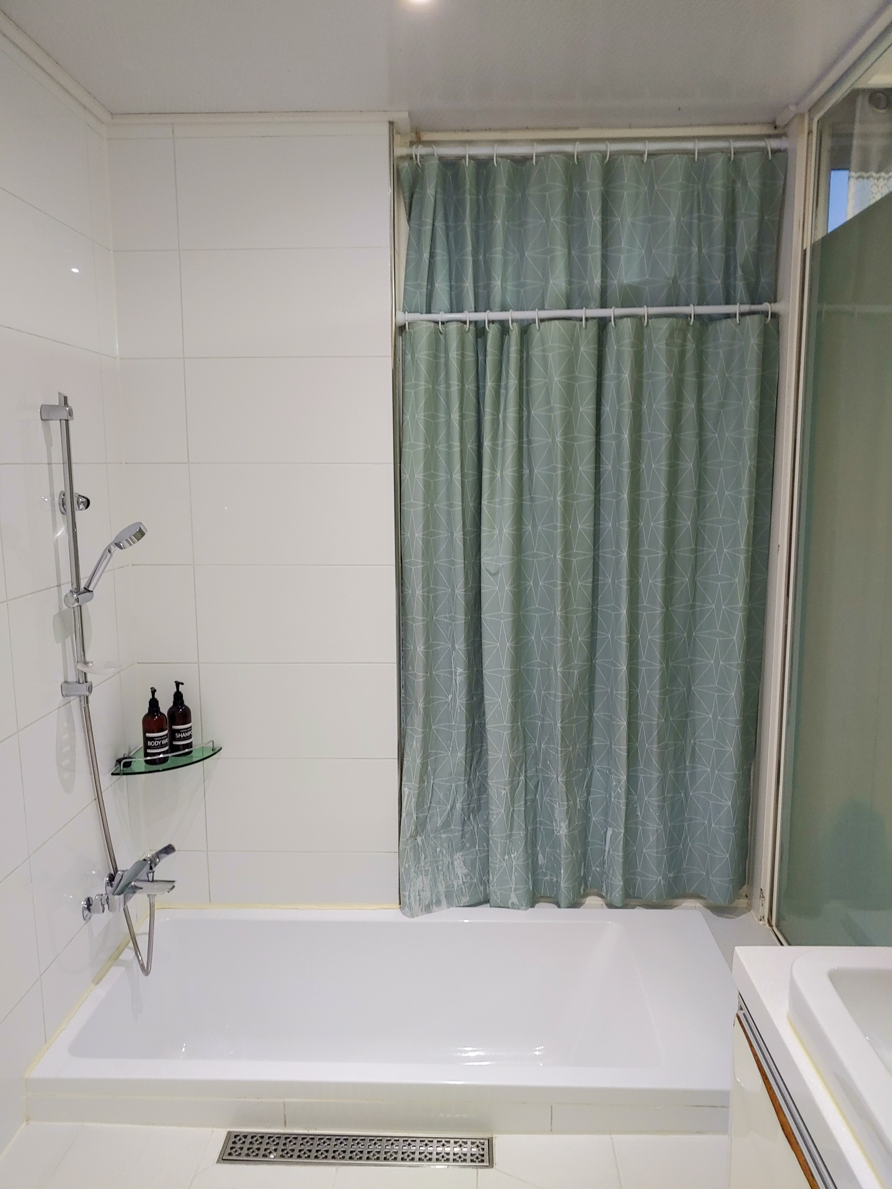 욕조가 거의 매립되어 있어요. 뭔가 익숙하지 않은 화장실 모습이라 신기하기도 했어요.