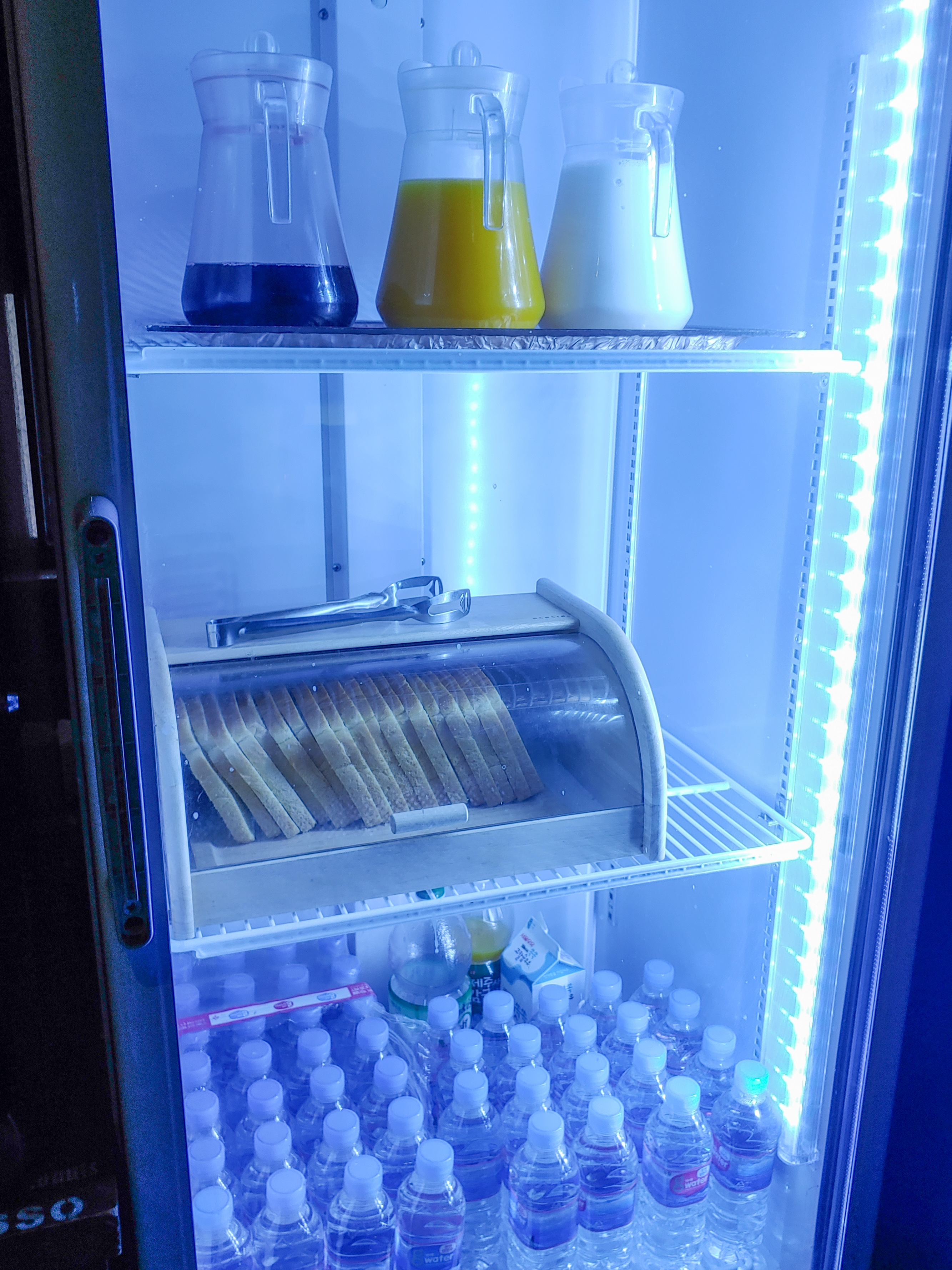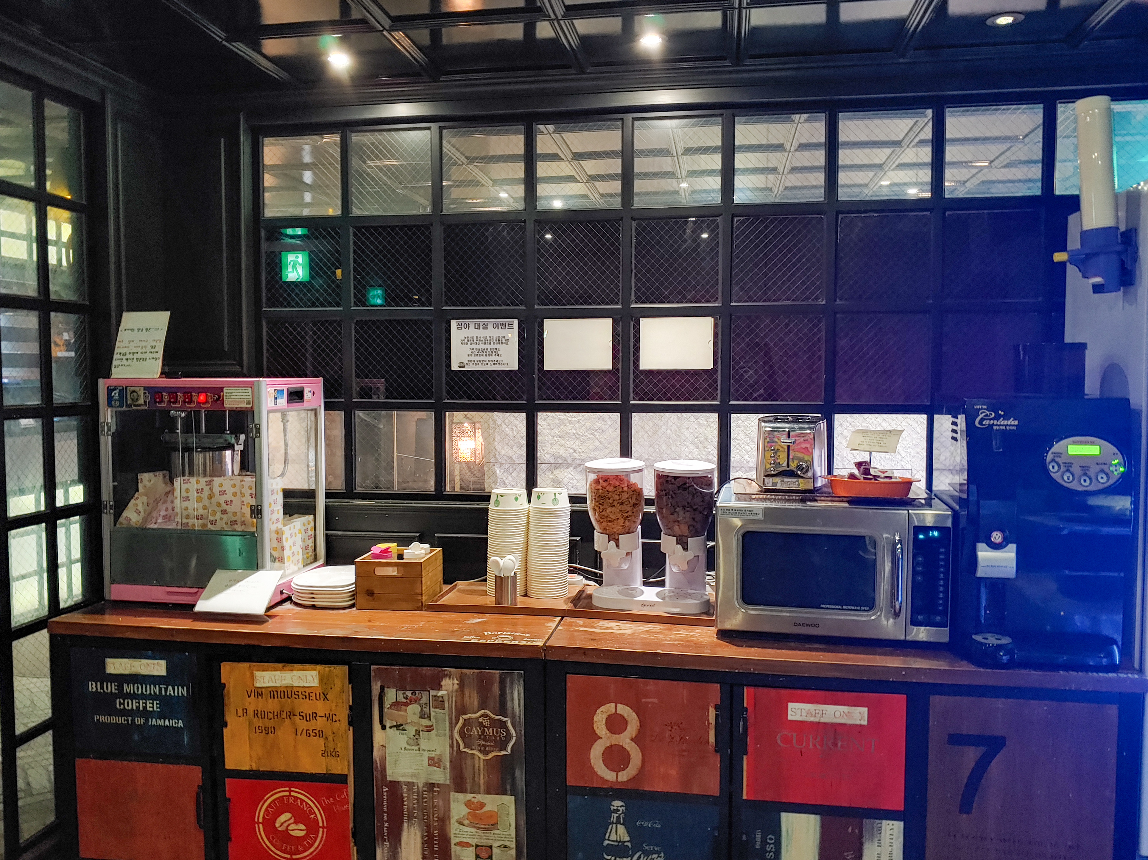 사진처럼 첫번째로 팝콘, 팝콘에 뿌려먹을 소스, 콘푸라이트, 전자레인지 위 토스트기와 딸기잼, 원두커피 기계가 쭈루룩~ 있어요. 커피 머신 오른쪽에는 마실 것이 준비되어 있는 냉장고가 있습니다.