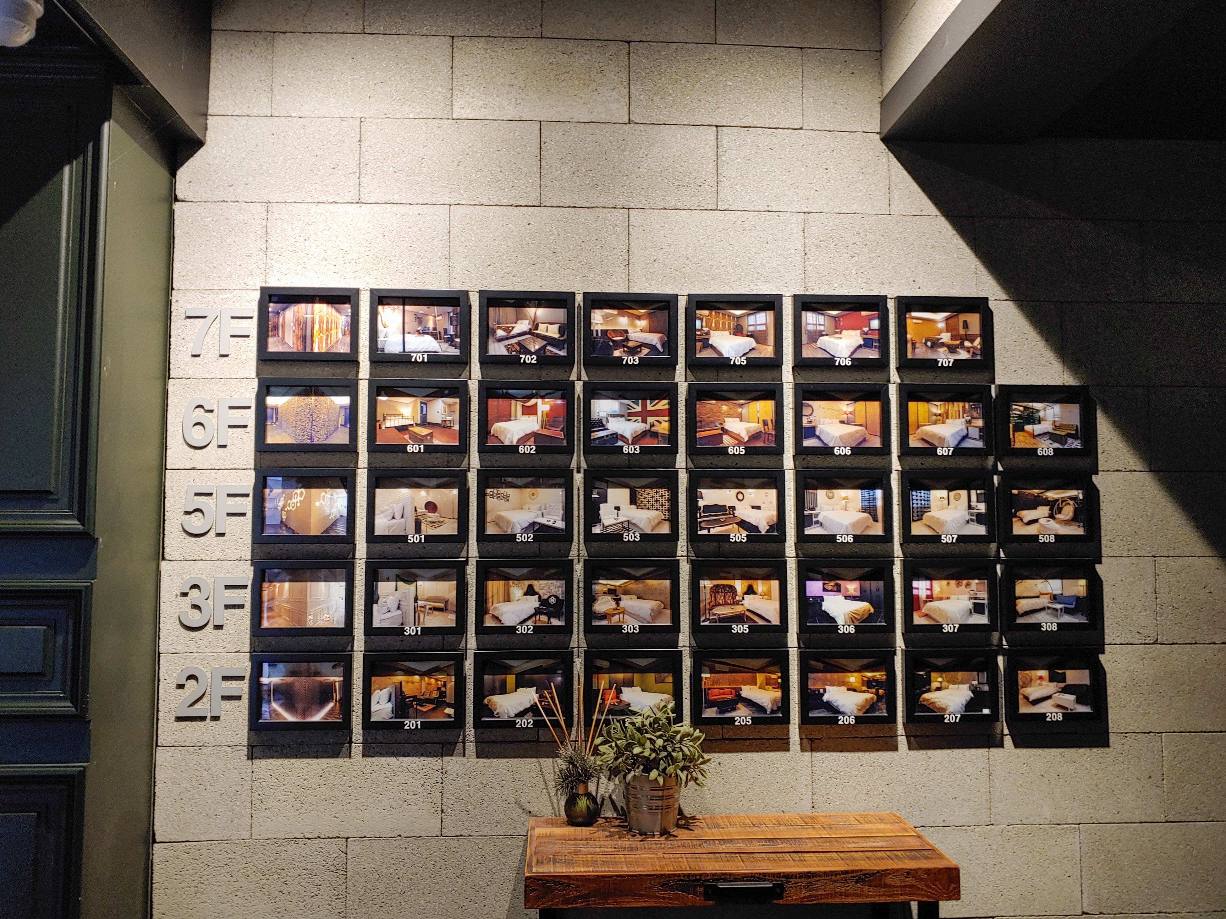 인셉션에 가서 야놀자 예약건에 대해 말하고 키를 받아 엘리베이터로 올라갔습니다. 엘리베이터 맞은 편에는 각 방마다 사진이 걸려 있었어요.