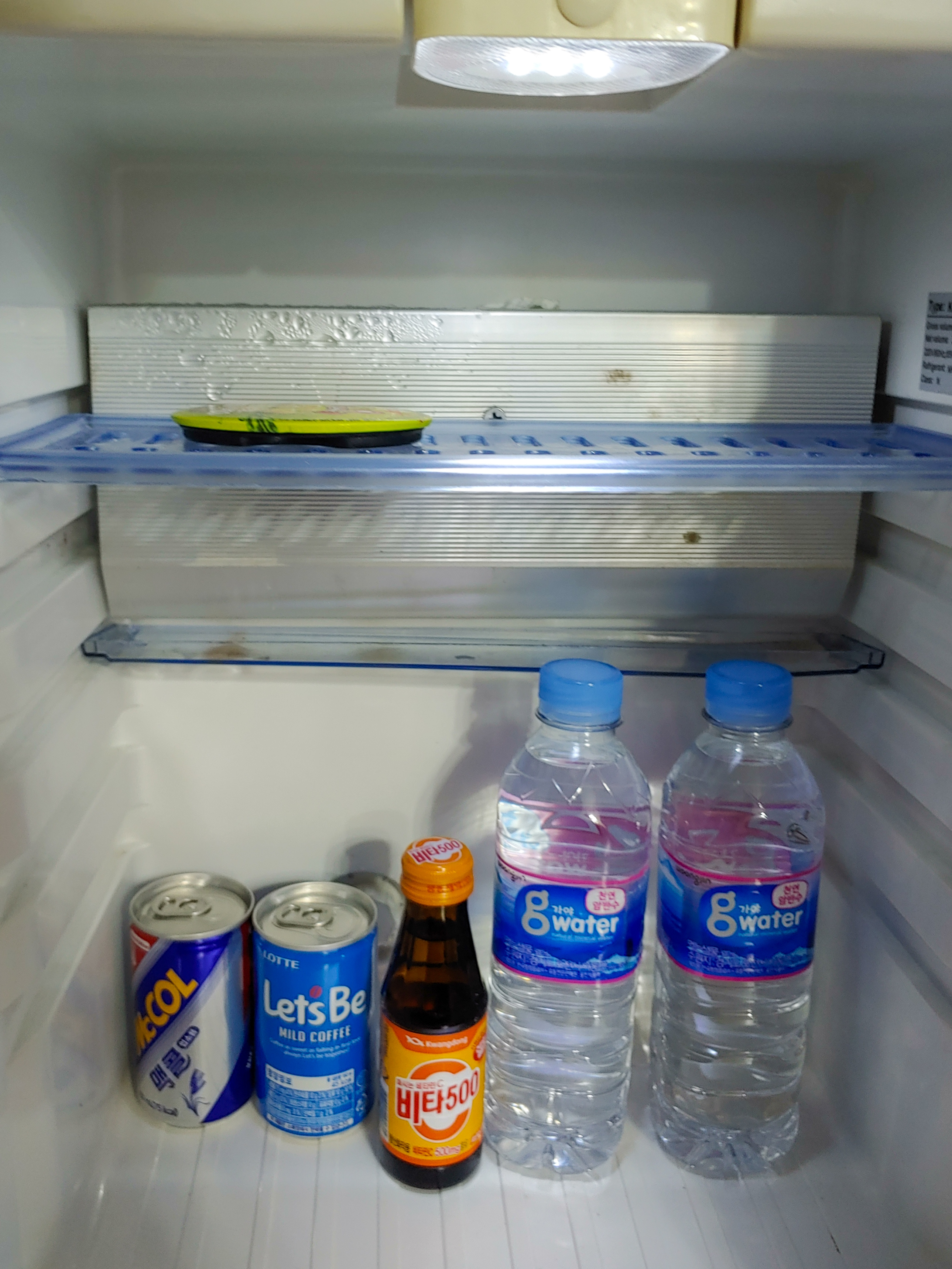 미니 냉장고에 물 2개와 비타500, 레쓰비와 맥콜도 있어요.