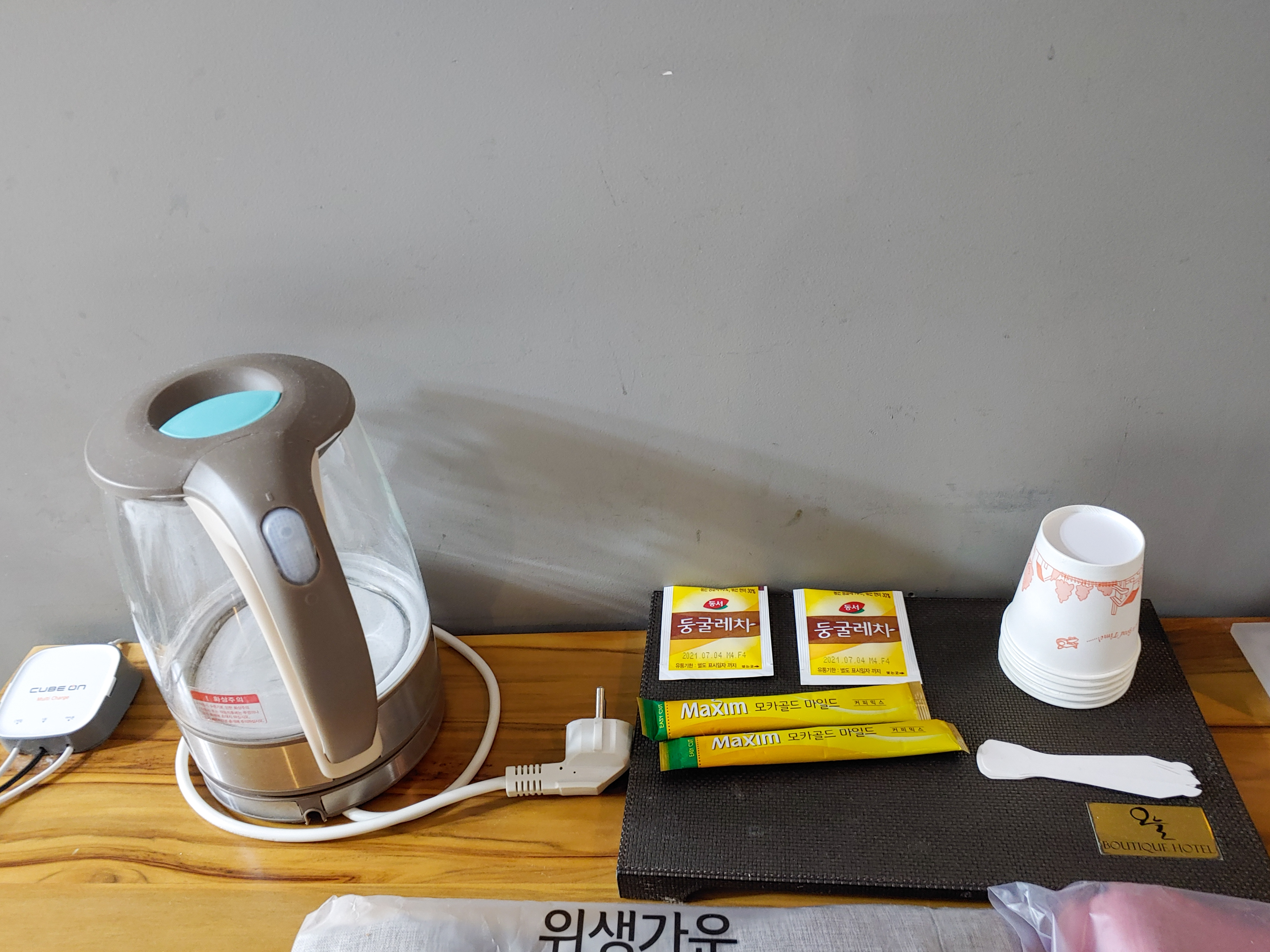믹스커피와 둥글레차가 준비되어 있고, 컬러가 다른 위생 가운도 준비되어 있습니다.