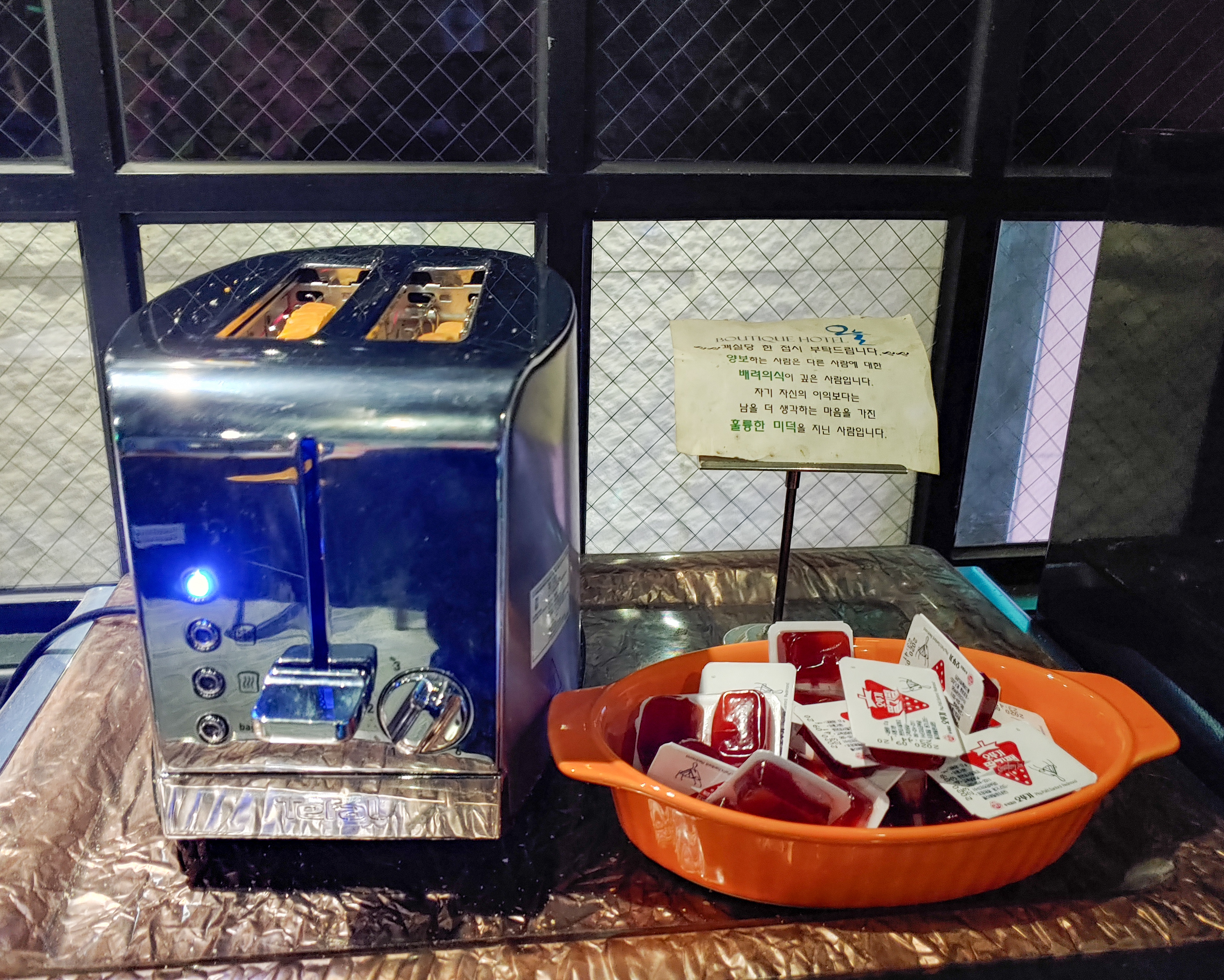 그리고 방으로 가져갈 수 있는 쟁반도 있는데, 그냥 여기서 먹고 가도 되는 기다간 테이블 바가 있어요.