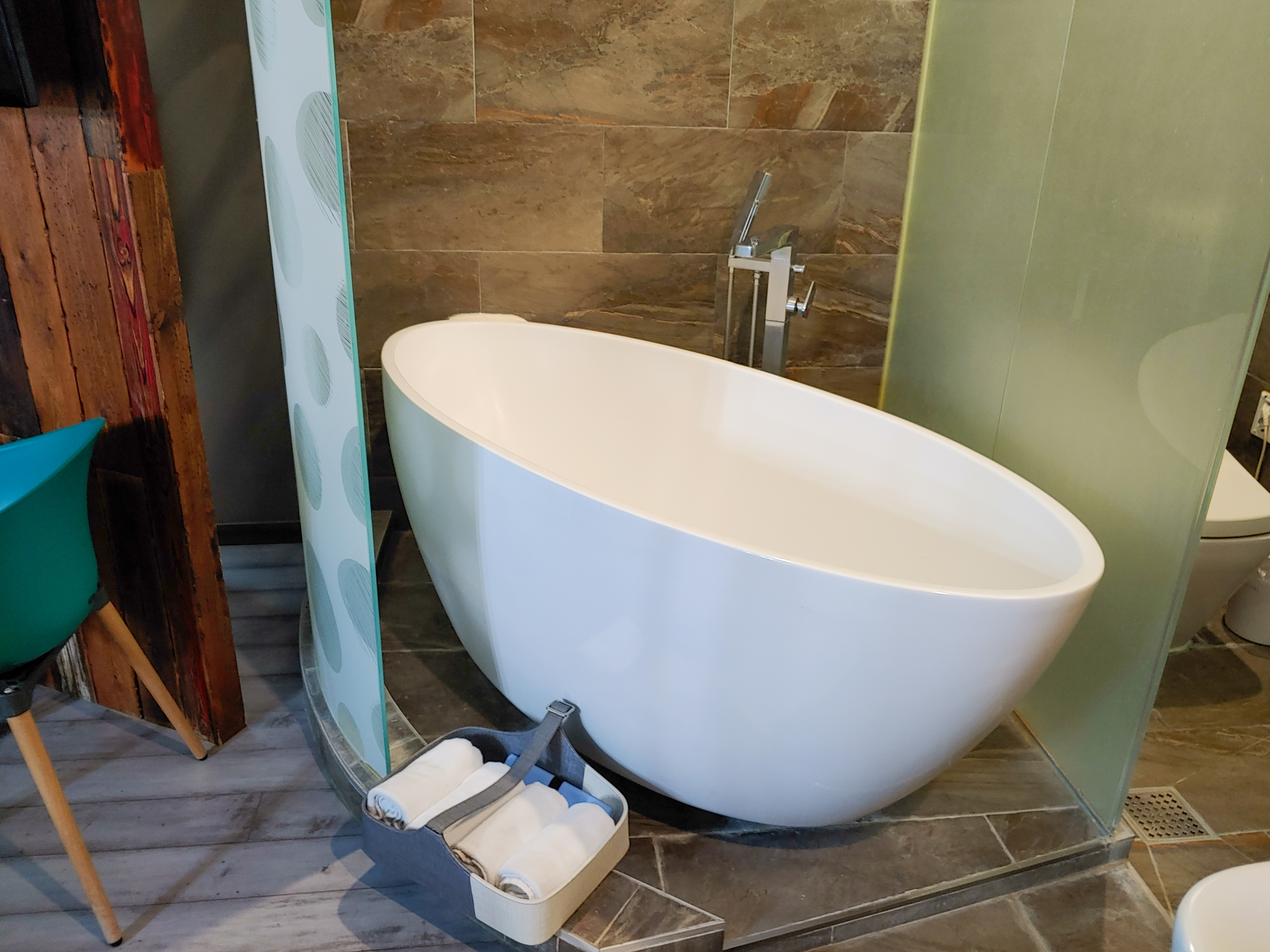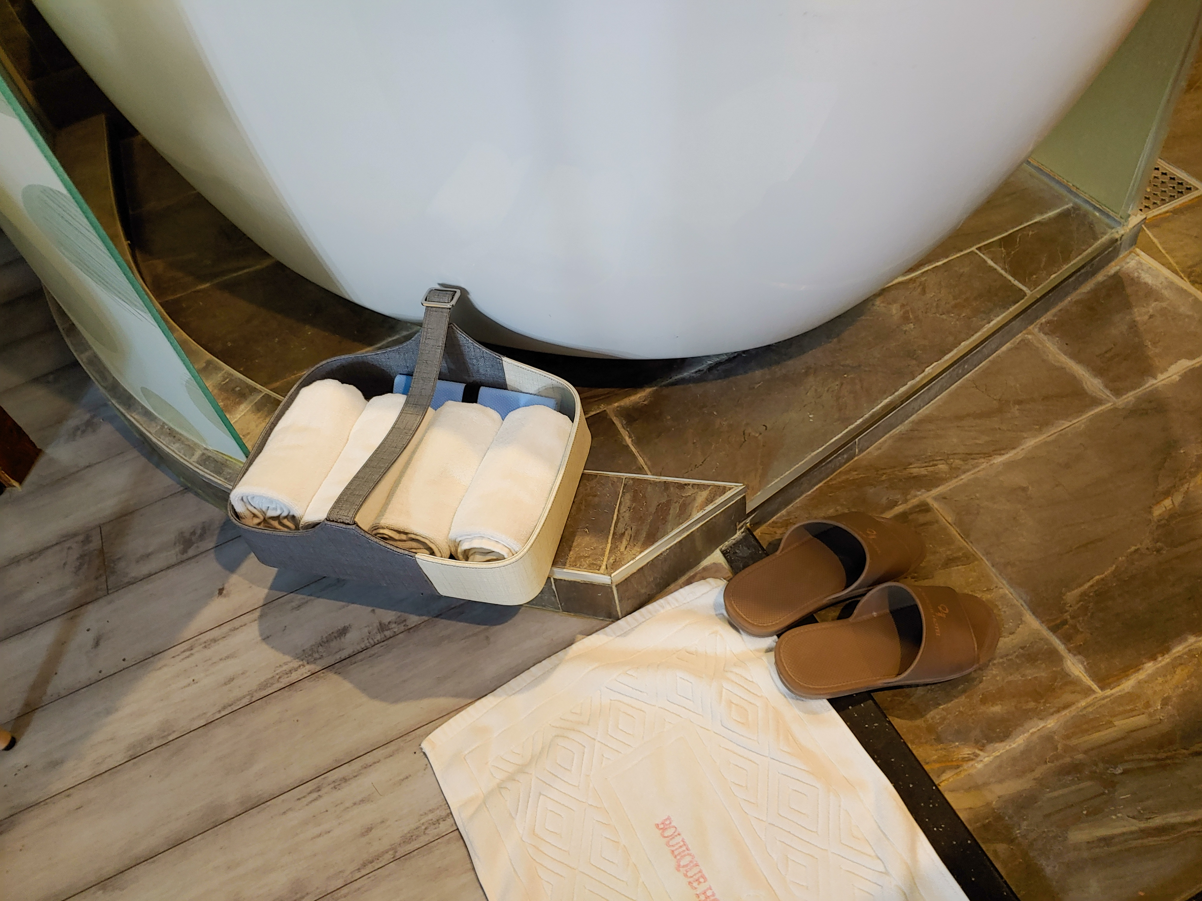 (전 혼자 왔지만) 2명이 넉넉하게 쓸 수 있는 수건이 욕조 앞에 있어요.