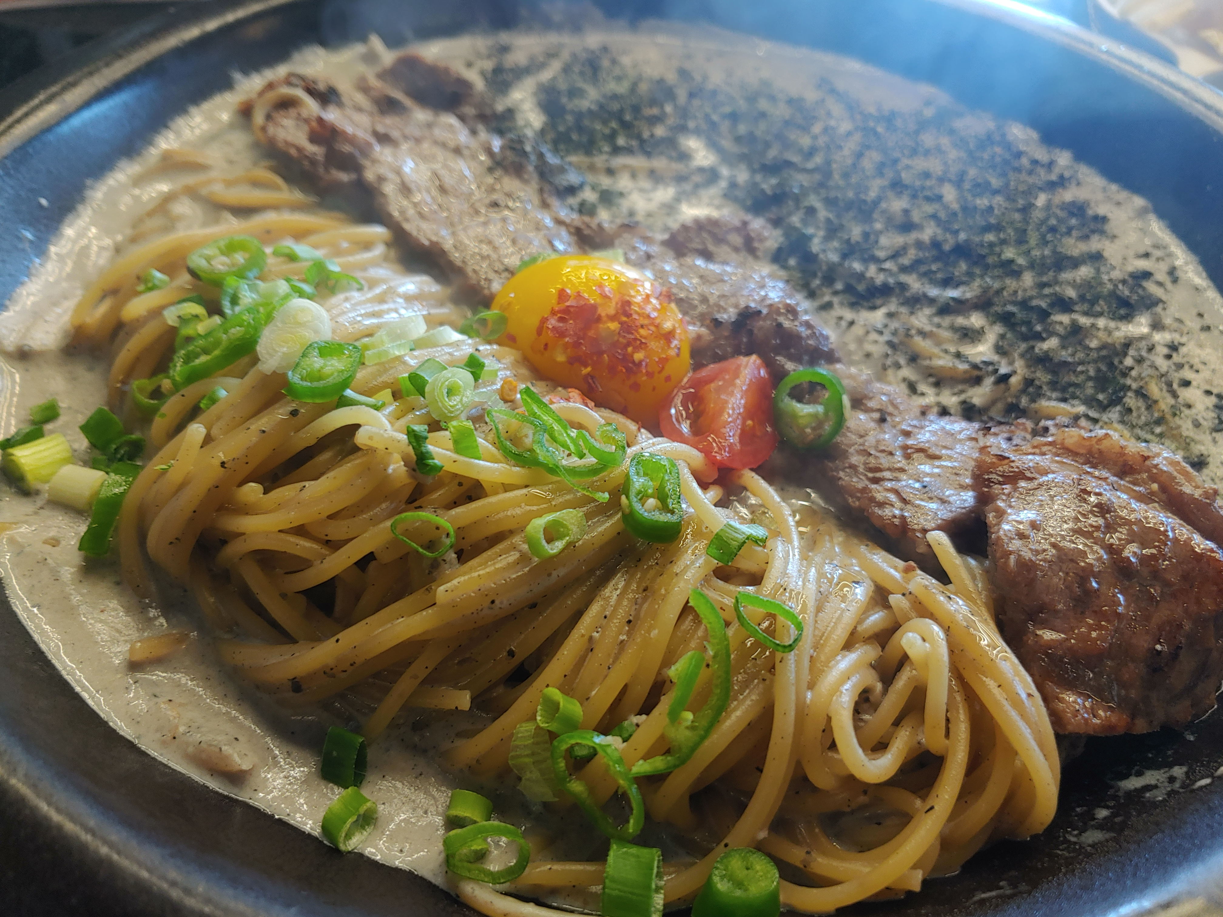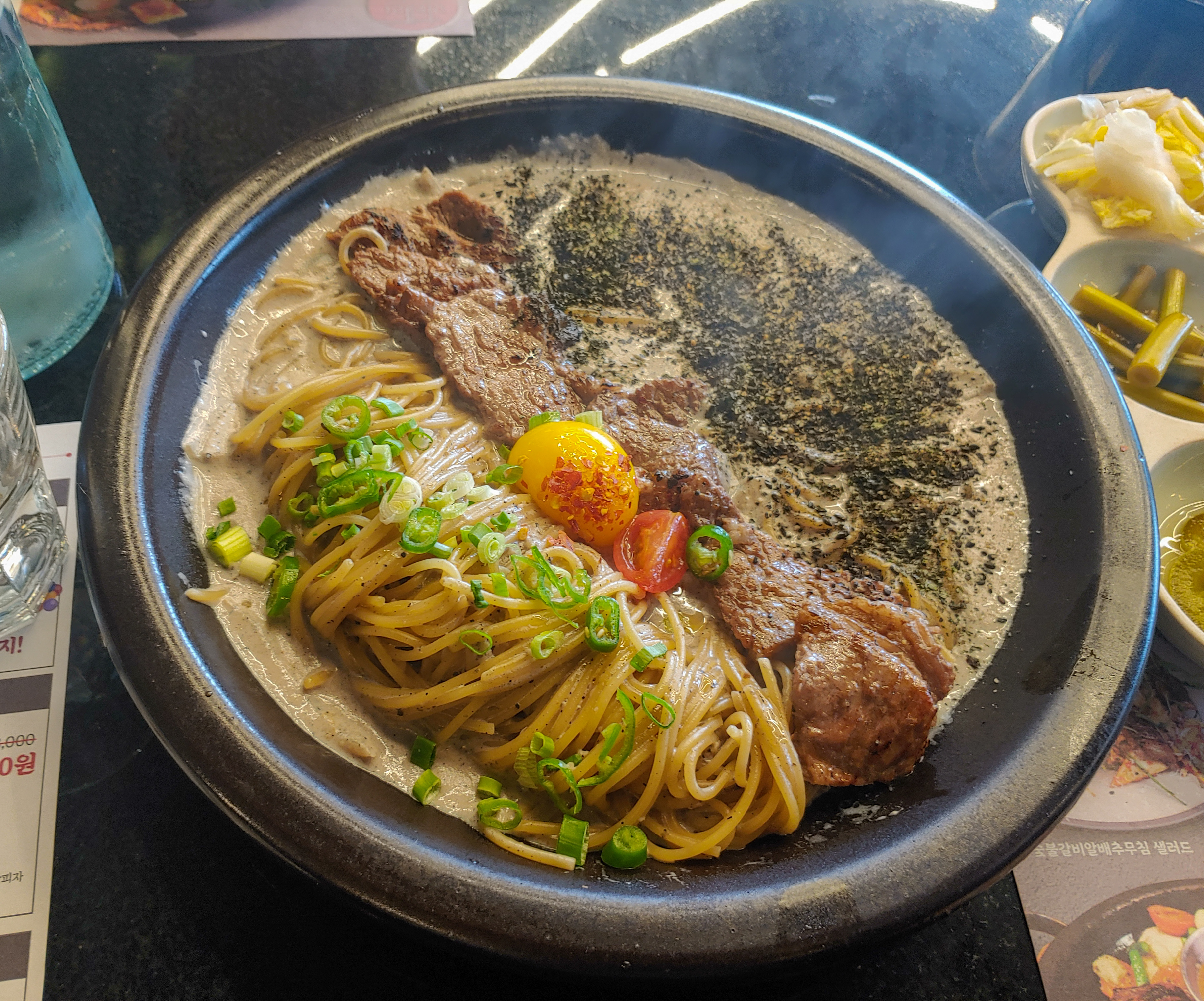 제일 먼저 나왔던 '숯불갈비 흑임자 파스타' 입니다.