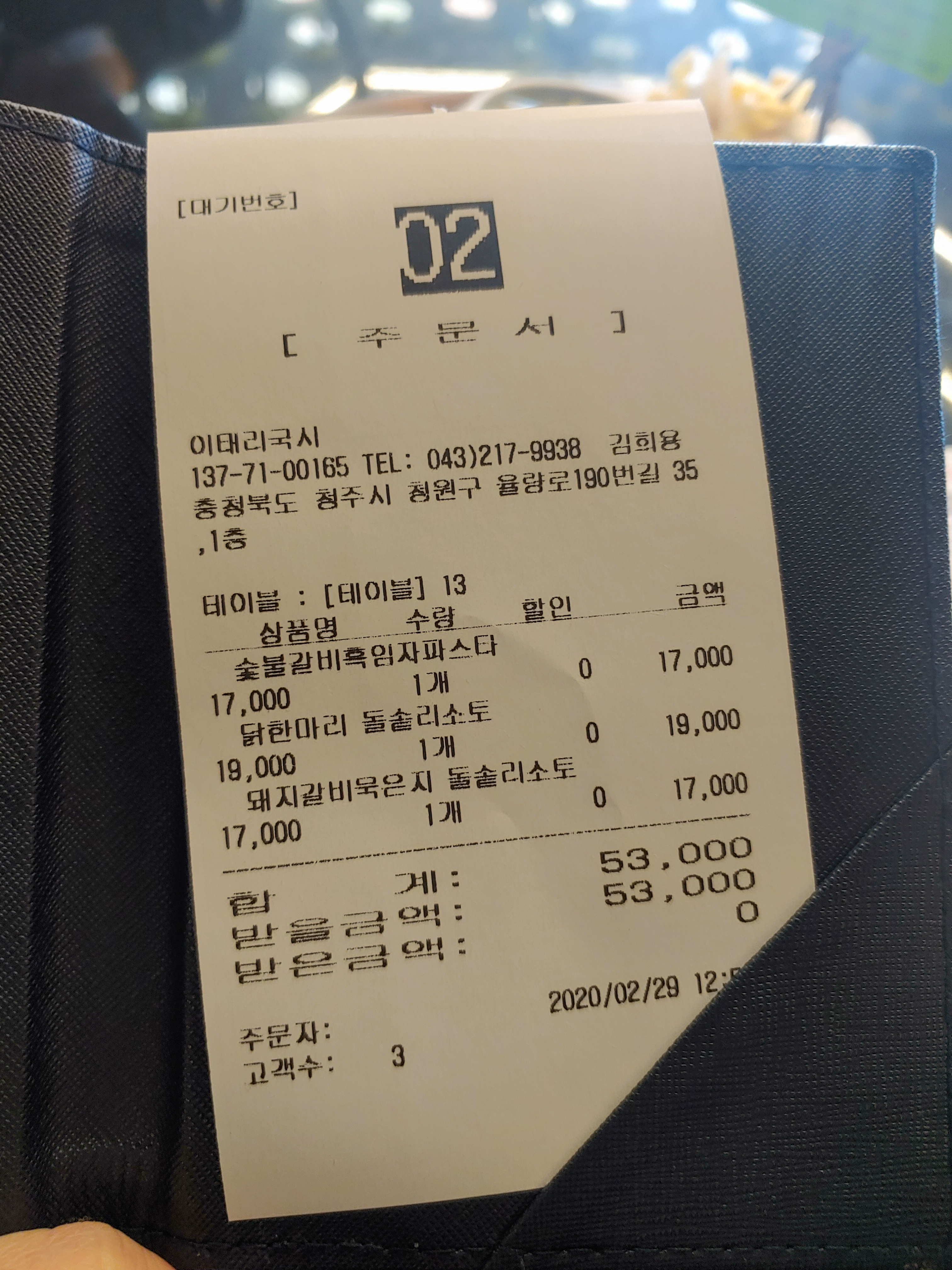 '숯불갈비흑임자 파스타' '닭한마리 돌솥리소토' '돼지갈비묵은지 돌솥리소토' 3가지 메뉴를 주문했습니다.