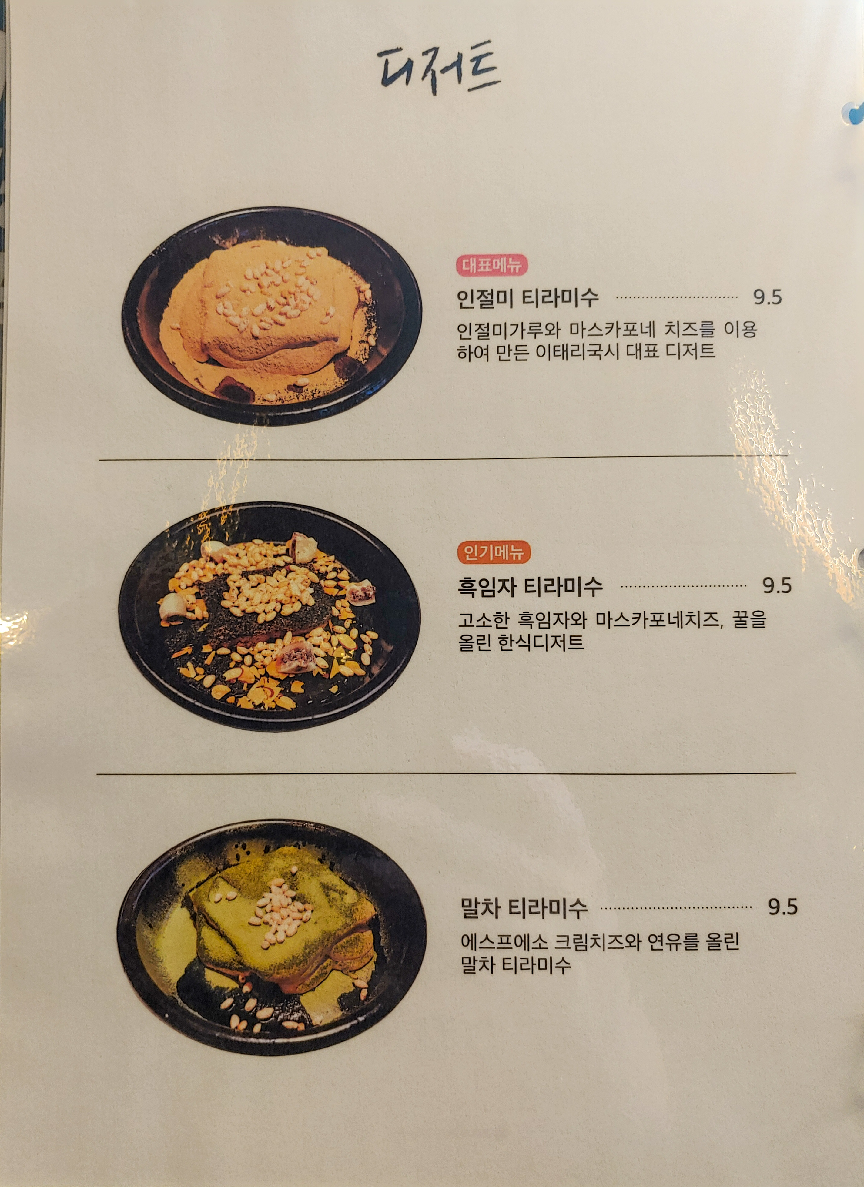 디저트 마저도 인절미와 흑임자, 말차 티라미수가 있었어요. (먹고 싶었지만 너무 배불러서 더 주문하지 못했어요.)