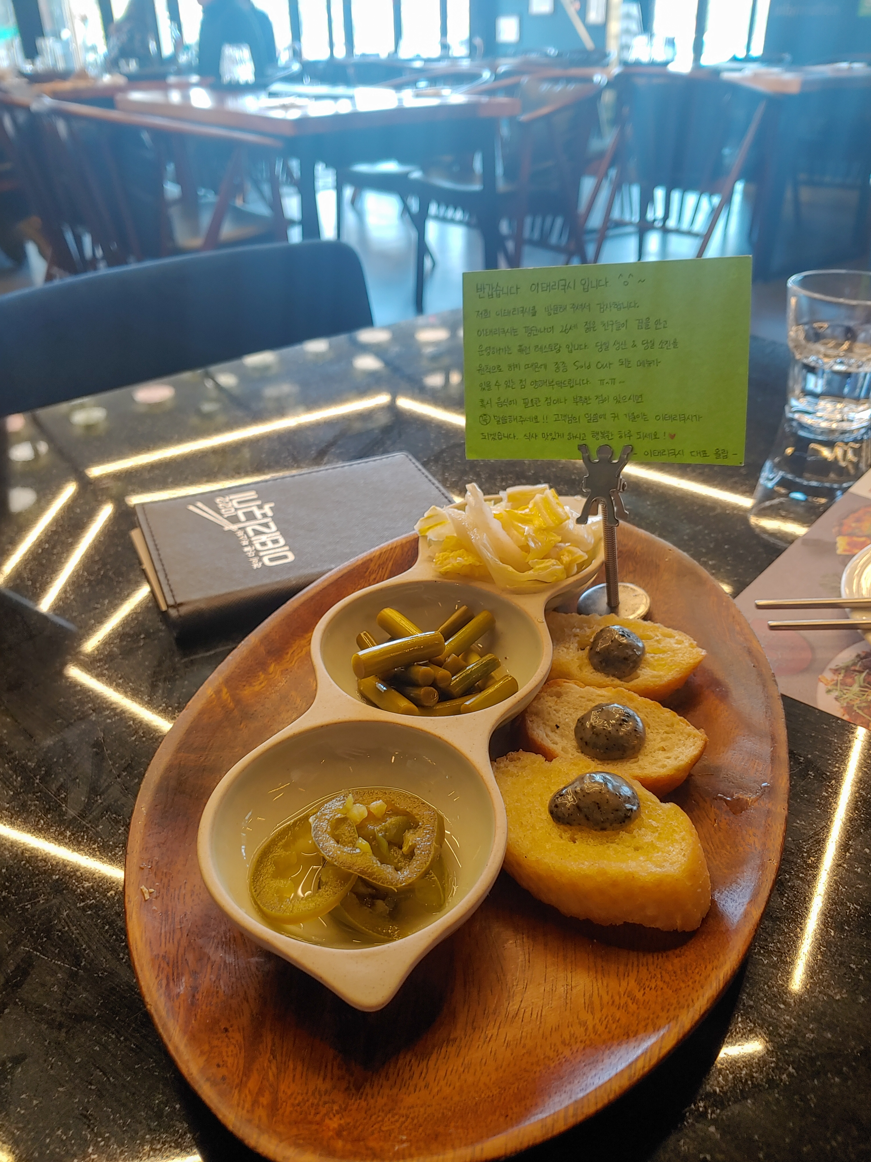 에피타이저 조그마한 식전빵. 그리고 손편지 같은 메모가 있습니다. 괜시리 응원하게 되는 메모였어요.