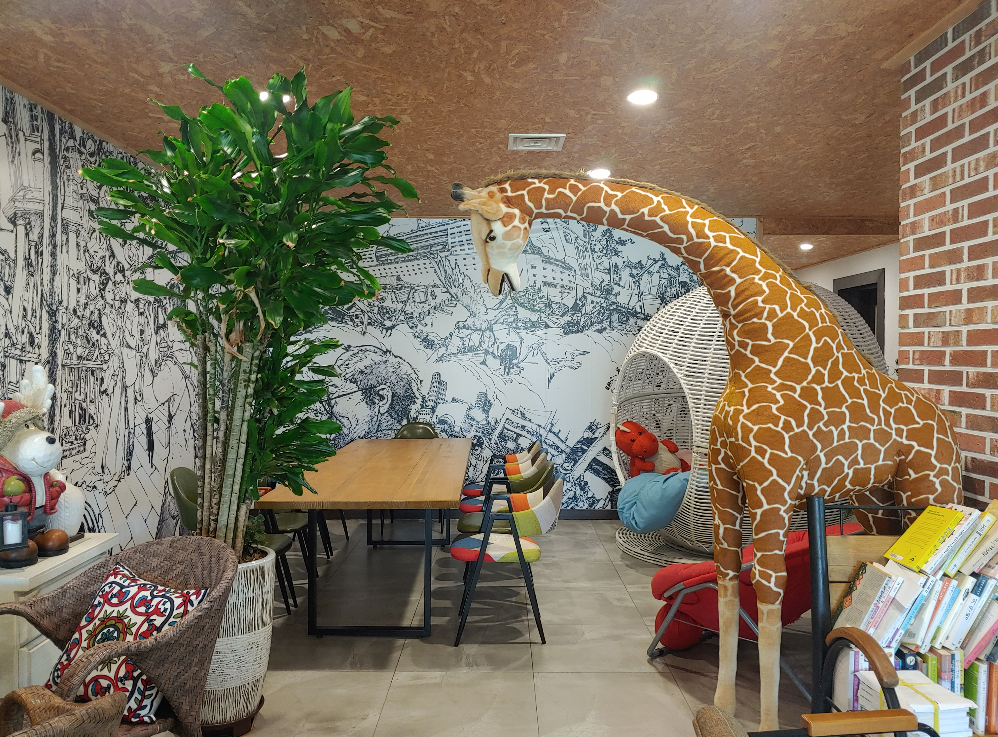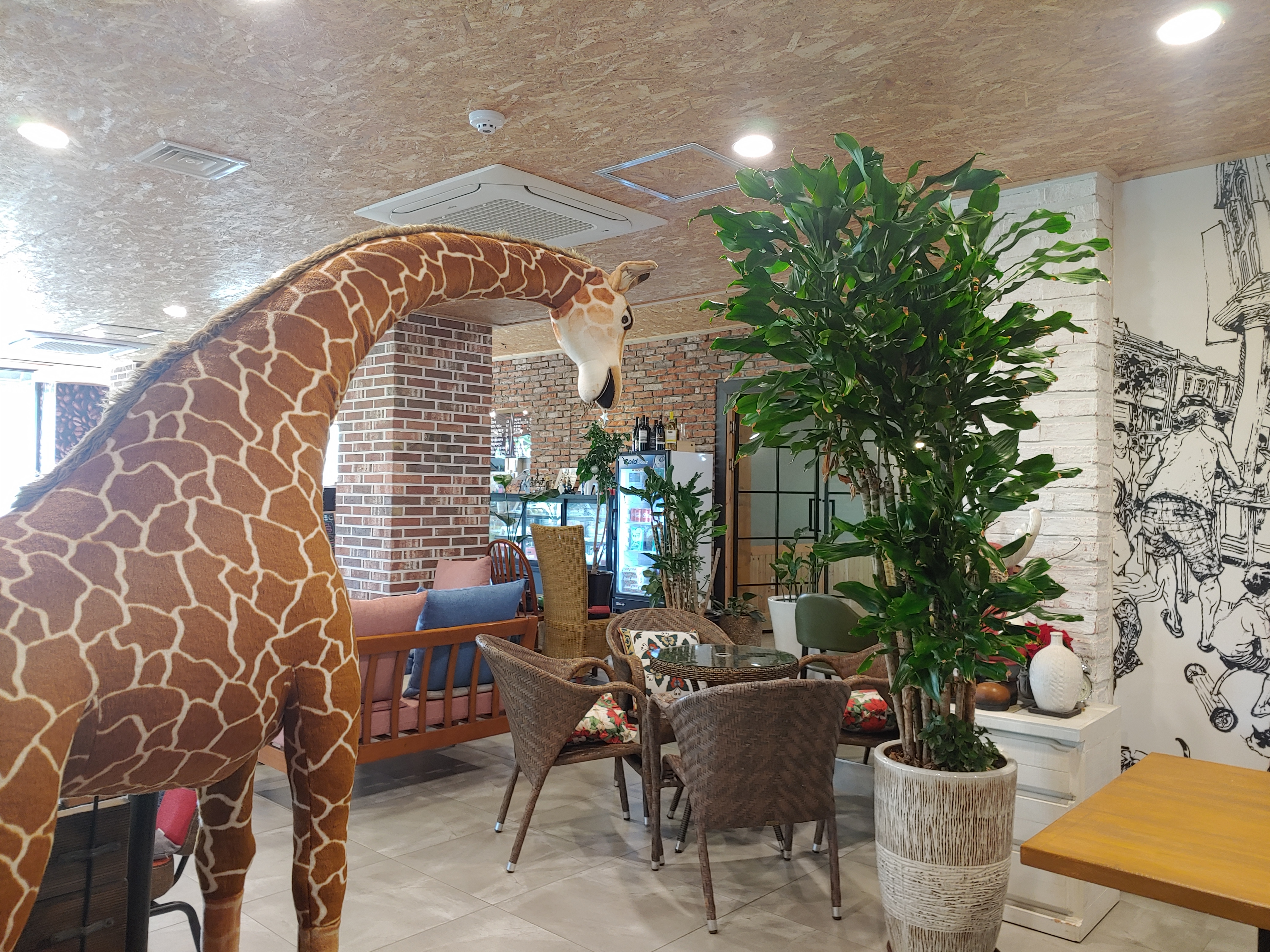 카페 한 쪽에 커다란 기린 인형이 있었어요!