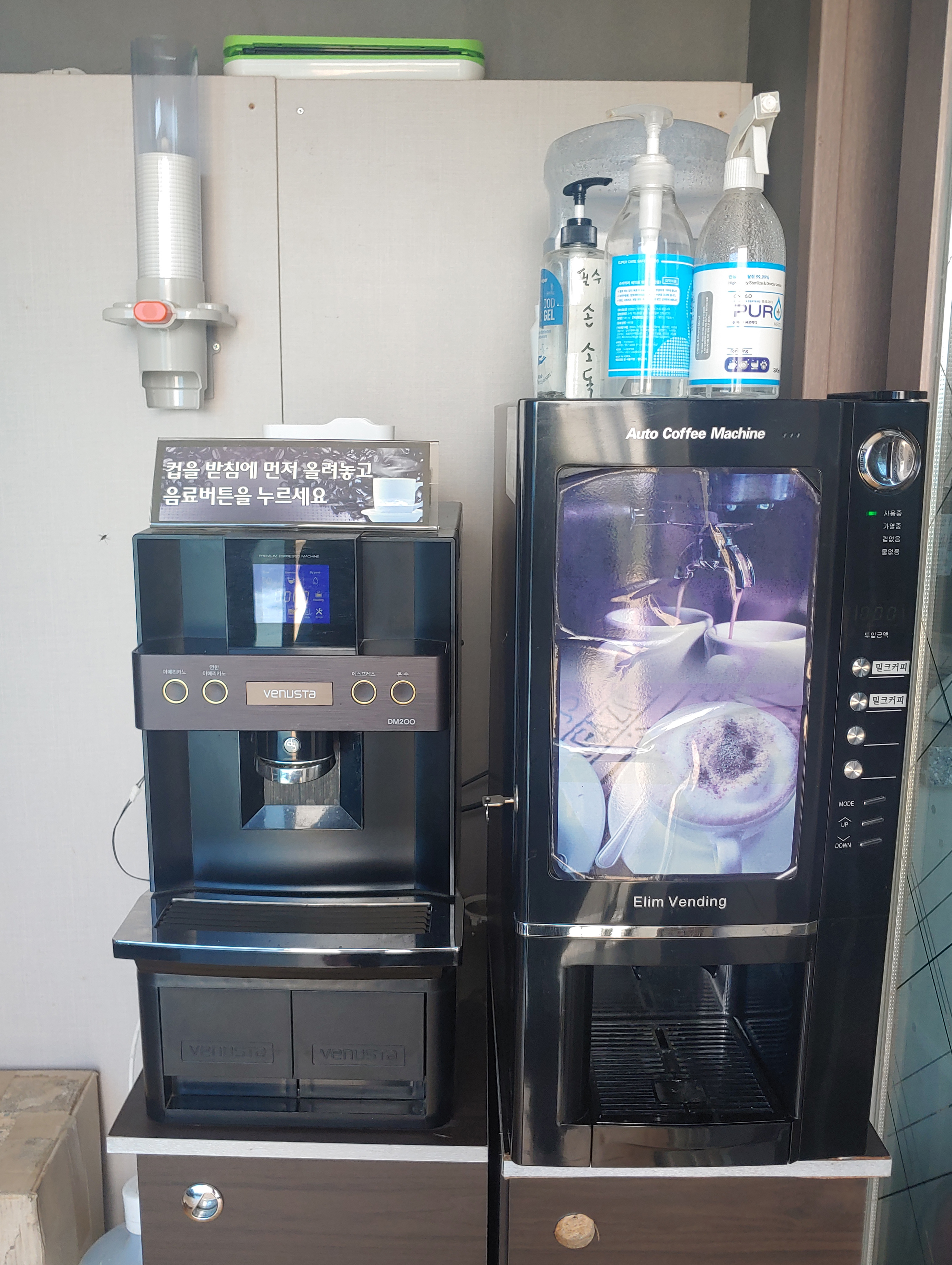 가게 입구에 있던 따뜻한 커피를 한 잔 뽑고 장수촌의 마당을 구경하러 나갔습니다.