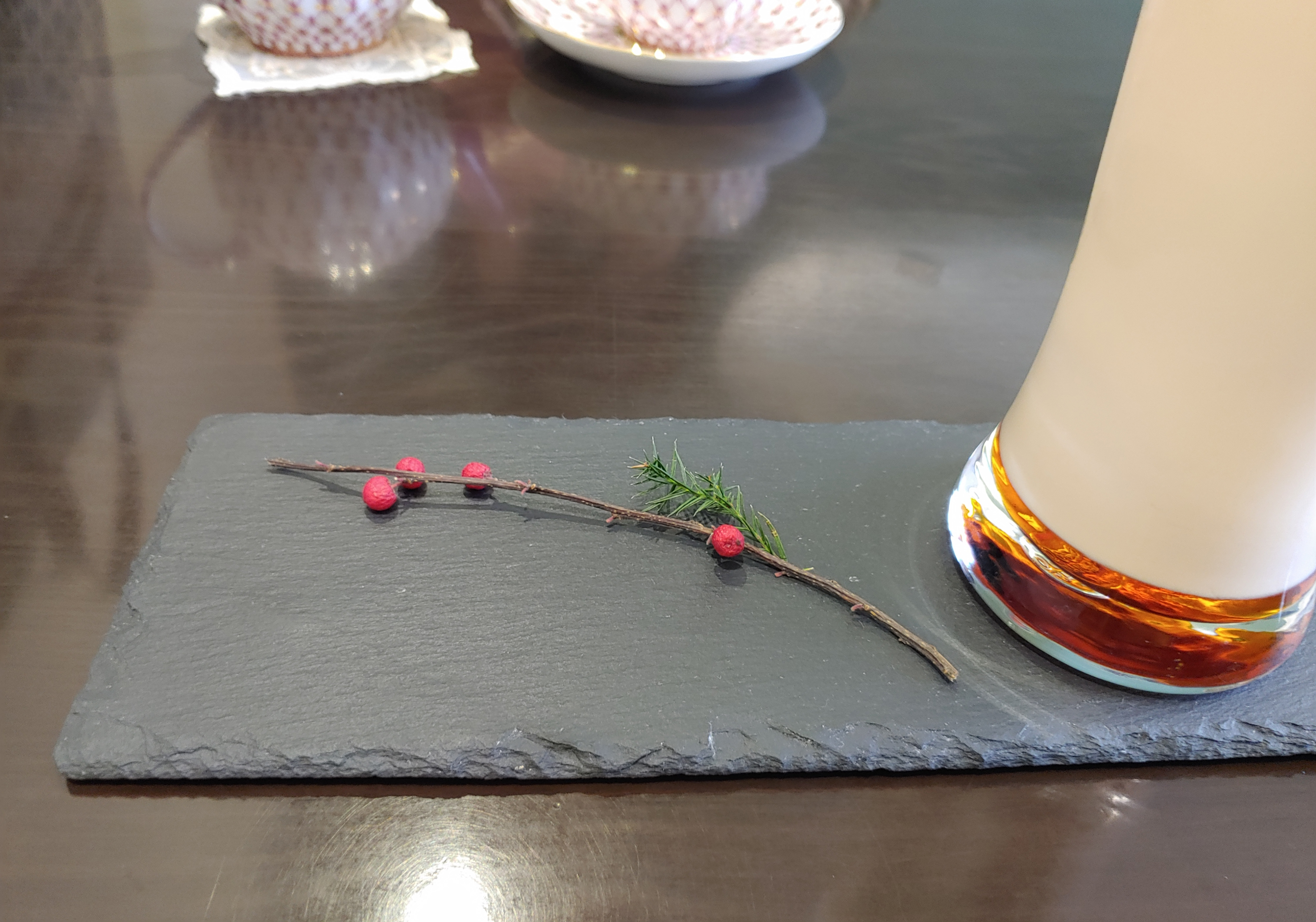 차와 함께 겨울과 어울리는 식물 한 가지를 올려두어, 제 감성도 살짝 전환시켜주는 기분~