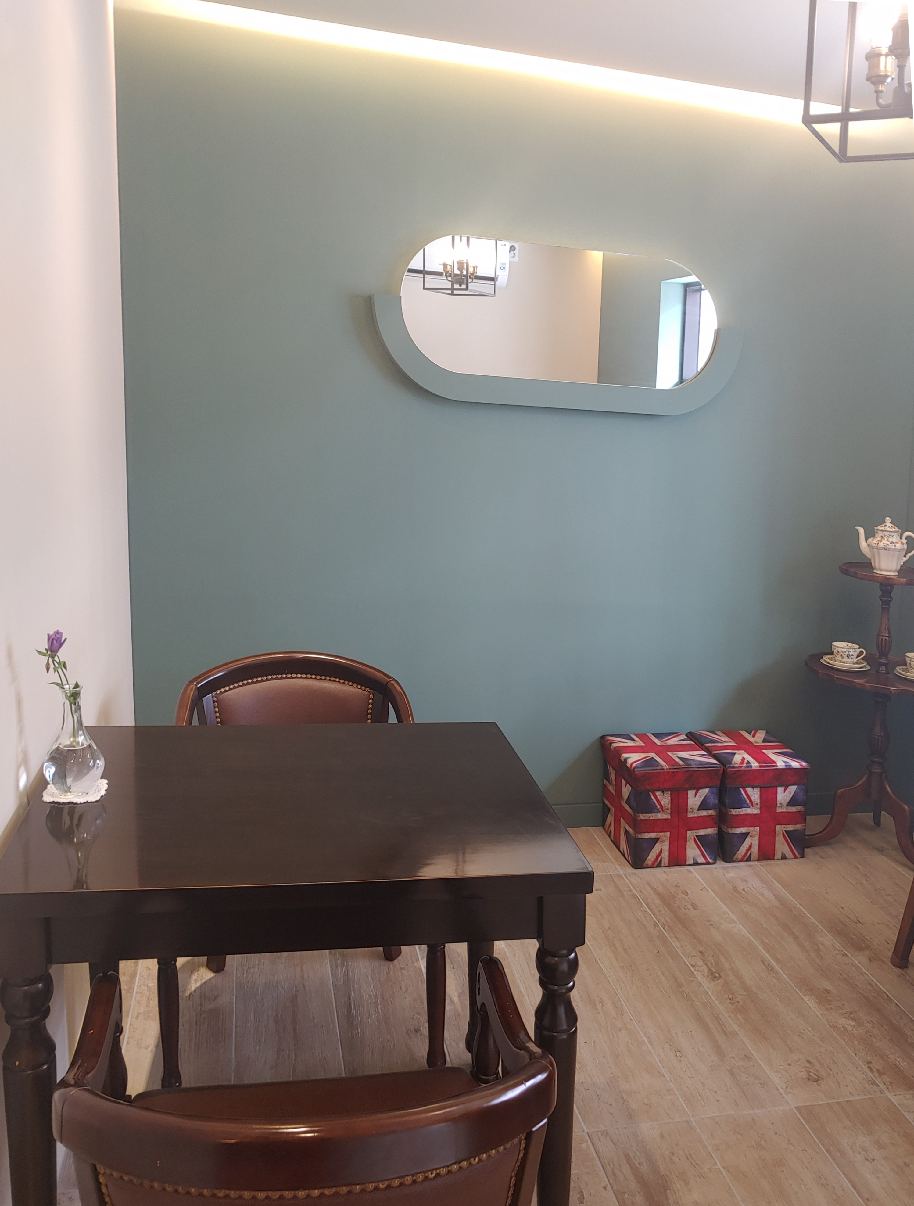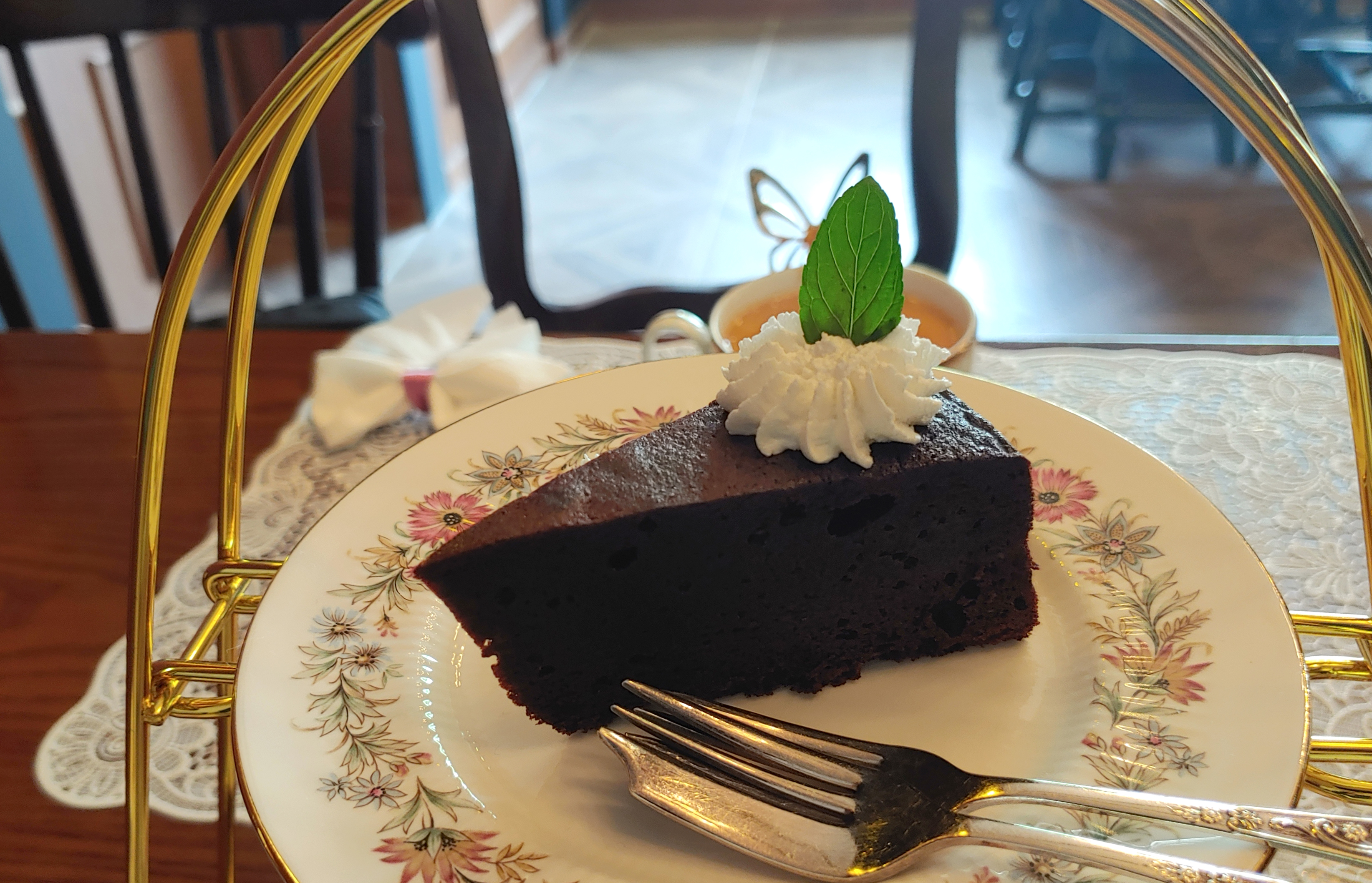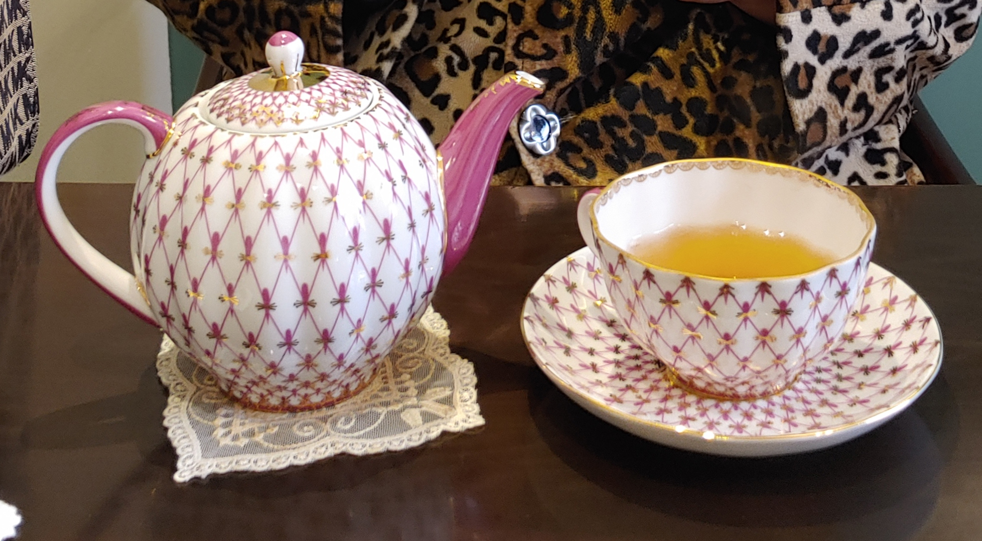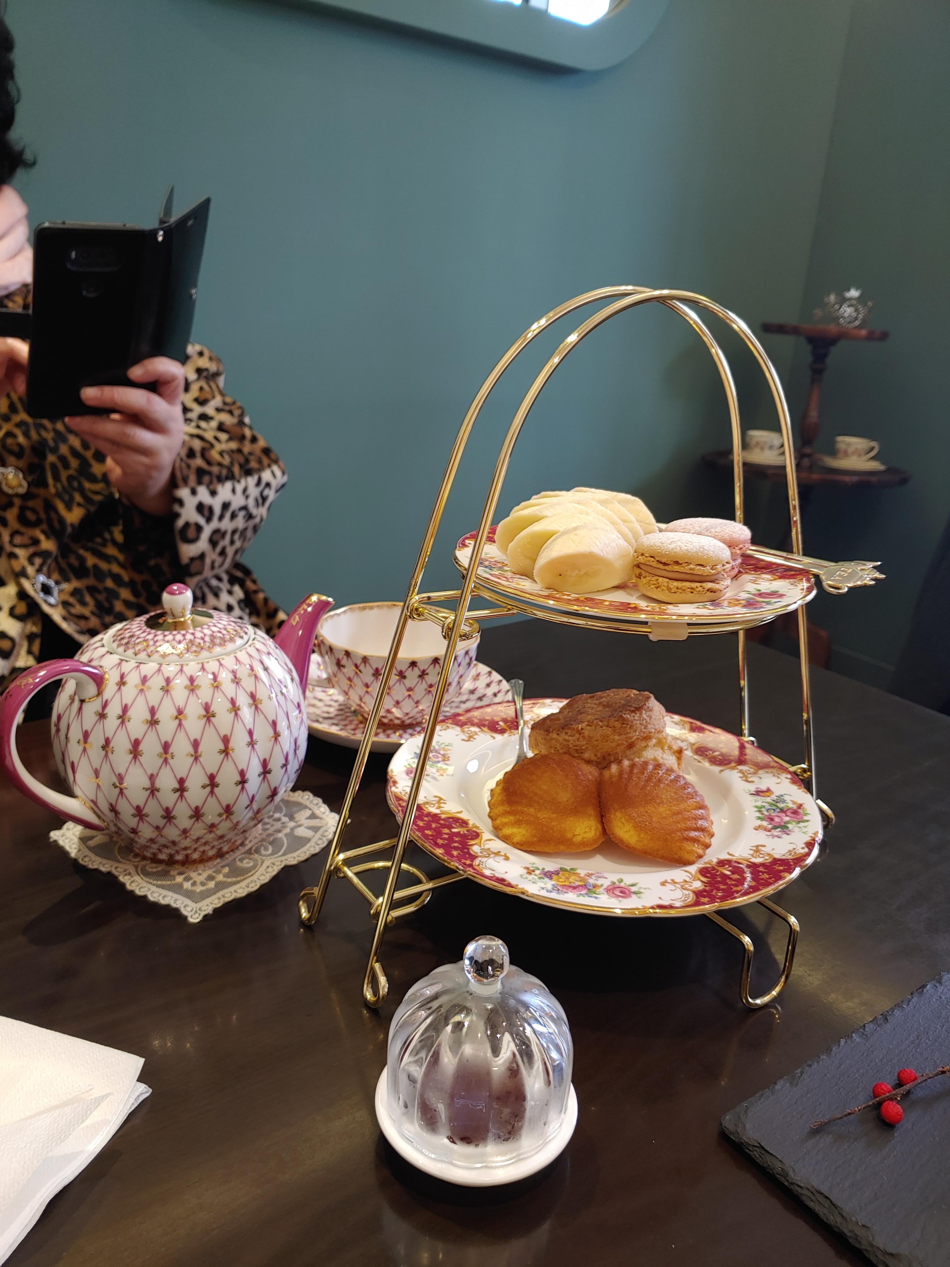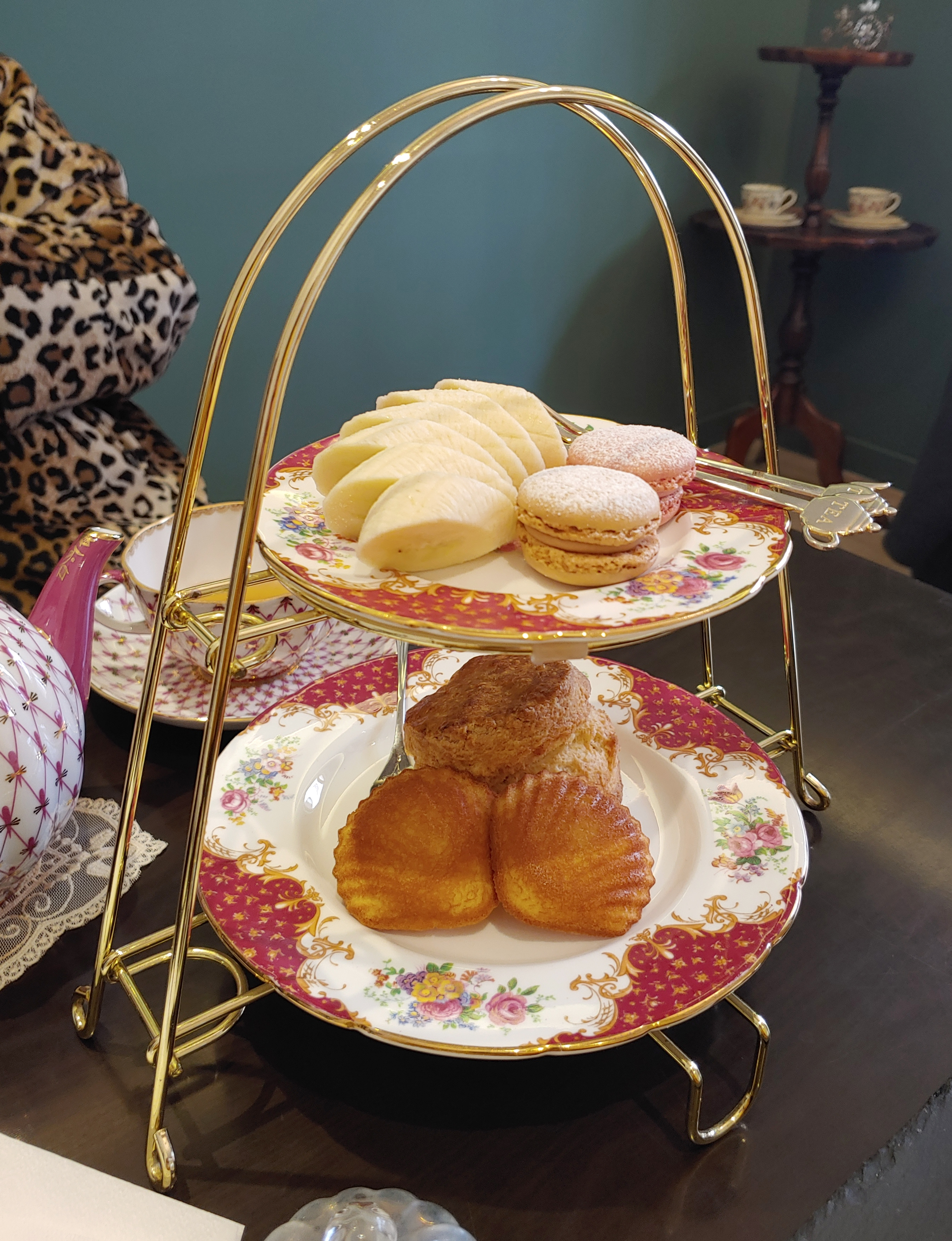 (저희 어머니의 호피 무늬 코트와 어머니께서 고르신 티팟 세트와 에프터눈티 세트의 접시들이 하나같이 다 화려하네요. 주인분께서도 왠지 일부러 더 화려한 접시로 준비해 주신 것 같아요.)