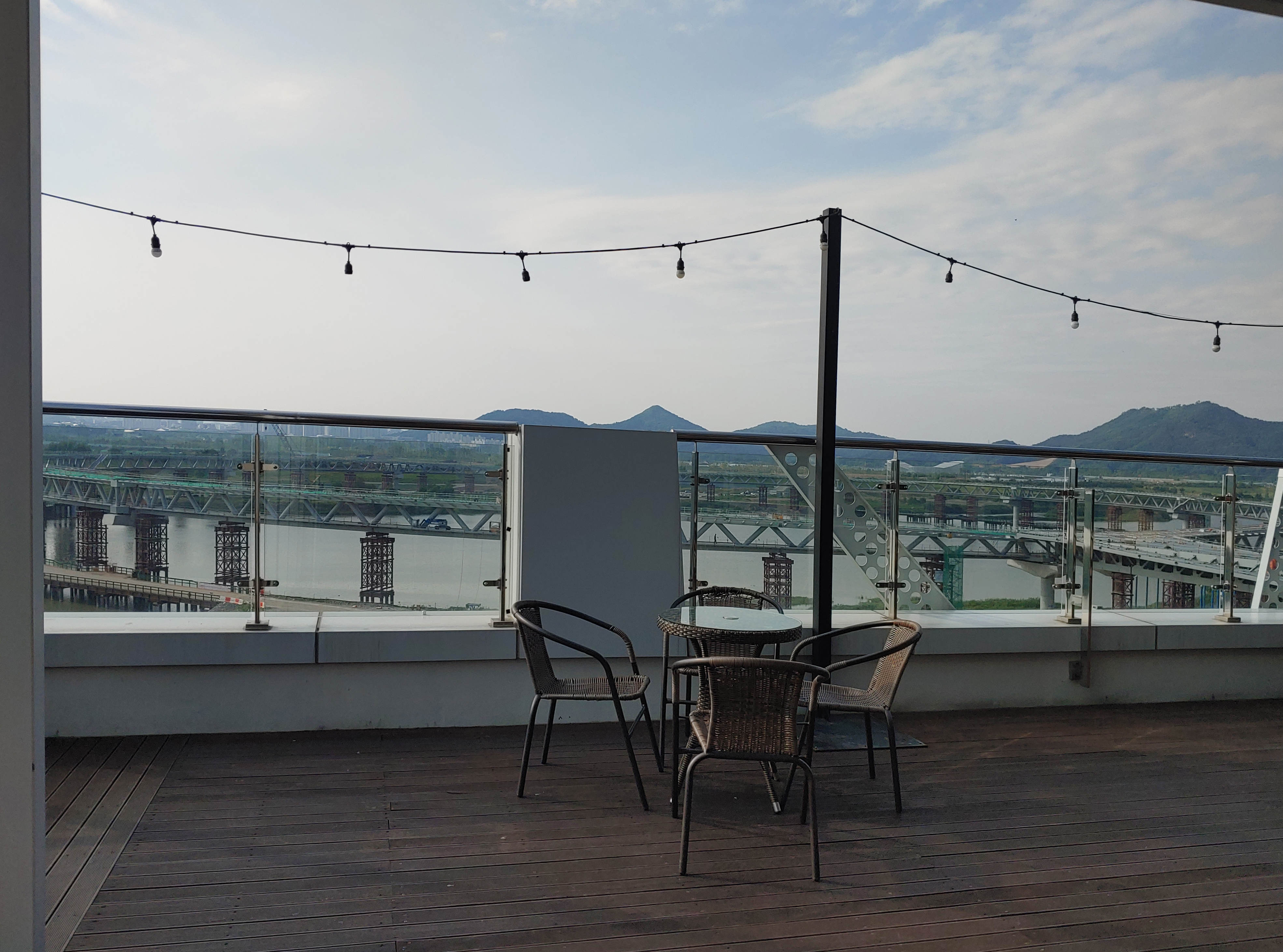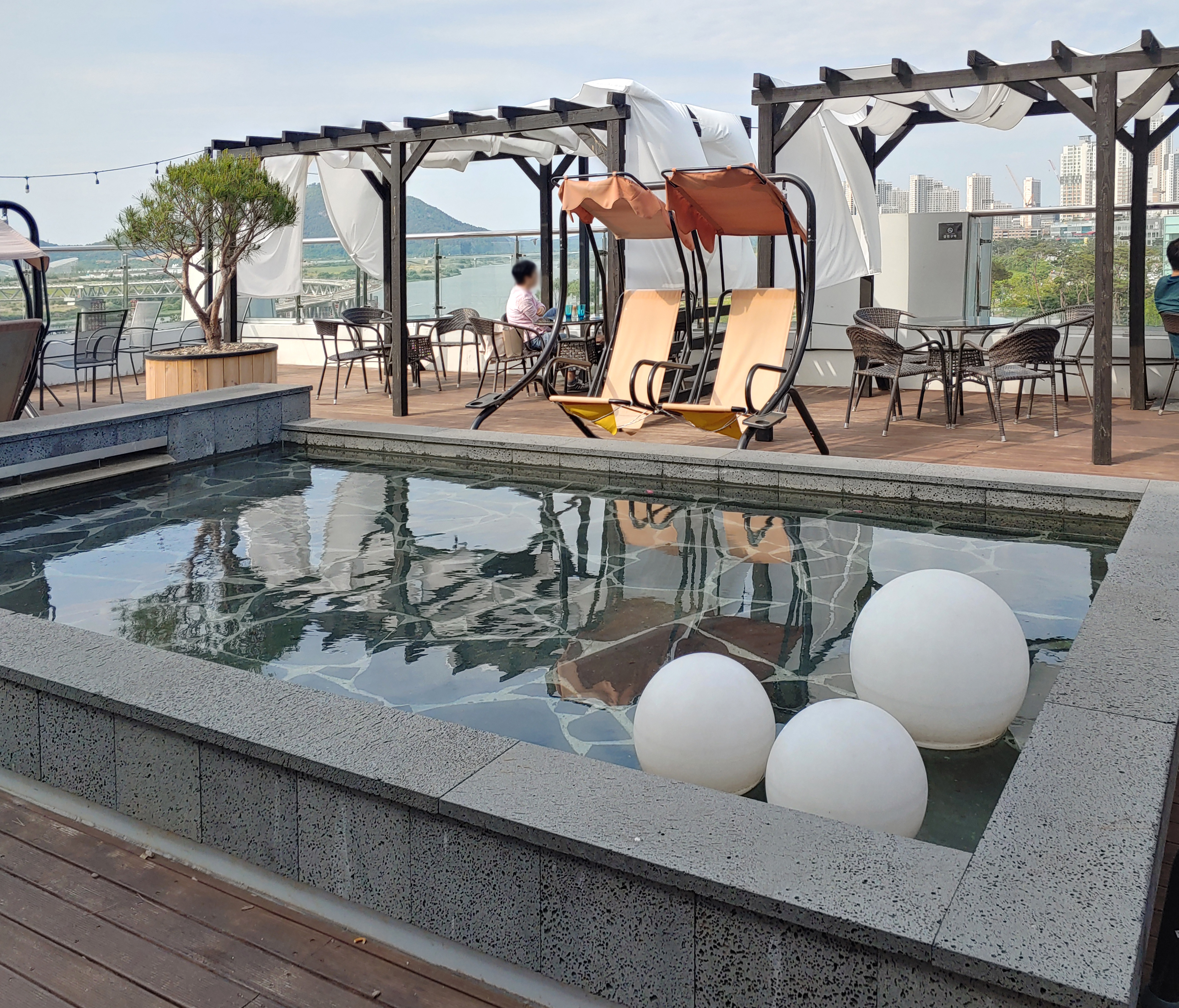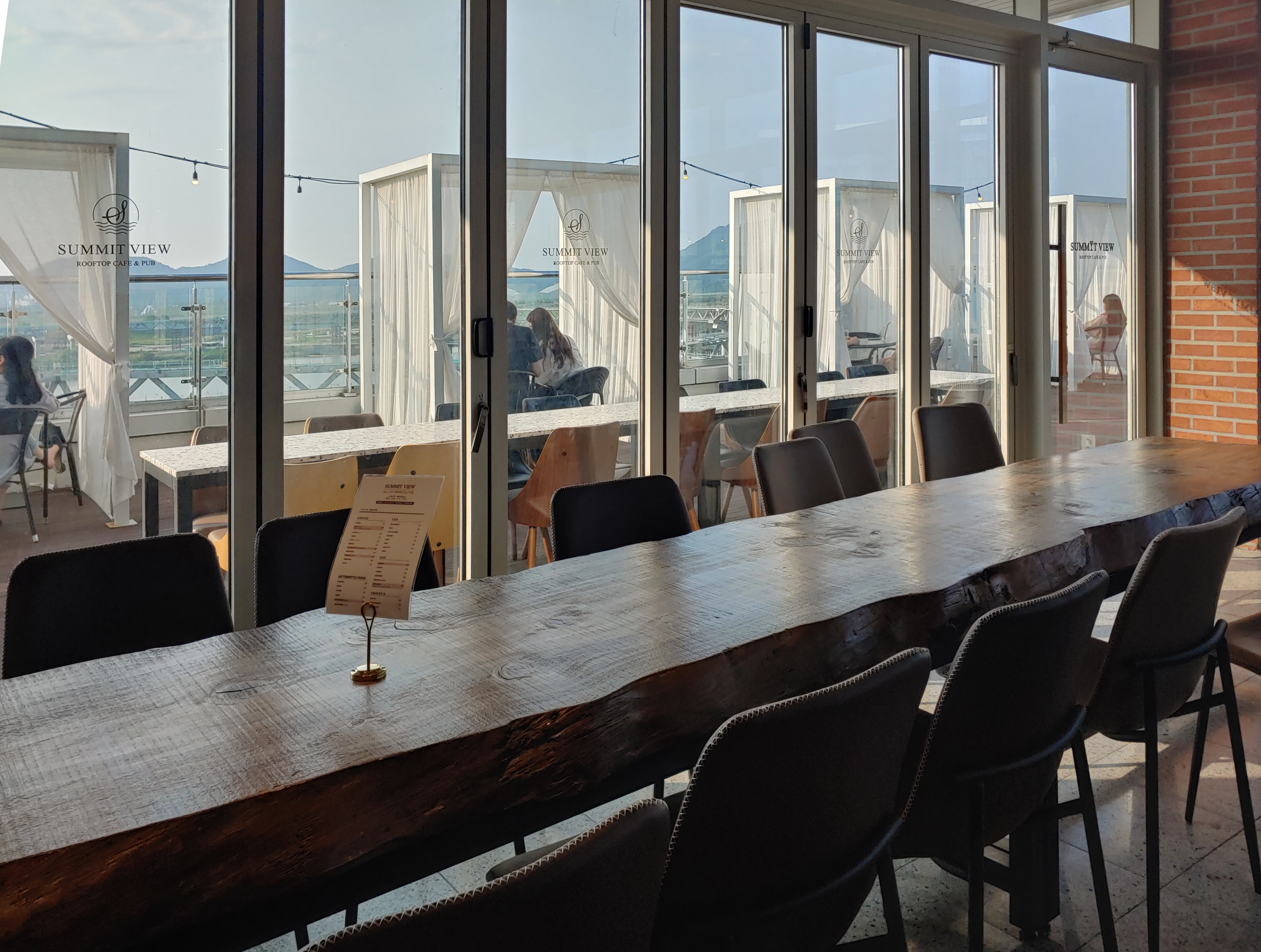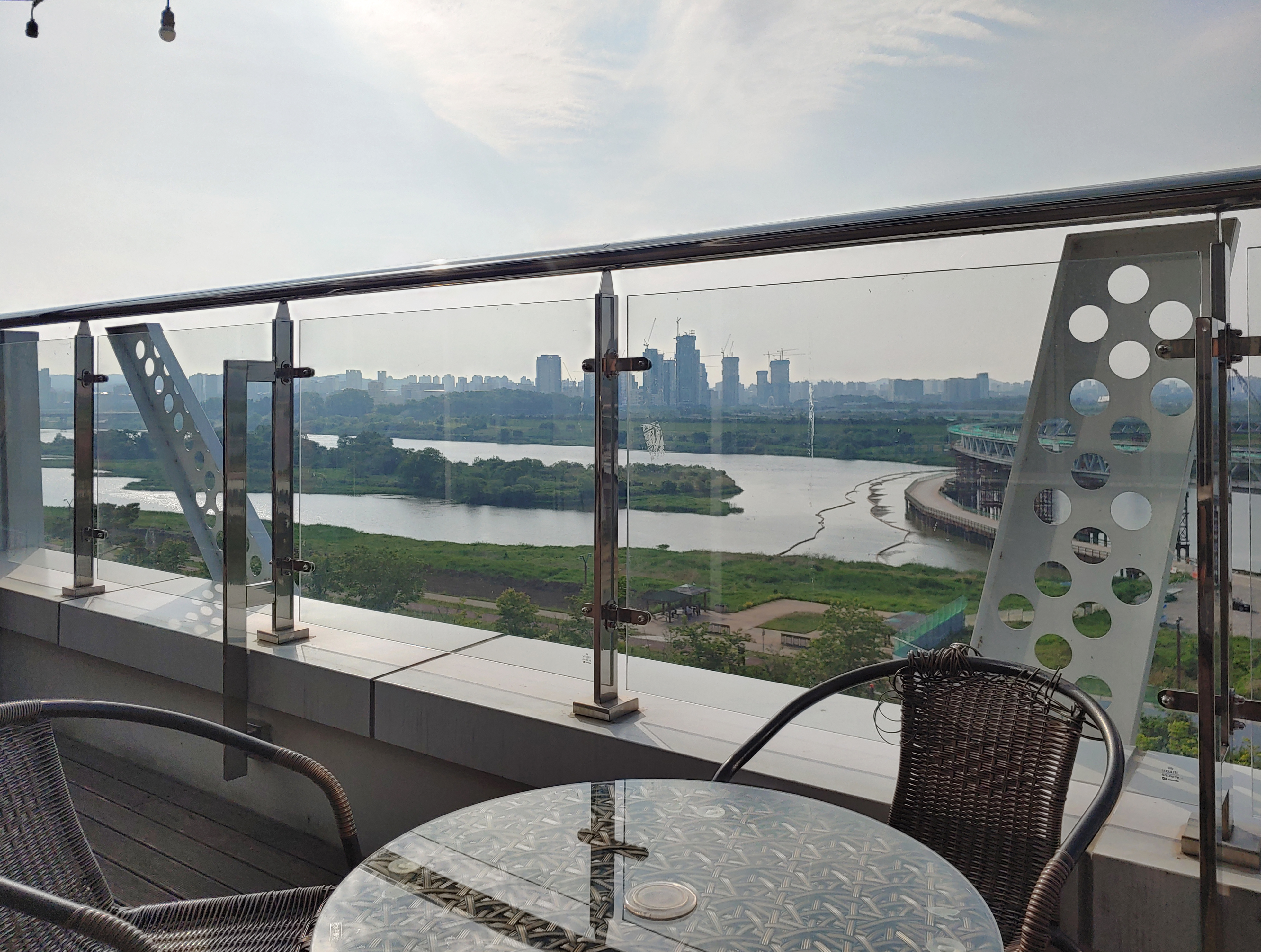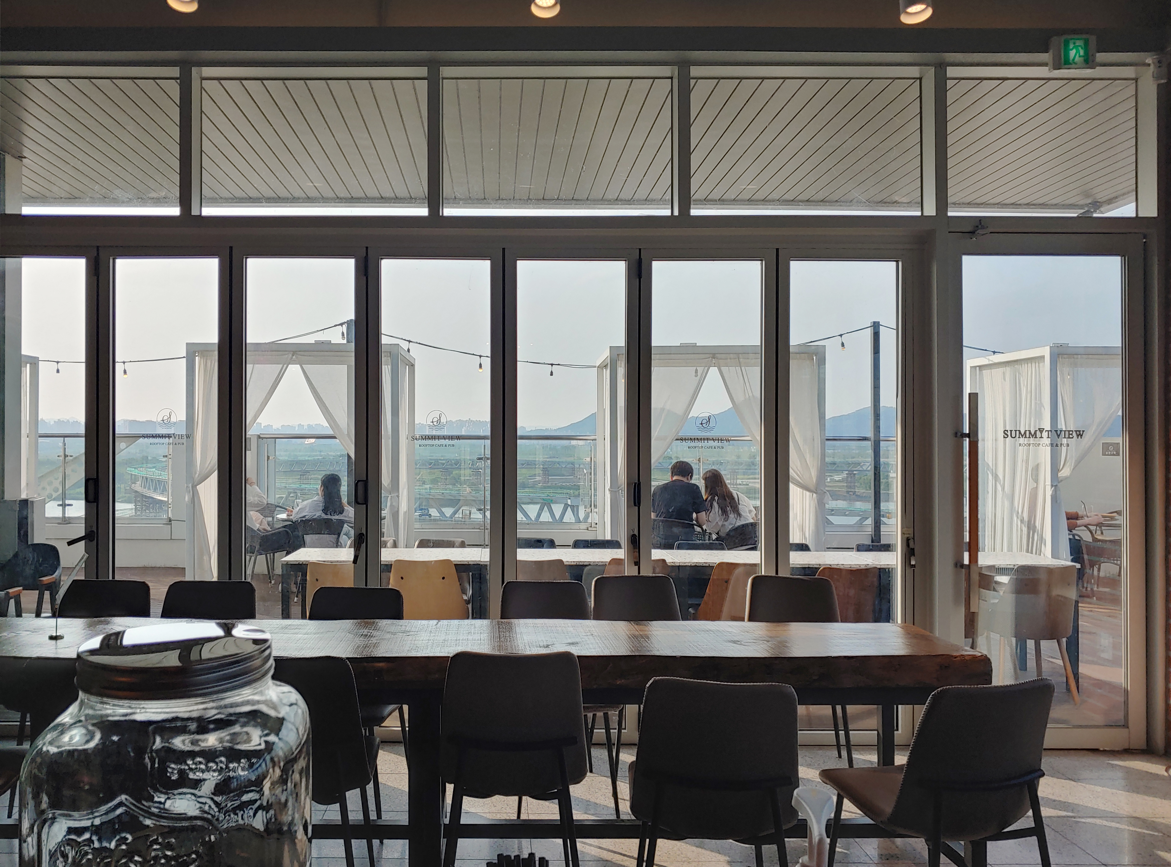 제가 보기에도 천이 살짝 흔들리며 빛도 예쁘고 한강뷰도 보이는 저 야외 테이블이 제일 좋아 보였어요.