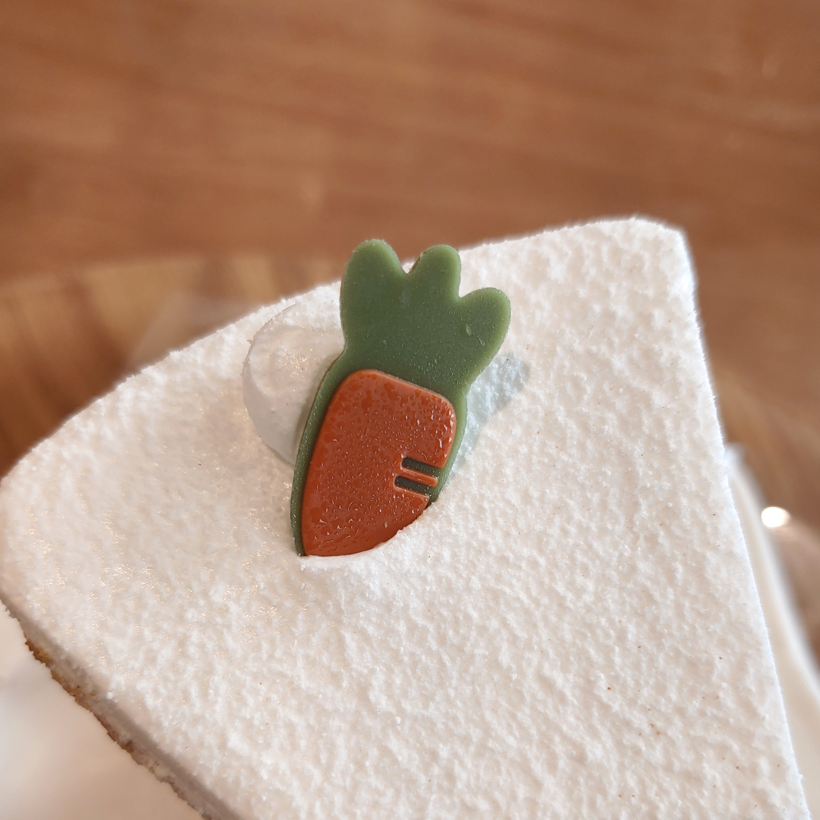 당근 케이크 위에 올려져 있는 작은 당근 초콜릿은, 마치 땅에 묻힌 듯이 있길래 넘 귀여워서 사진으로 남겨놨어요.