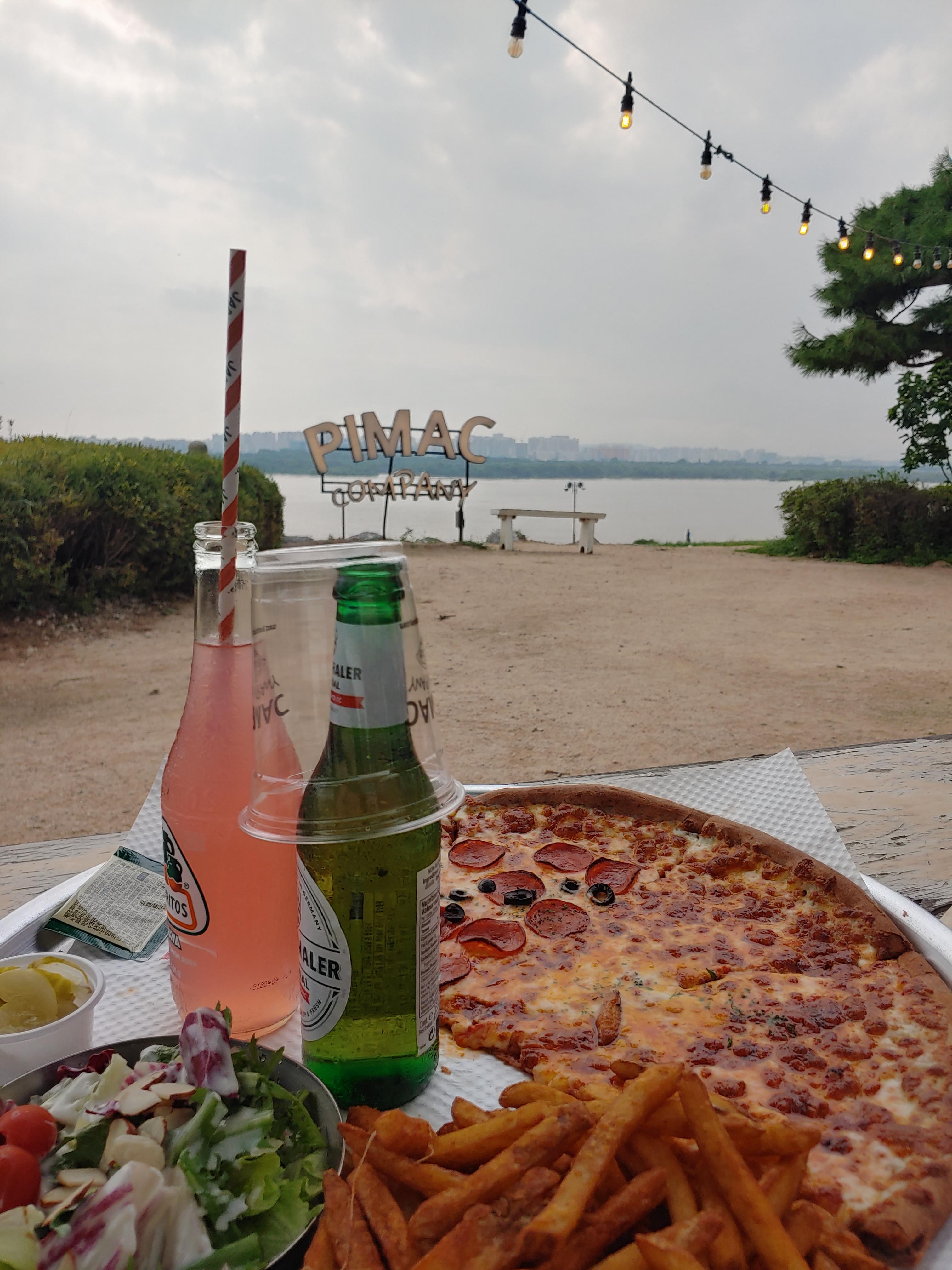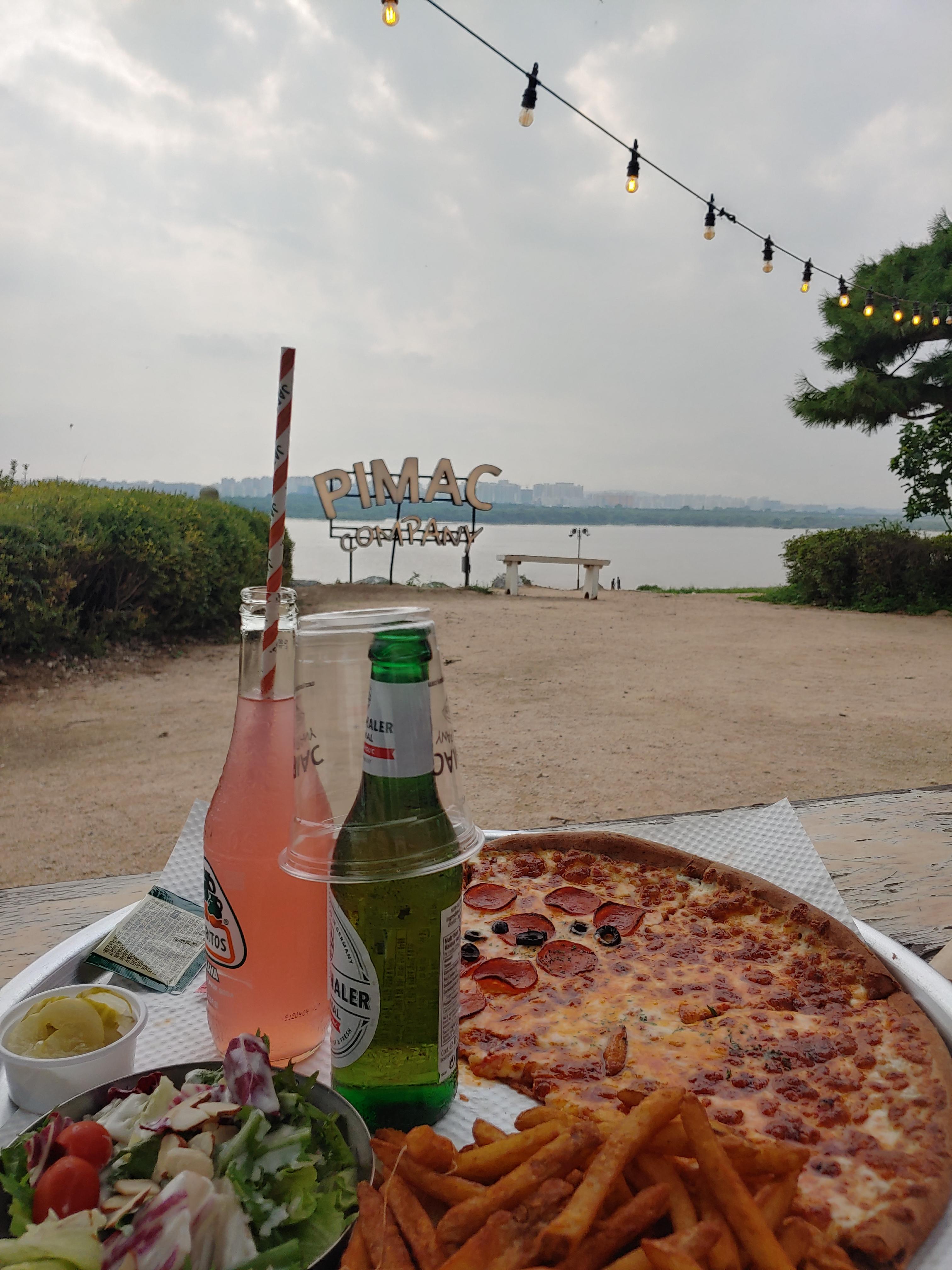 여기 한강 노을을 보면서 피자와 맥주 마시는 게 소원이라면 작은 소원이었어요.