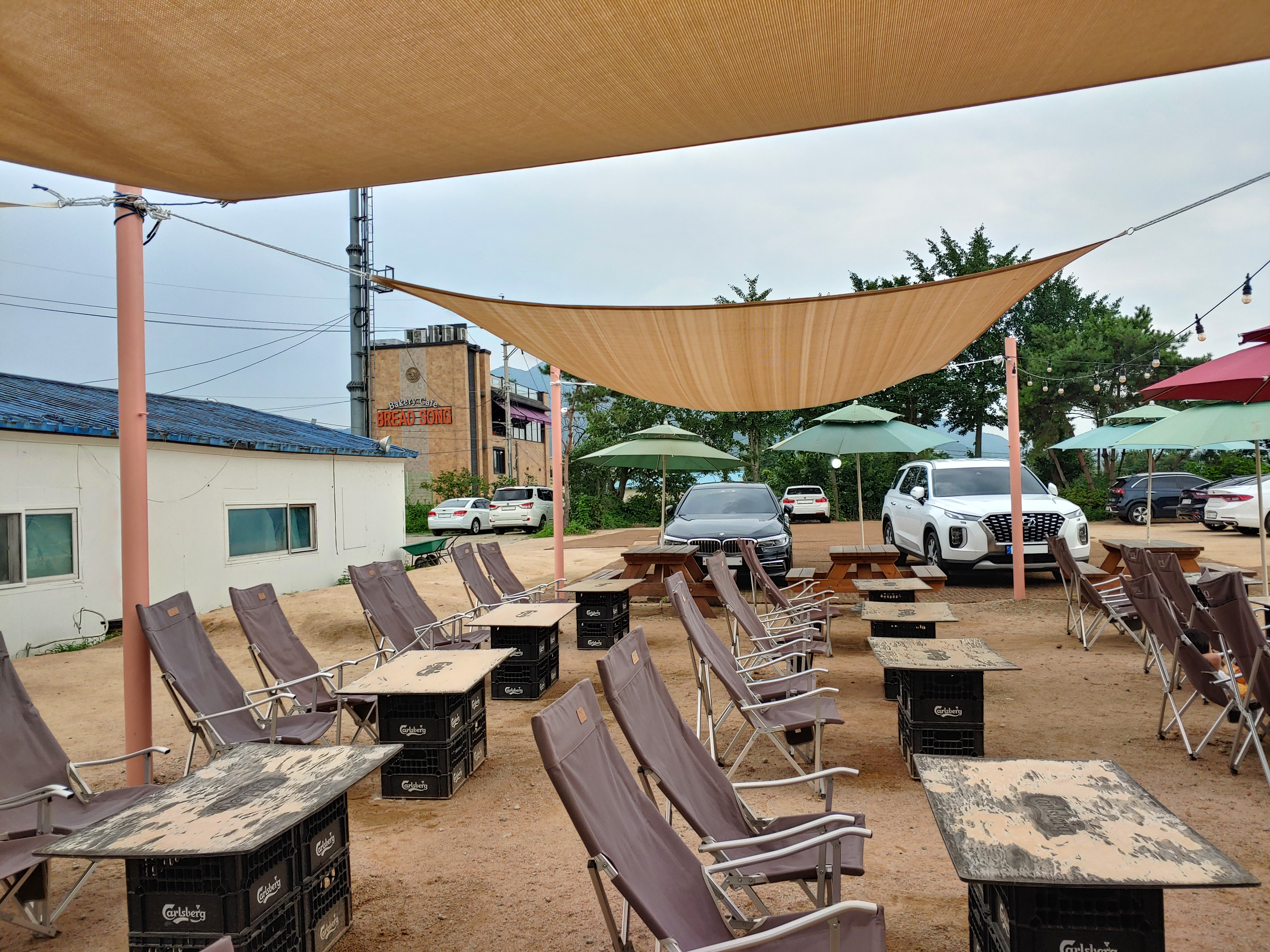 야외 자리는 이렇게 두 파트로 나눠지는데, 사진 기준으로 오른쪽이 흰색 의자쪽, 왼쪽이 하늘색 의자쪽이에요.