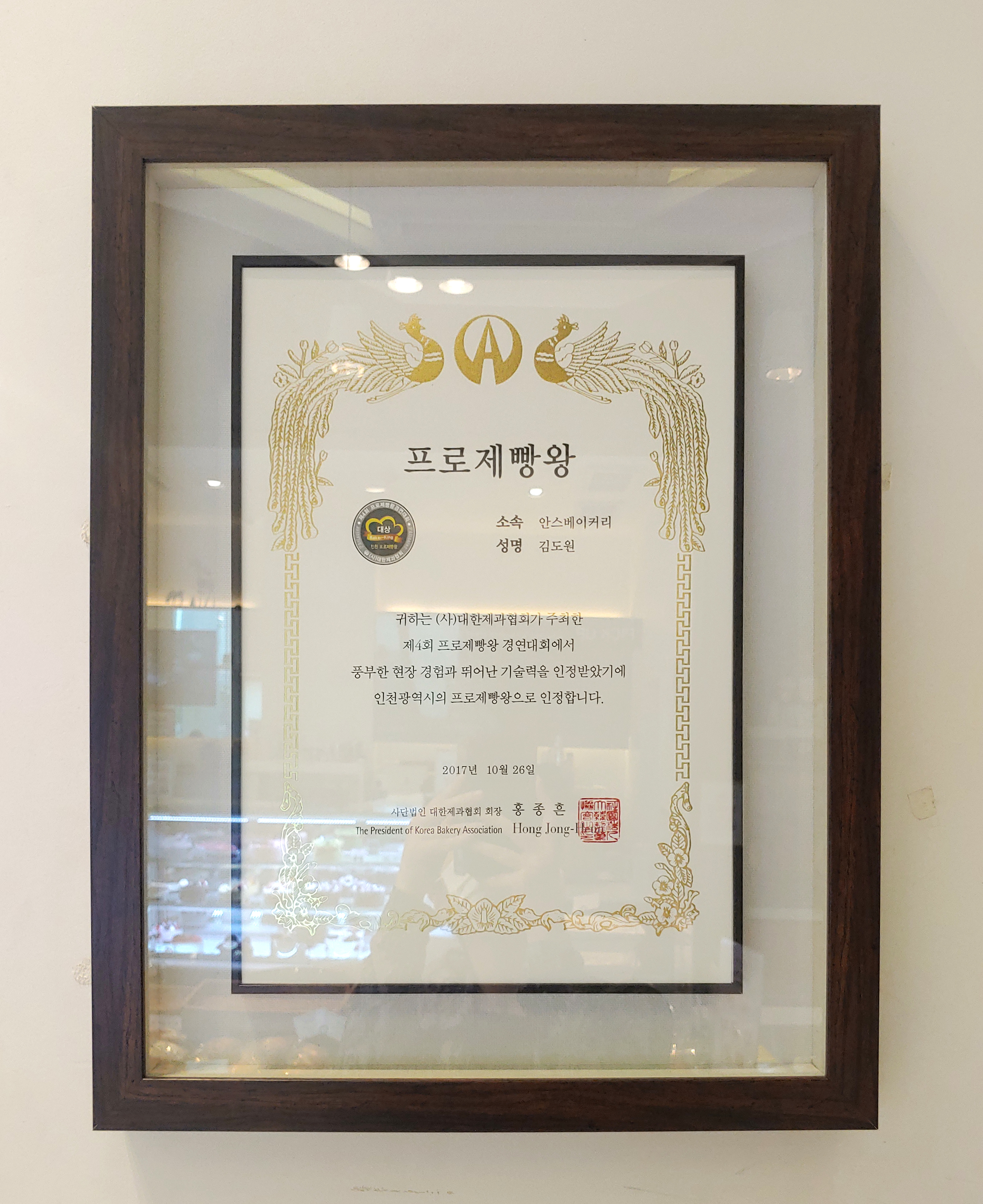 '프로제빵왕' 을 인정하는 표창장이 매우! 잘보입니다.