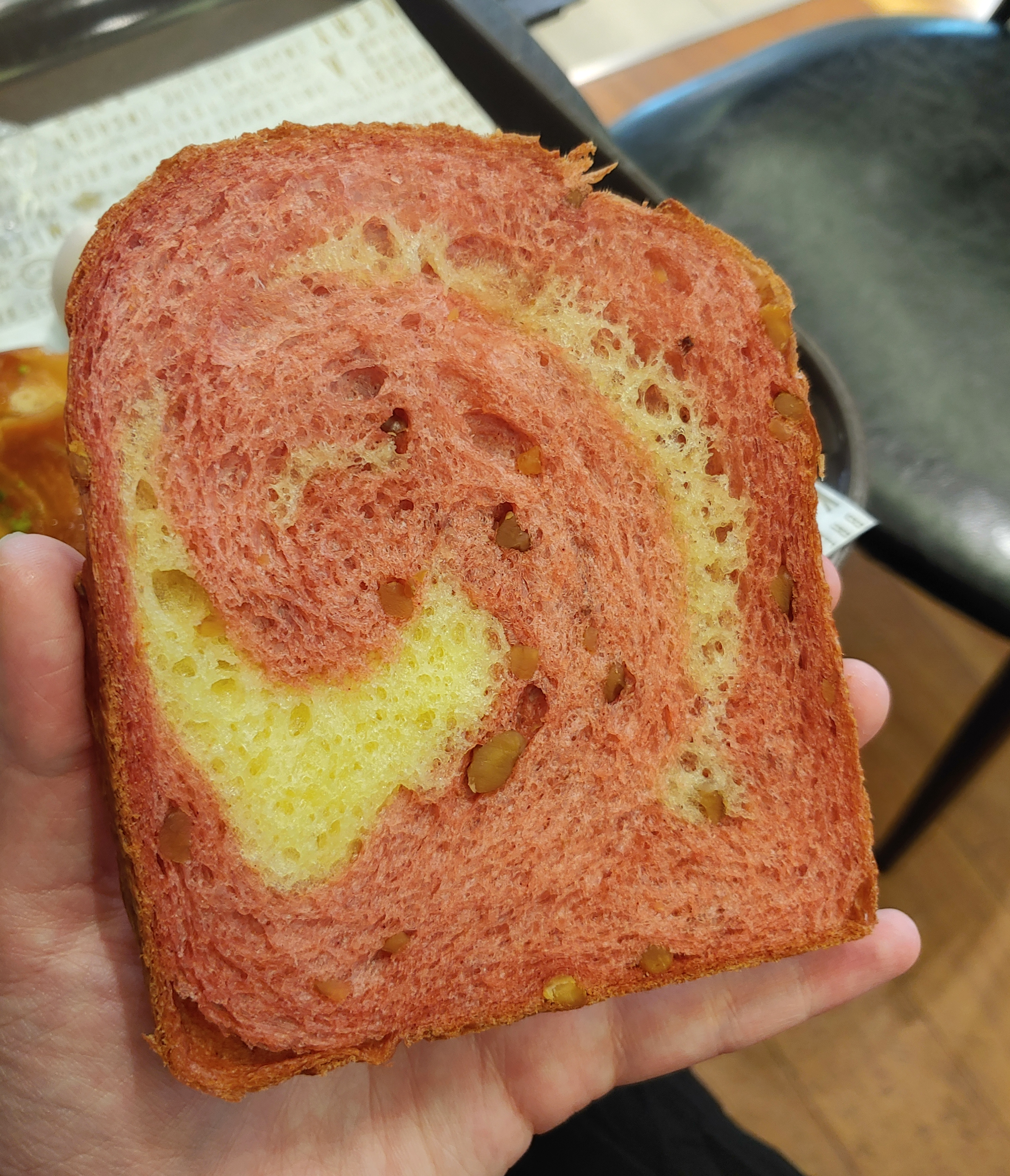 그리고 제일 감동적이었던 홍국쌀 식빵. 처음에 홍국쌀 식빵이 가지런히 잘라진 걸 하나 꺼냈을 땐 깜짝 놀랬어요. 맛있어 보이지 않았거든요......식빵의 고유의 식감을 좋아하는 저에게 컬러는 조금 생소하고 놀라웠어요.