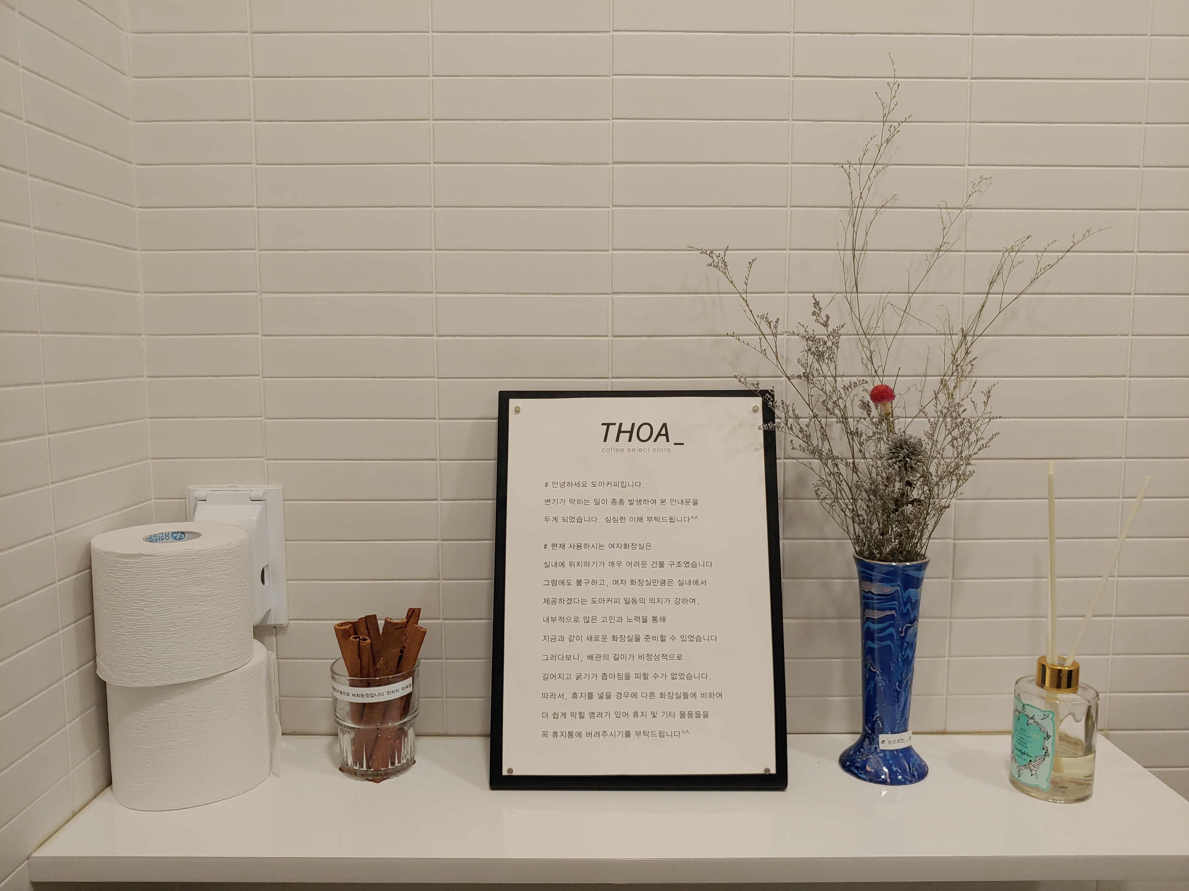 짤막하게 여자 화장실에 대한 주의 글이 있었는데, 본래 카페 내부에 화장실을 설치할 수 없는 구조임에도 불구하고 여자 화장실 만큼은 실내에 제공하겠다는 의지로 만들어 진 곳이라고 합니다.
