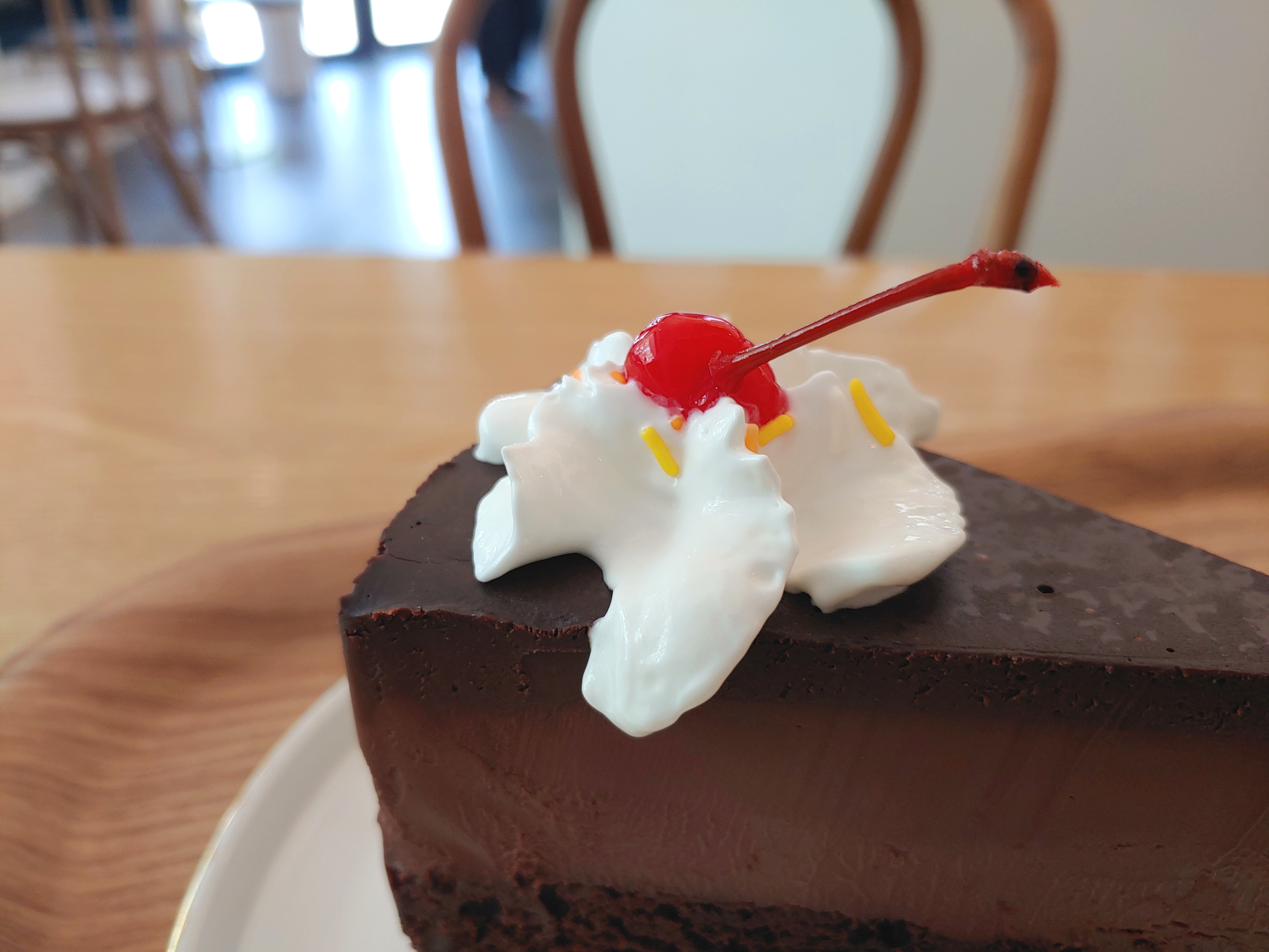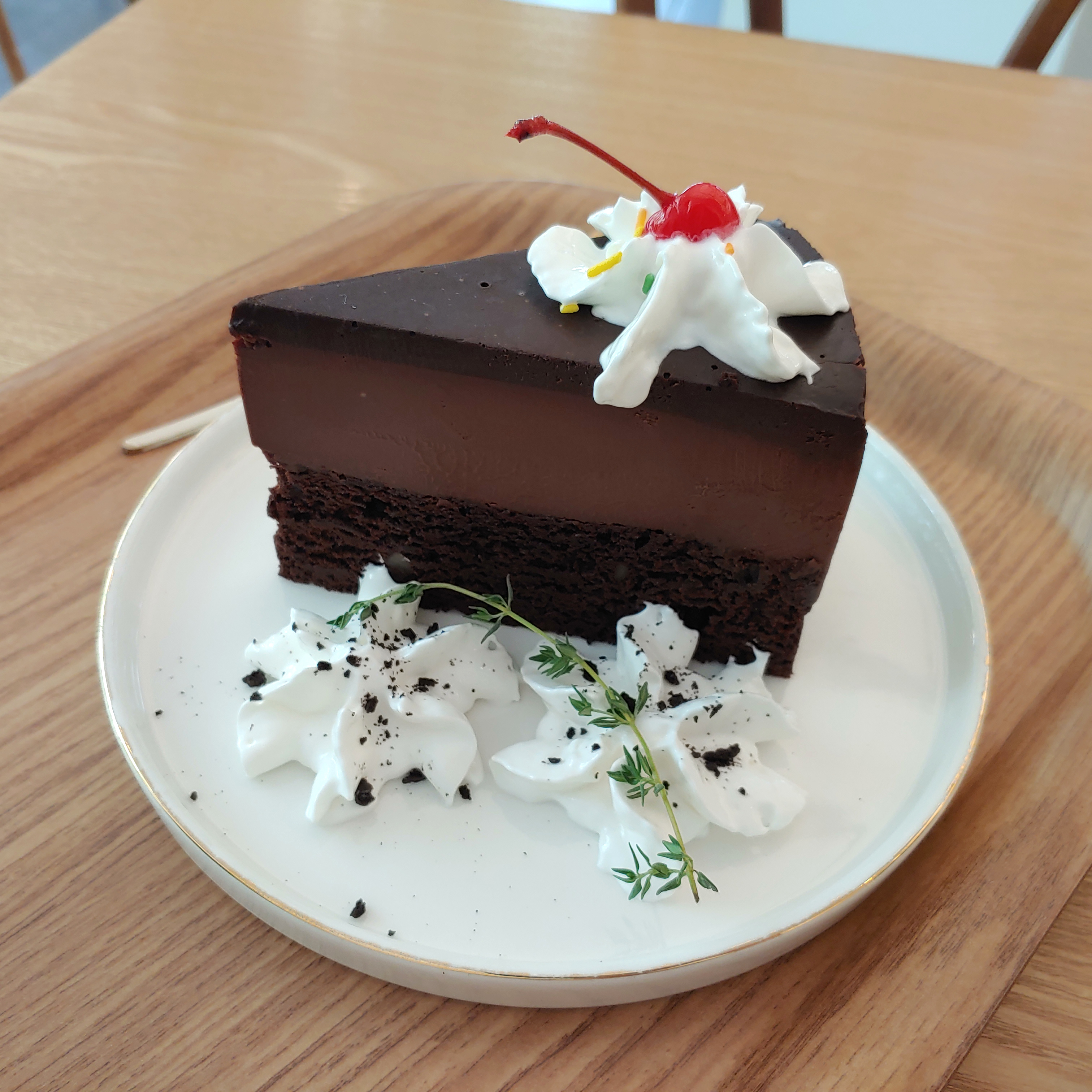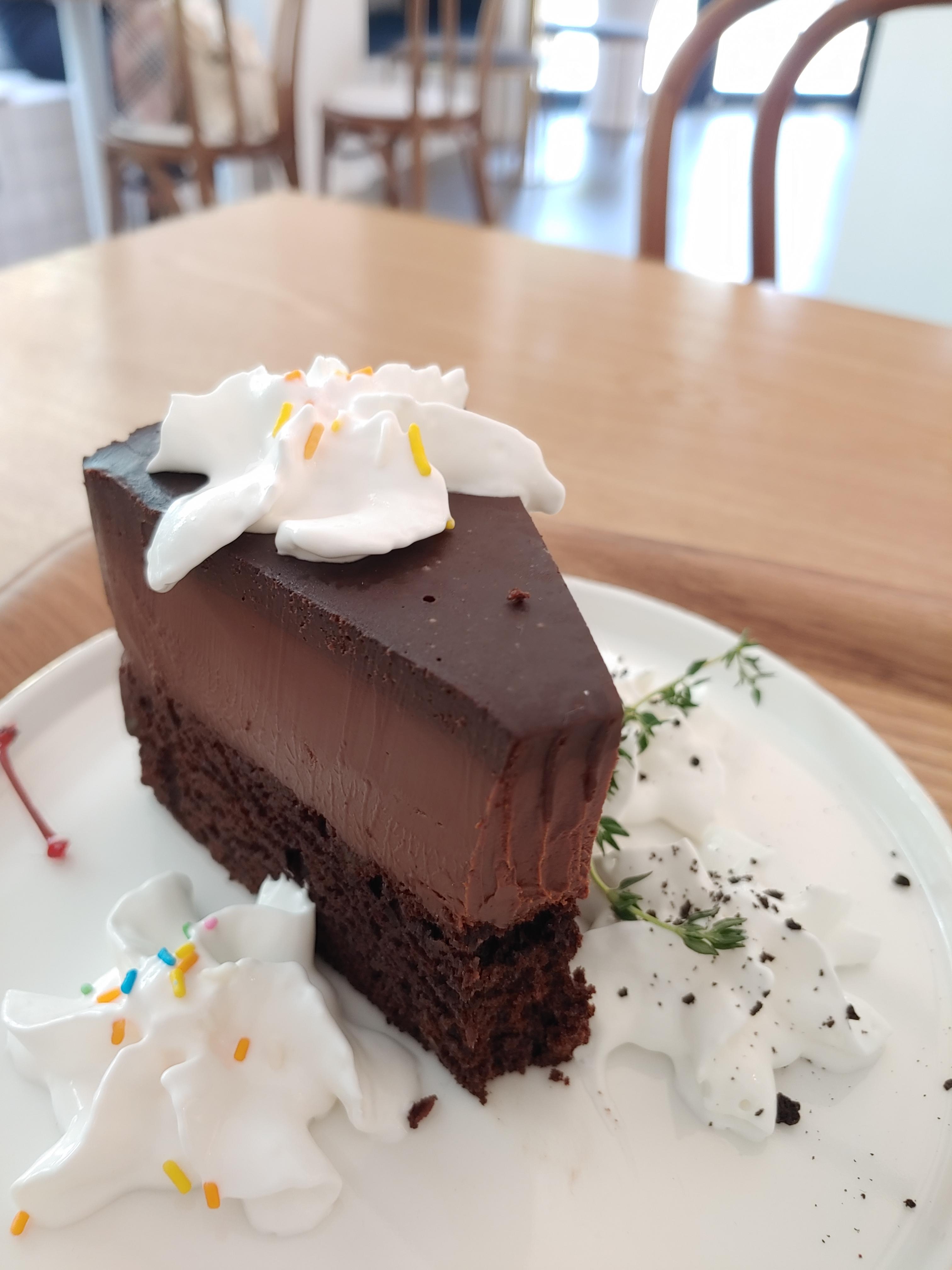 분명 단순한 초콜릿 브라우니 케이크였는데, 생크림 몇 개 올려주셨더니 더 먹기 좋은, 예쁜 케이크가 되었어요.