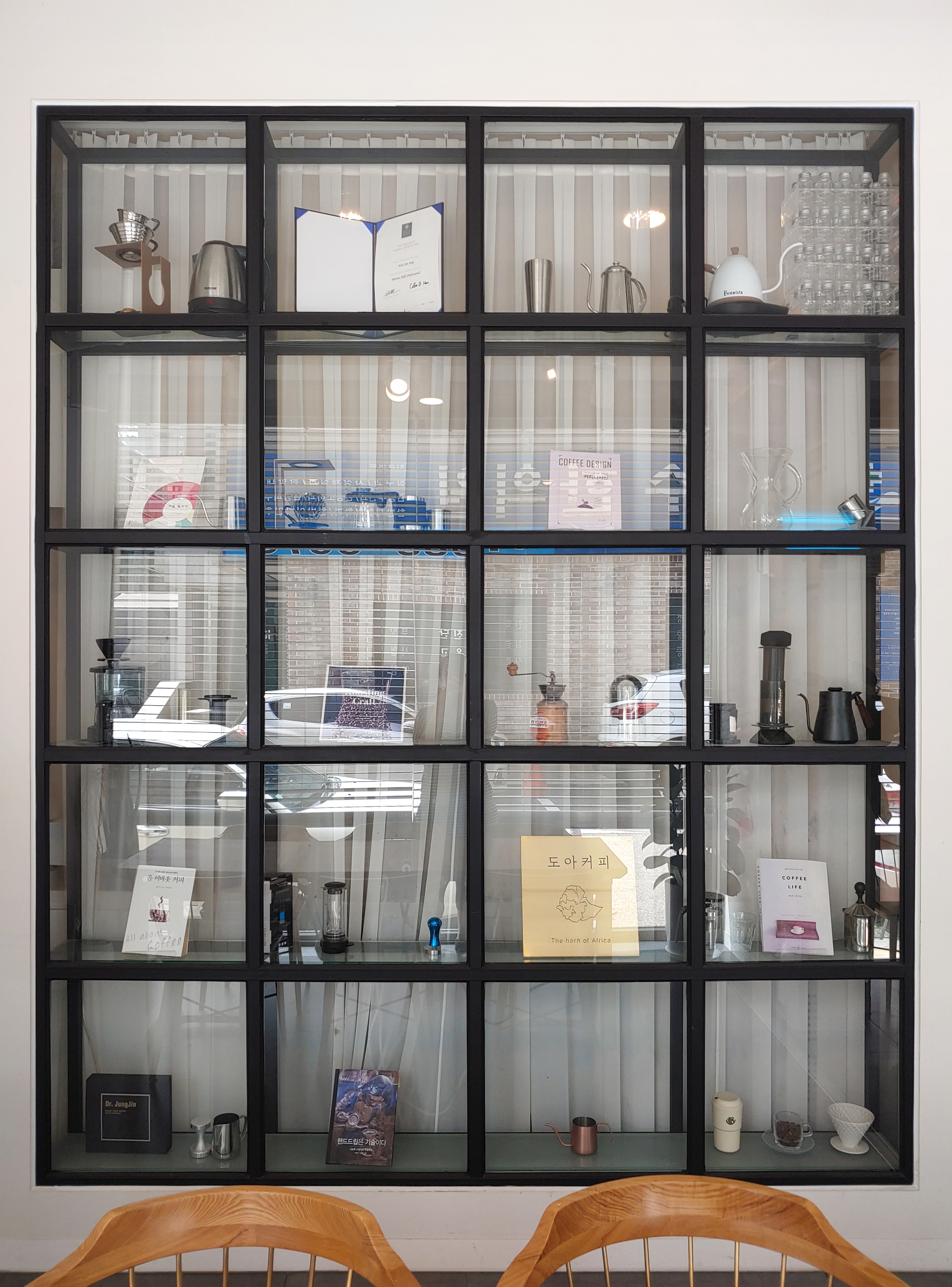 단체석 공간에서 한쪽은 전시 공간처럼 도아 커피의 매력을 느낄 수 있는 소품이나 상장 같은 것이 있어요.