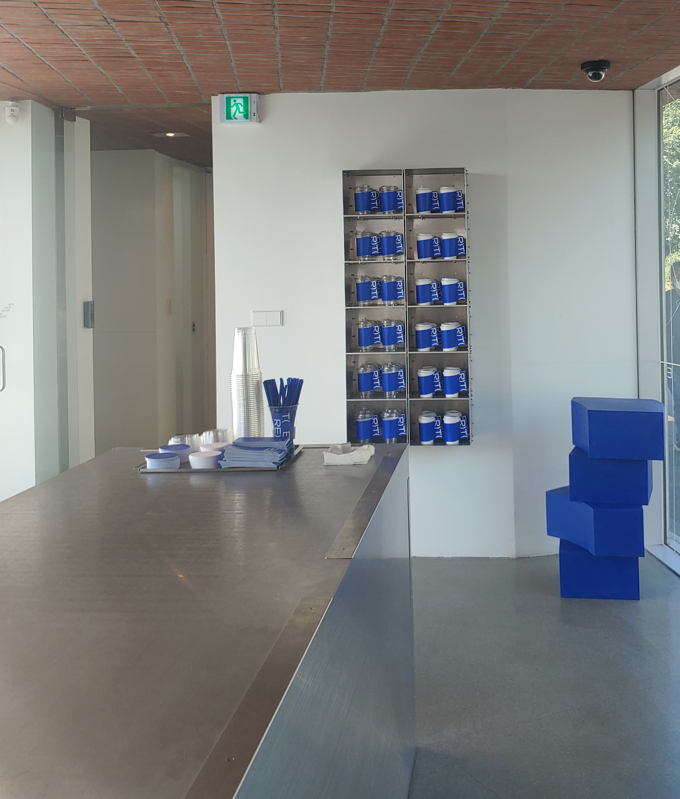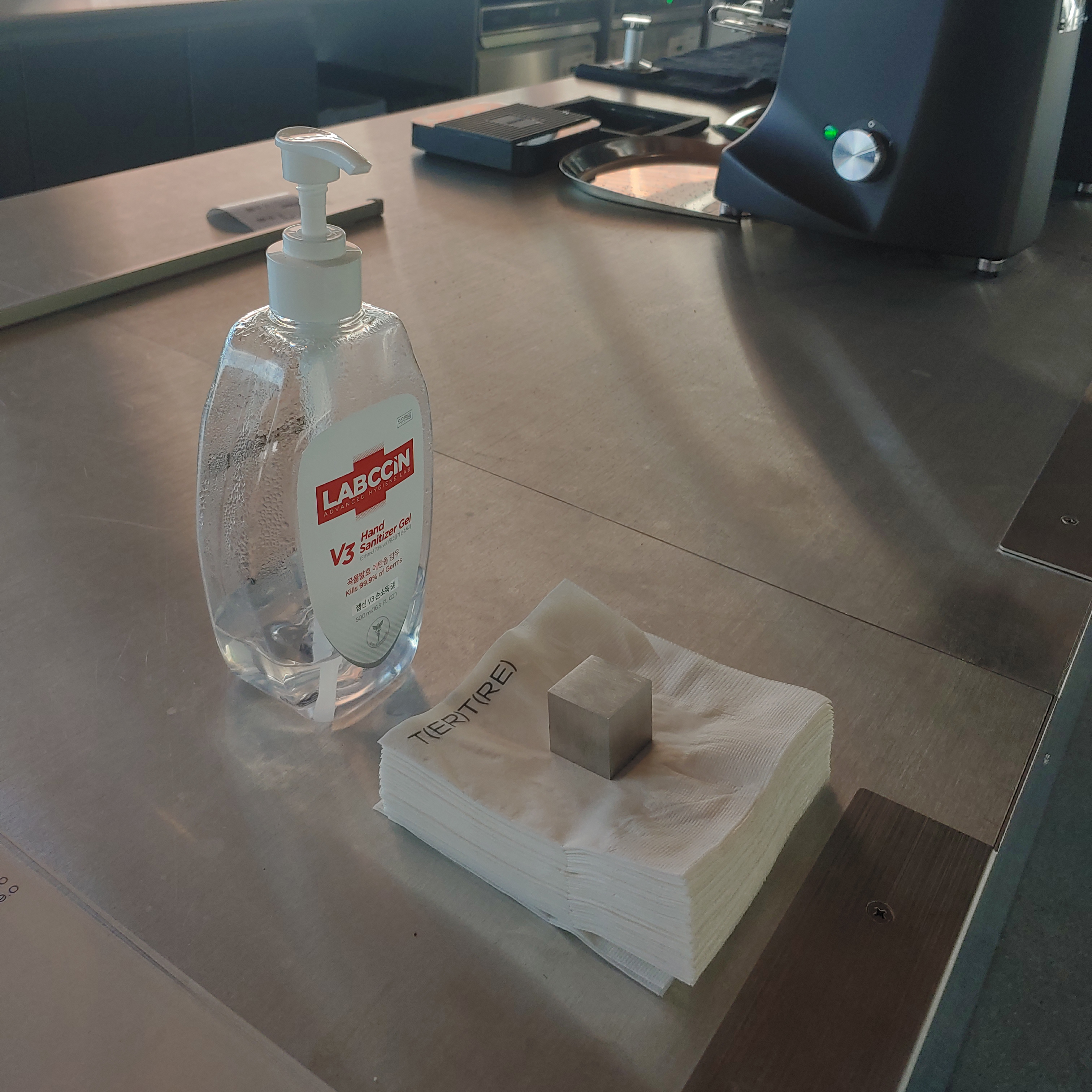 주문하는 하는 곳 바로 앞에 손 소독제와 냅킨이 준비되어 있었고, 다른 층으로 올라가는 입구쪽엔 파란색 포인트 컬러가 눈에 띄었습니다.