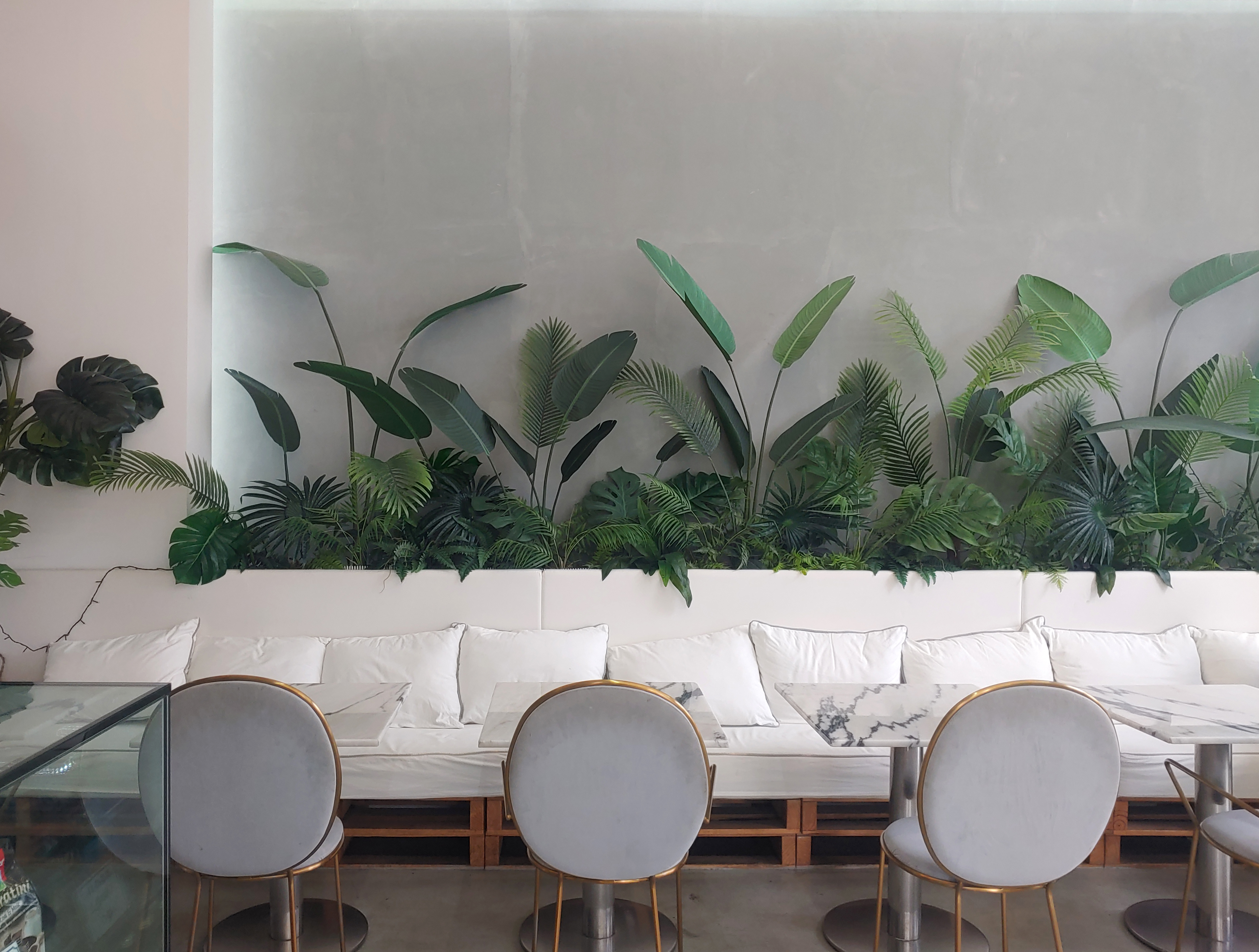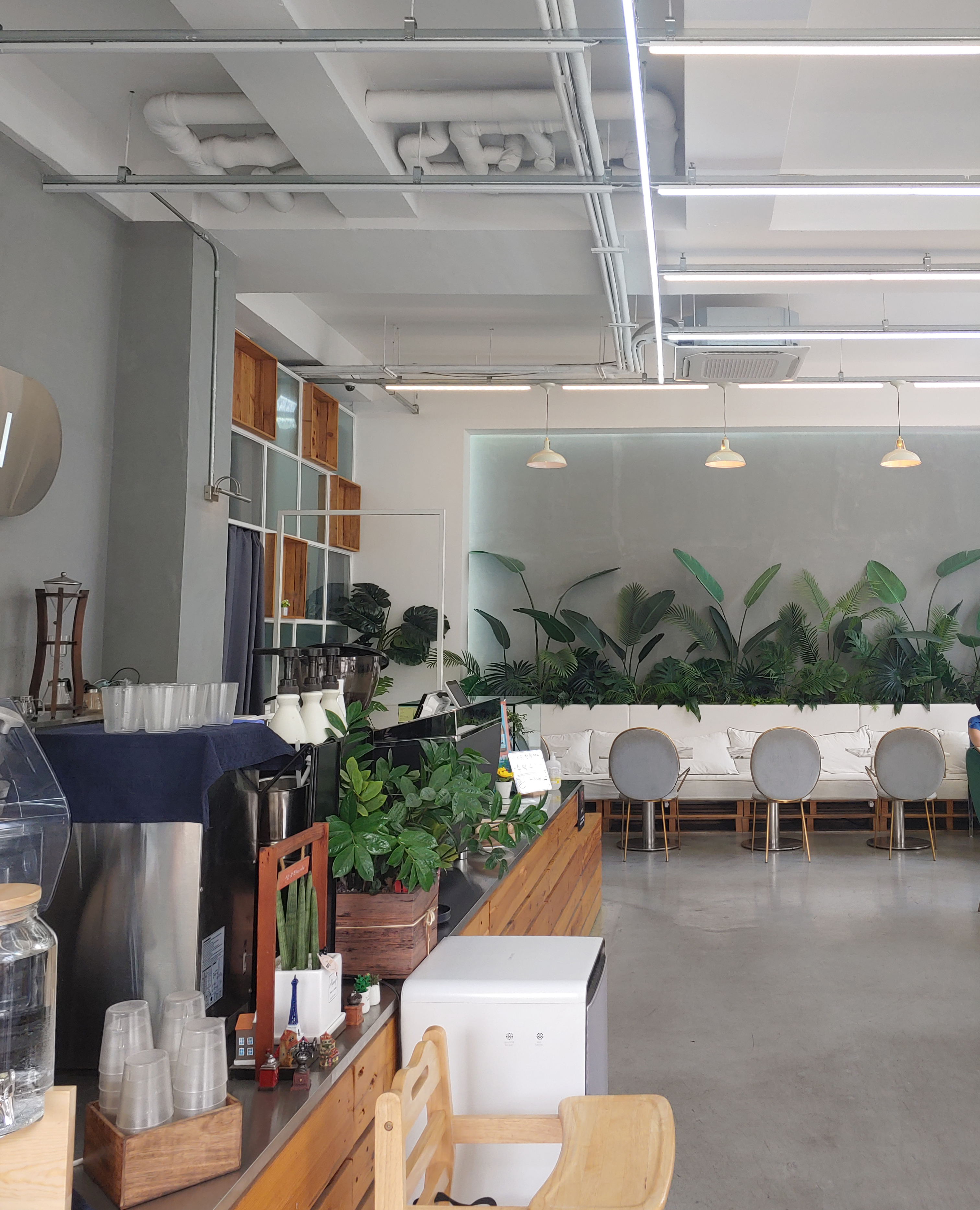인조 식물들이 인테리어 효과를 톡톡히 보이고 있어요. 실내 안쪽의 테이블은 채광은 부족하지만, 정면으로 사진 찍기엔 꽤 좋을 것 같은 위치였어요.