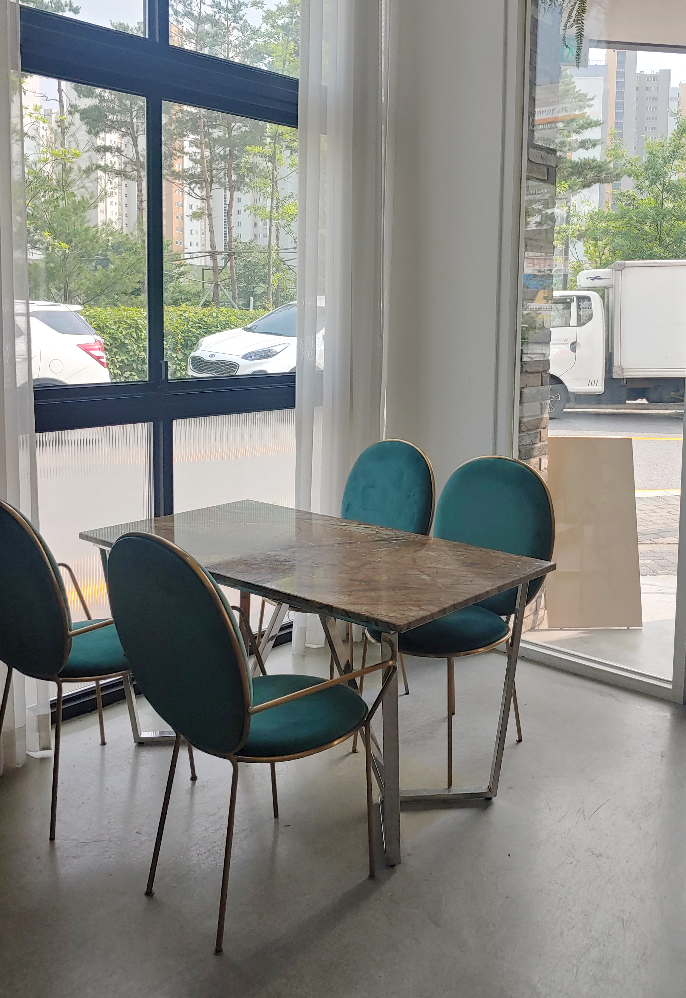 테이블과 의자(소파석 제외)는 컬러가 두가지. 그리고 같은 대리석 느낌의 테이블에 벨벳 재질의 의자는 모두 같은 종류로 배치되어 있었어요.
