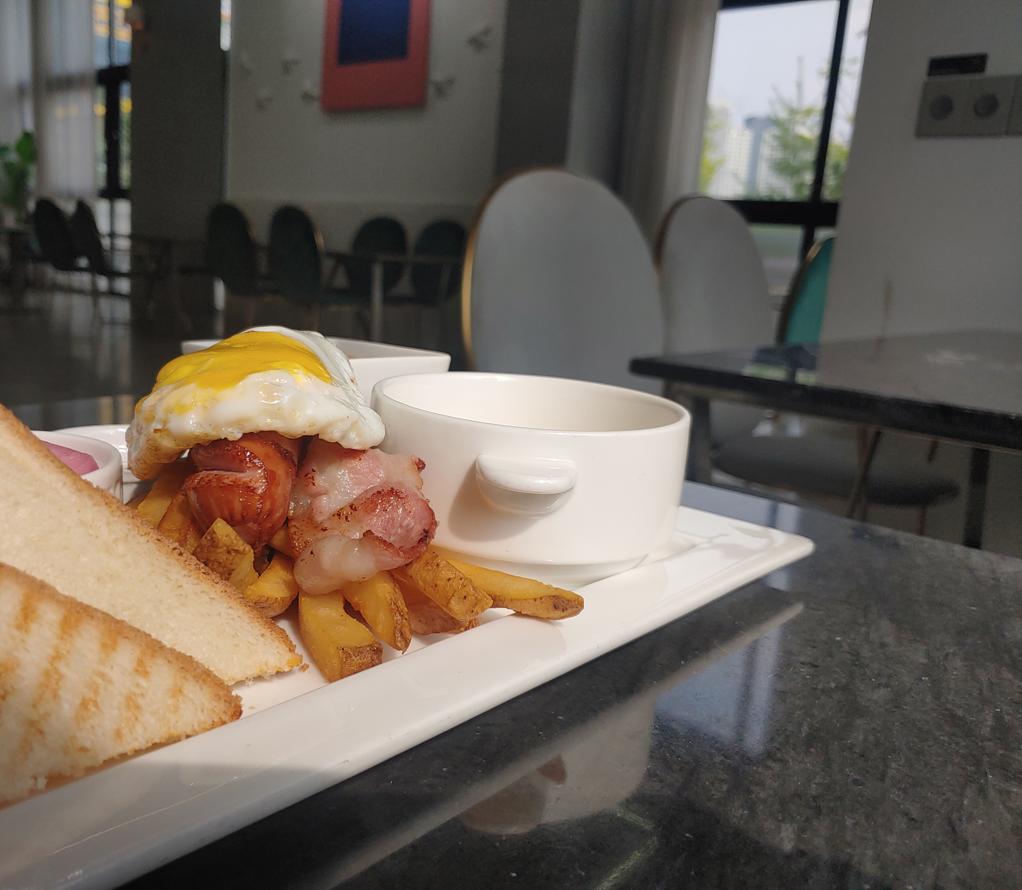 '아메리칸 브런치' 메뉴 하나에 토스트, 소시지, 베이컨, 크림 치즈볼, 샐러드, 감자튀김, 계란후랑, 감바스가 모두 있으니, 둘이서 먹어도 충분히 배부를 것 같았어요.