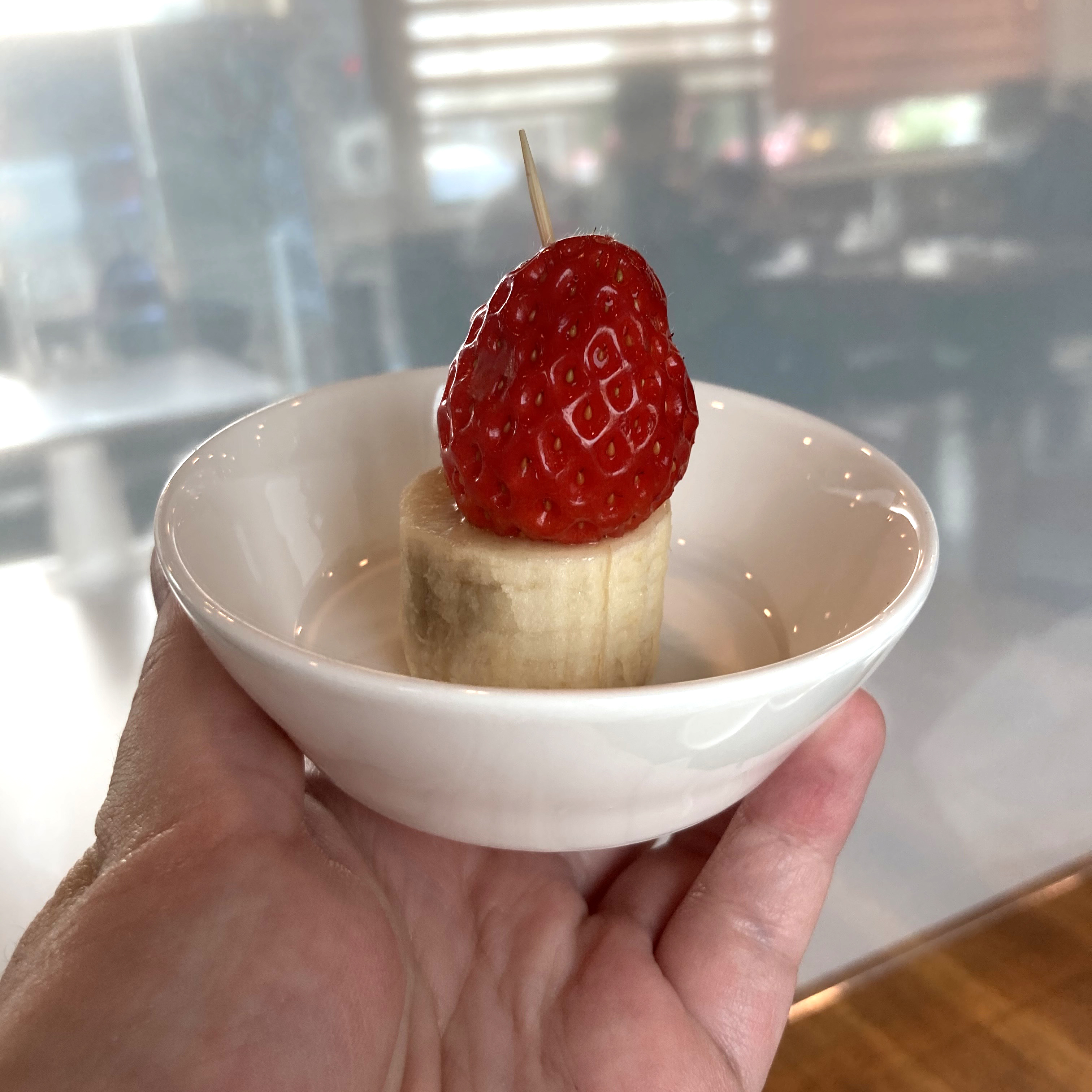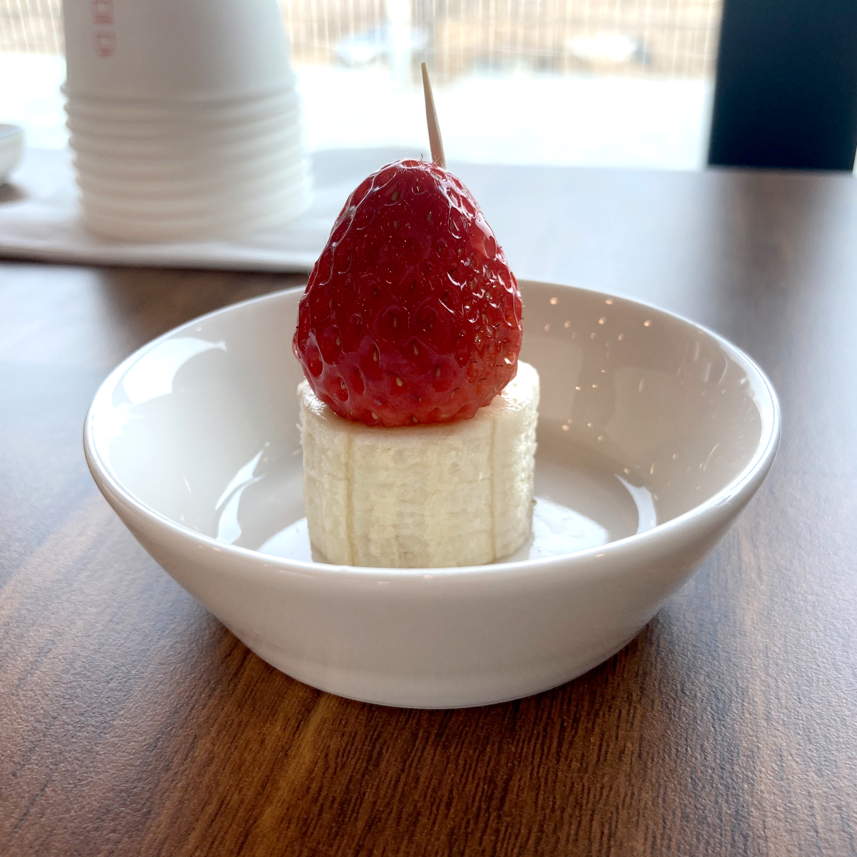 후식으로 무얼 주시나 했는데, 앙증맞은 딸기 하나와 바나나. 딱 한 입거리 먹기 좋았어요.