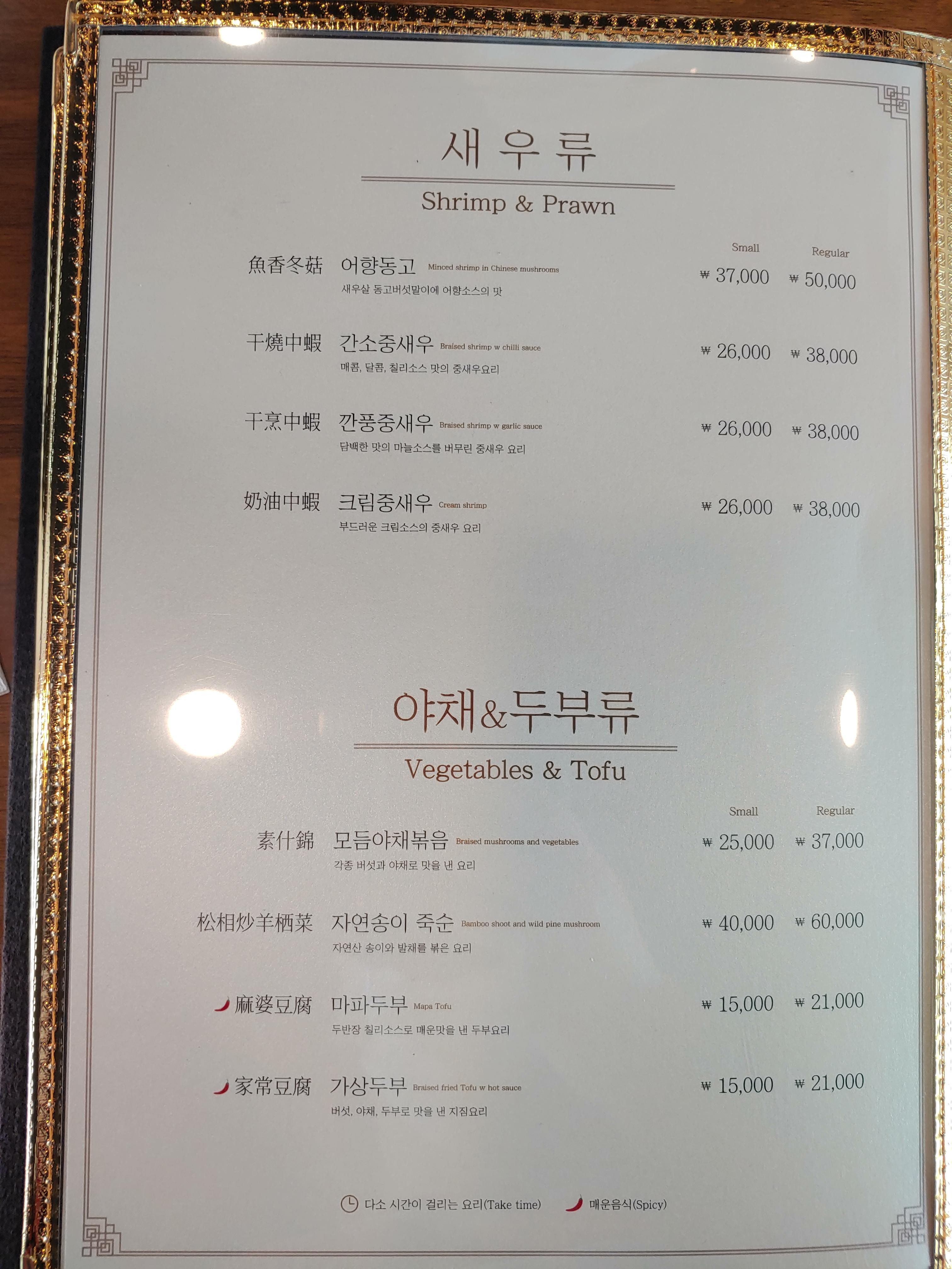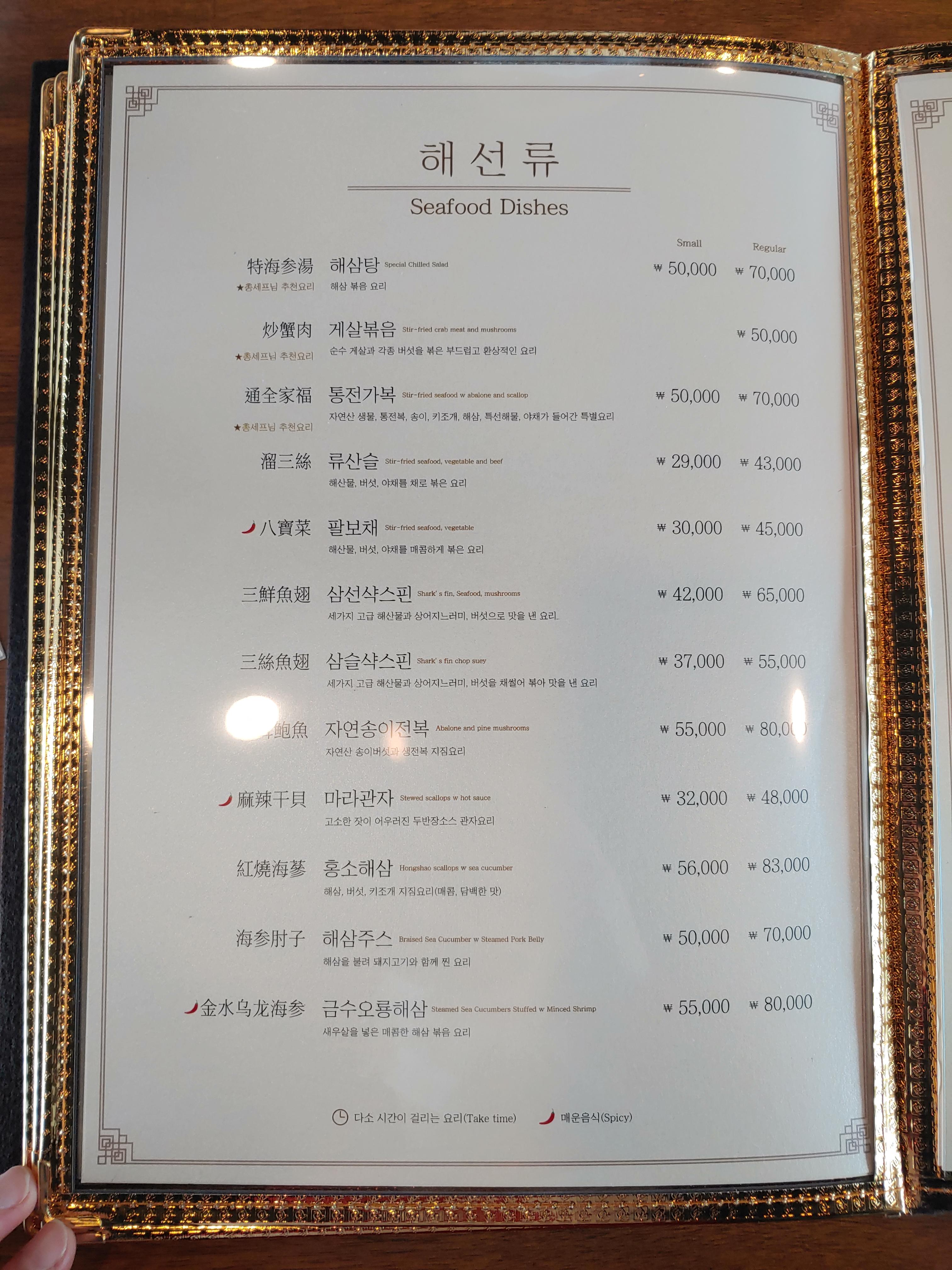 그리고 중식당의 기본 메뉴를 지나서 냉채류부터 가격대가 확 올라갑니다.