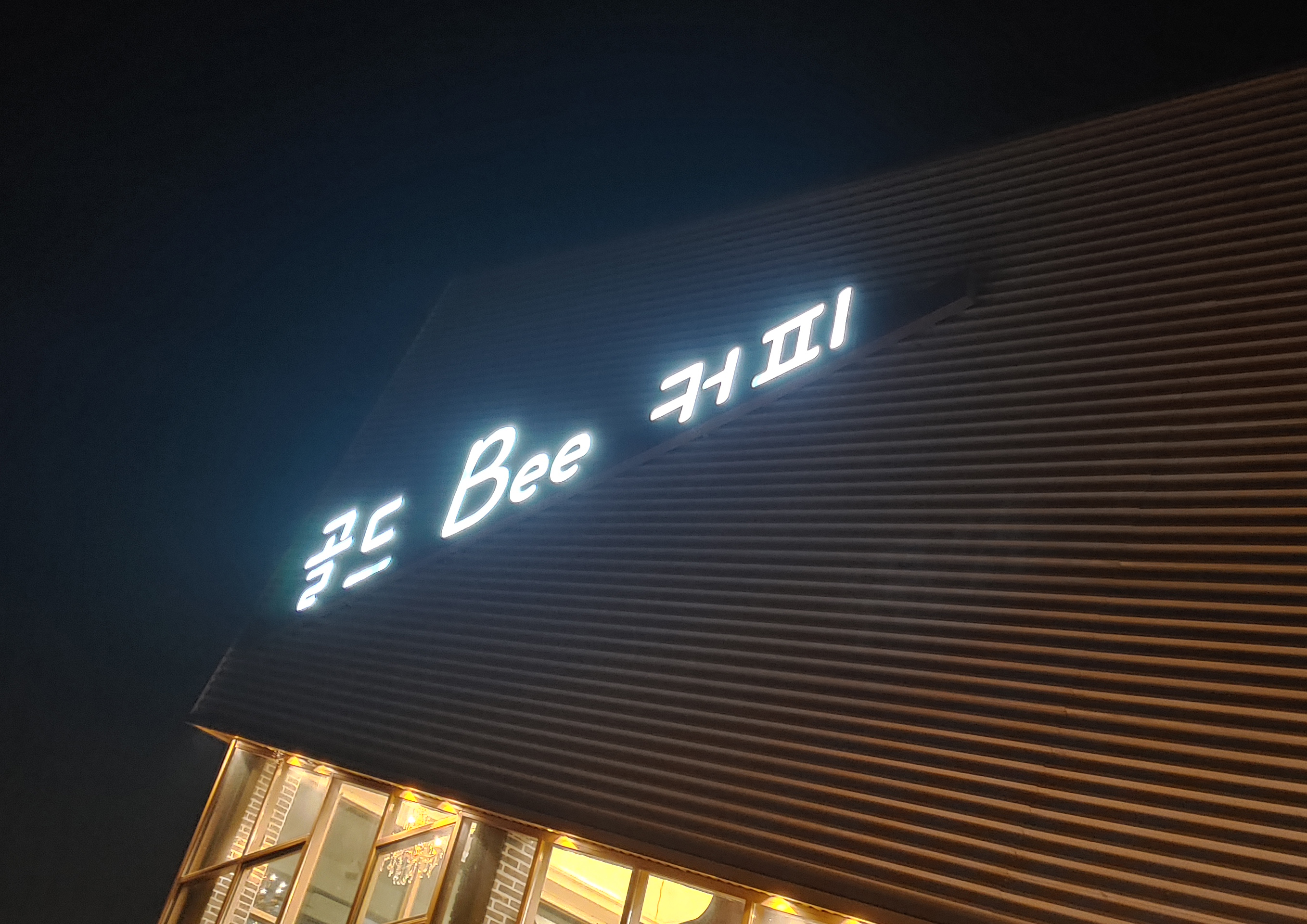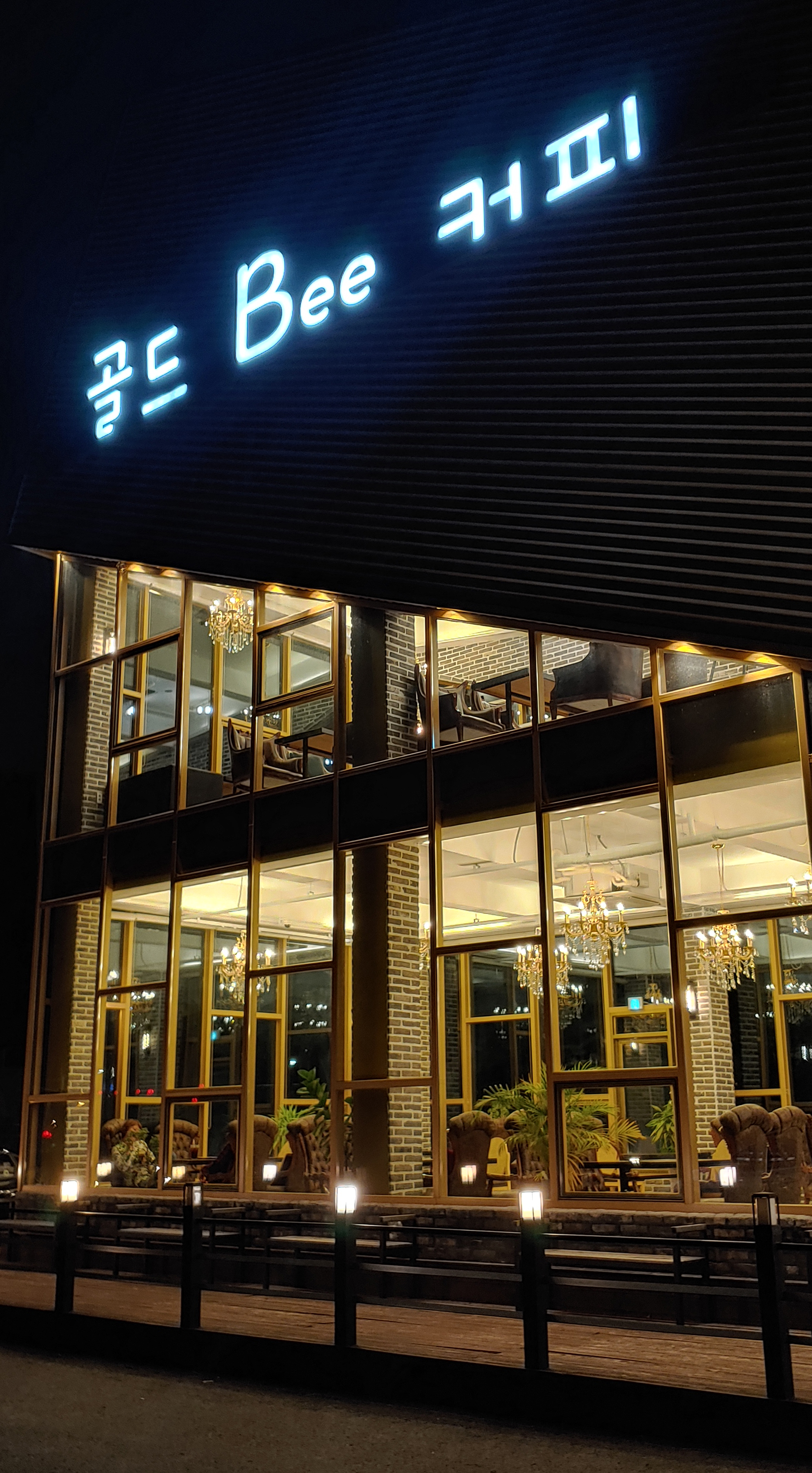 밤에도 골드 컬러와 밝은 조명으로 인해 예쁜 카페였지만
