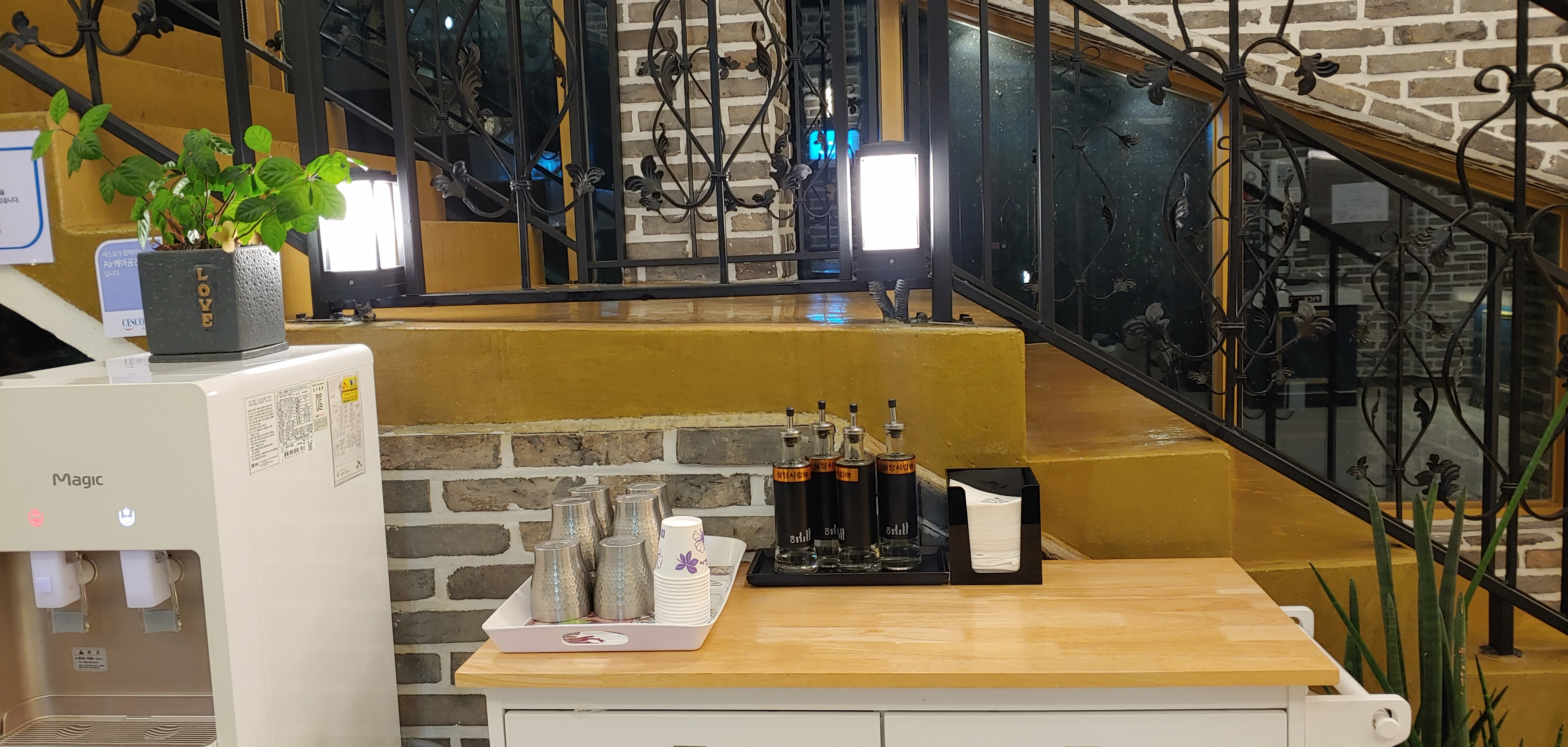셀프로 준비되어 있는 공간 뒤에 2층으로 올라가는 계단이 있습니다.