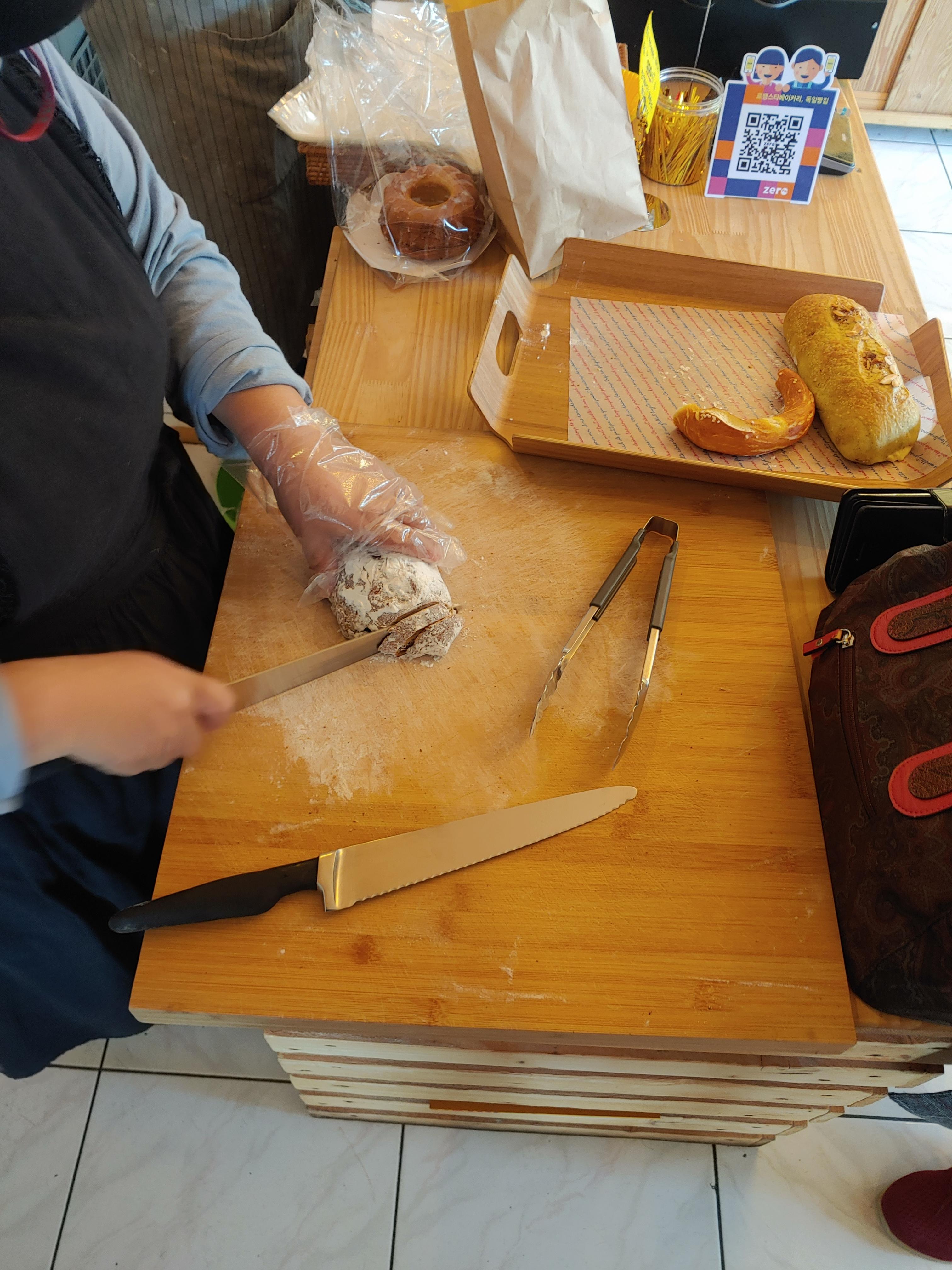 빵을 잔뜩 사고 먹기 쉽게 잘라 줄 수 있는지 부탁했더니 흔쾌히 잘라 주셨습니다.