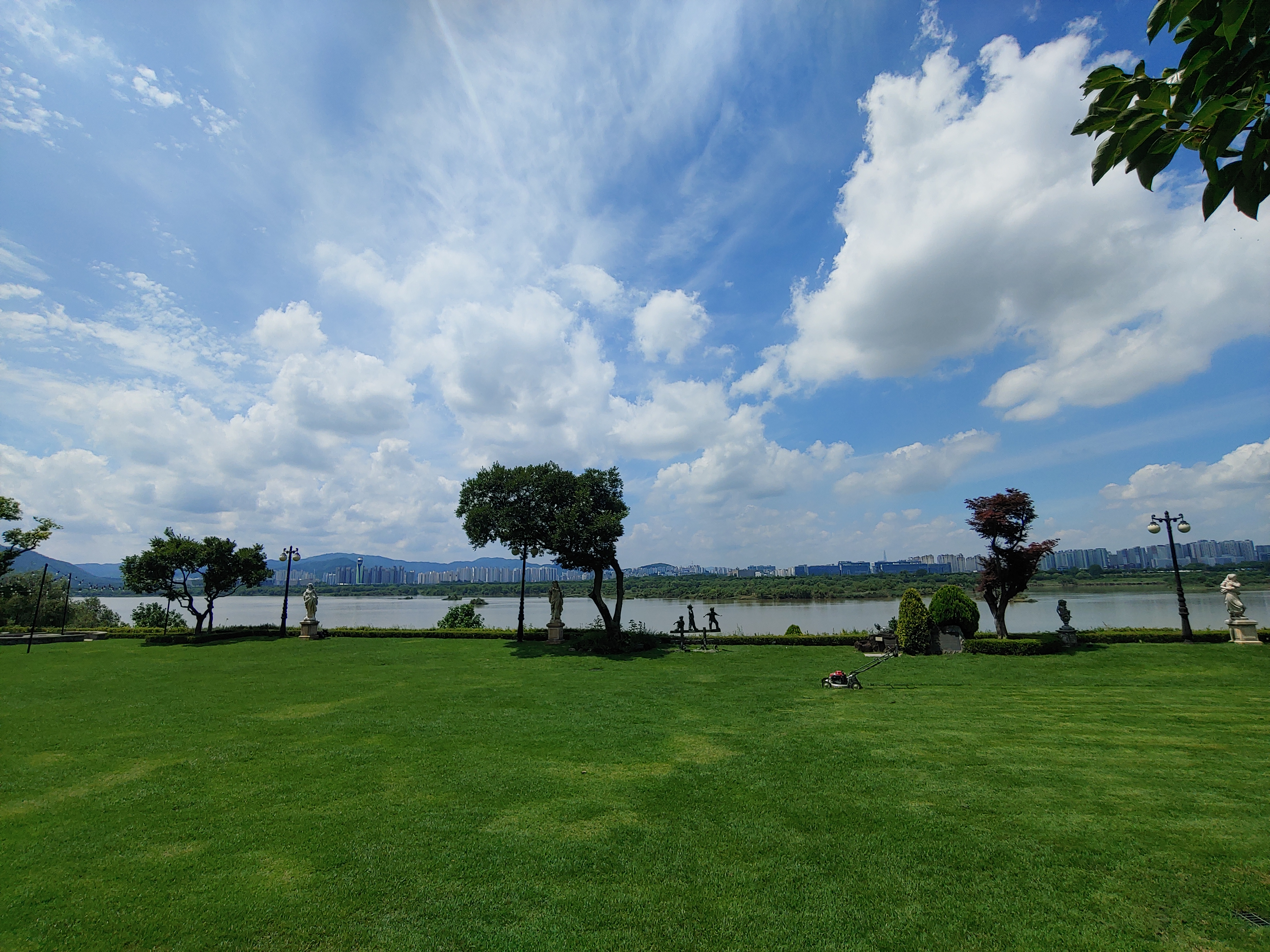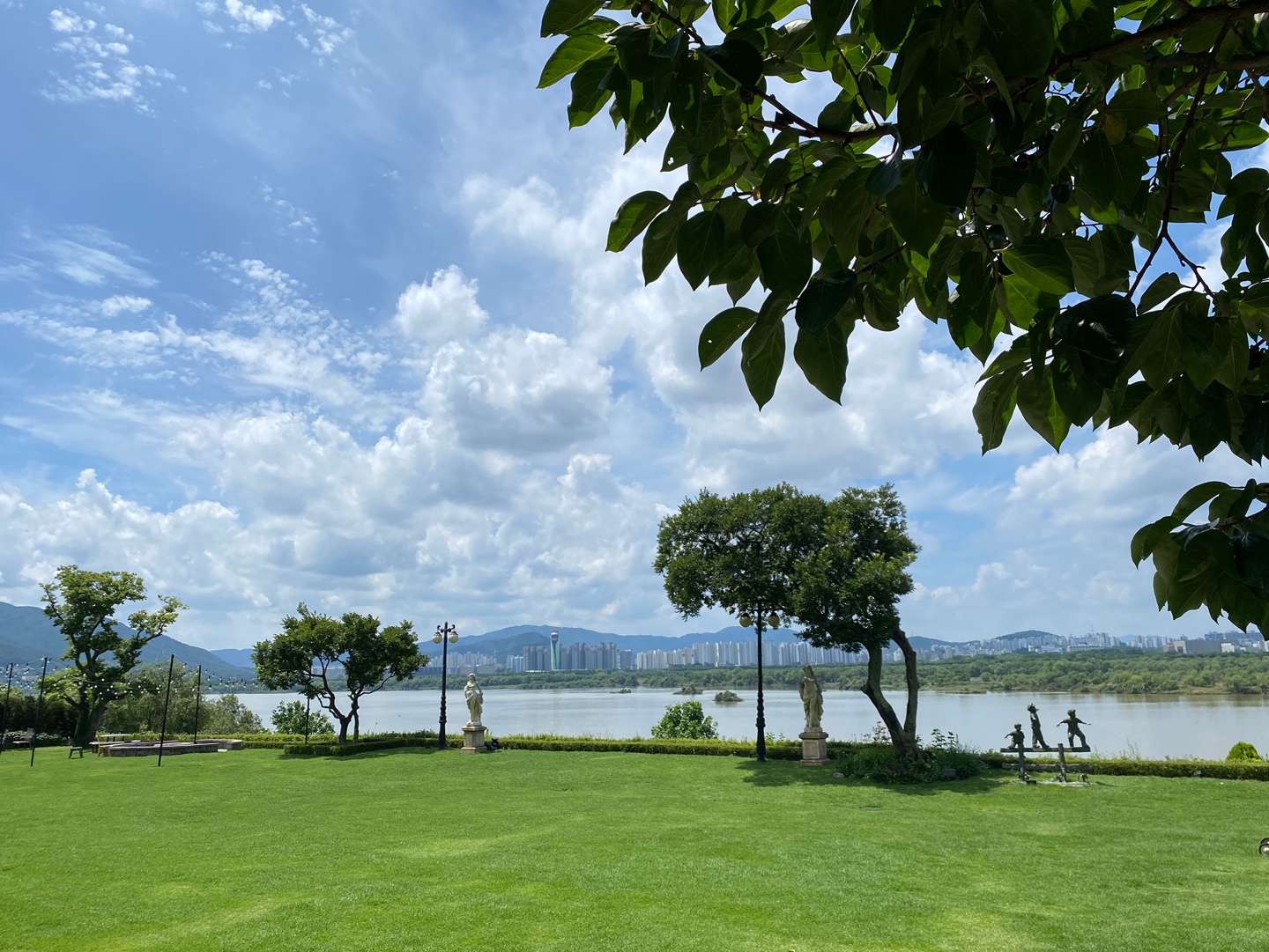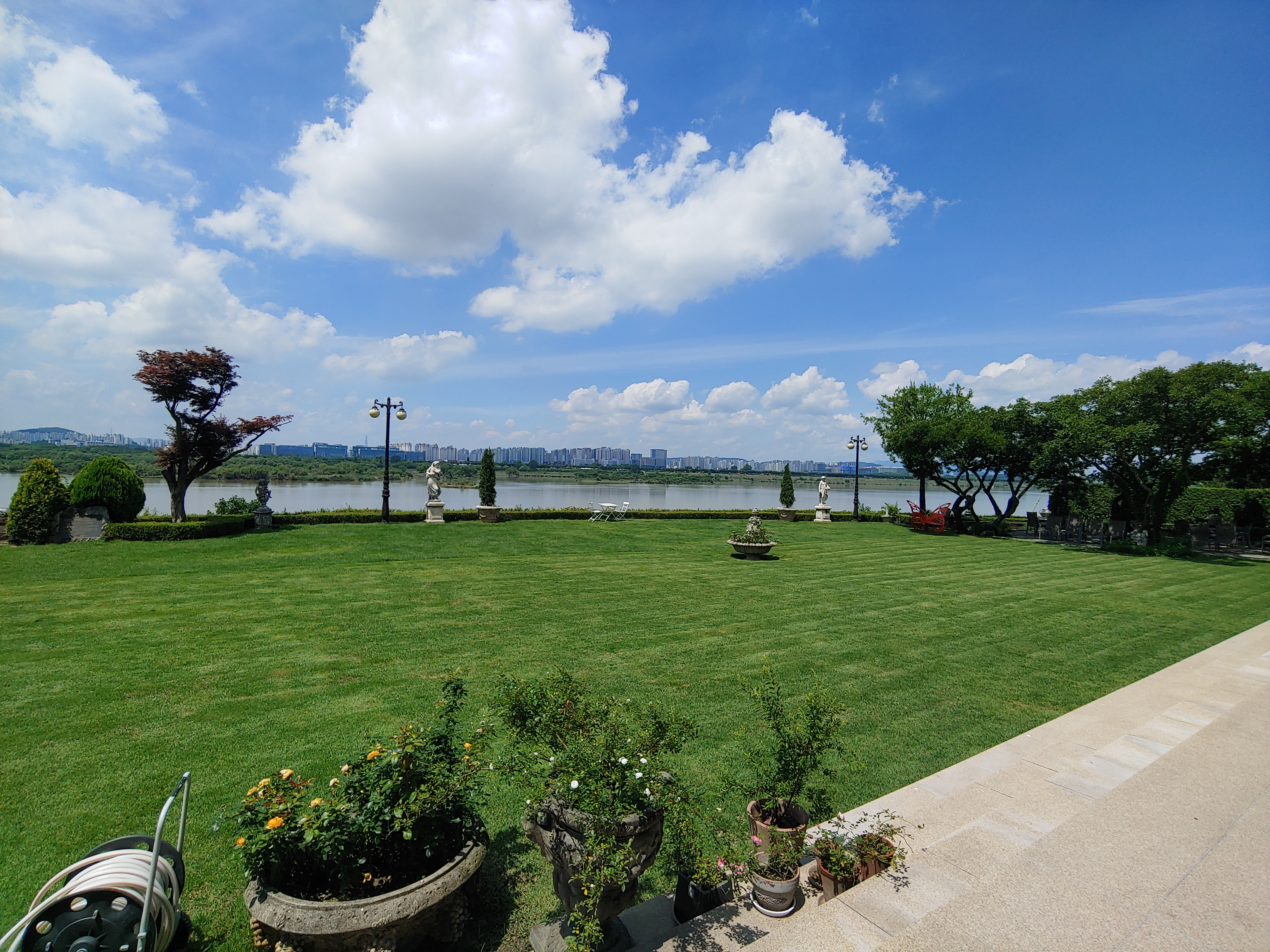 날씨가 굉장히 화창한 여름이라 푸르른 잔디와 한강이 너무 아름다웠어요.