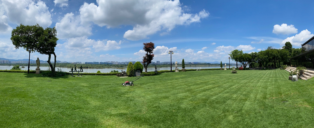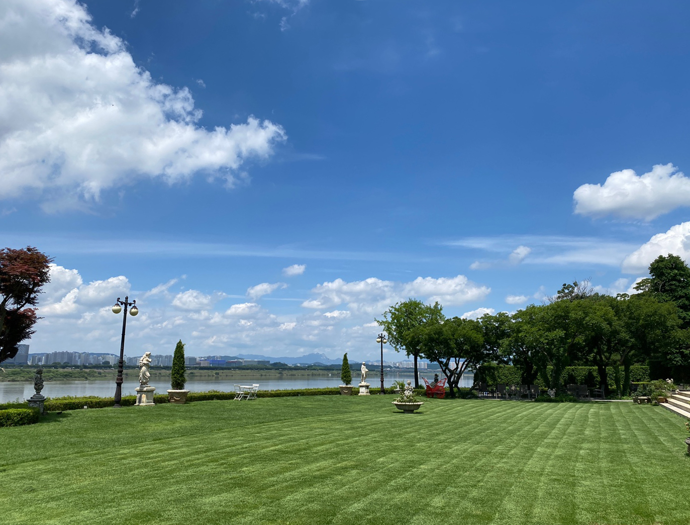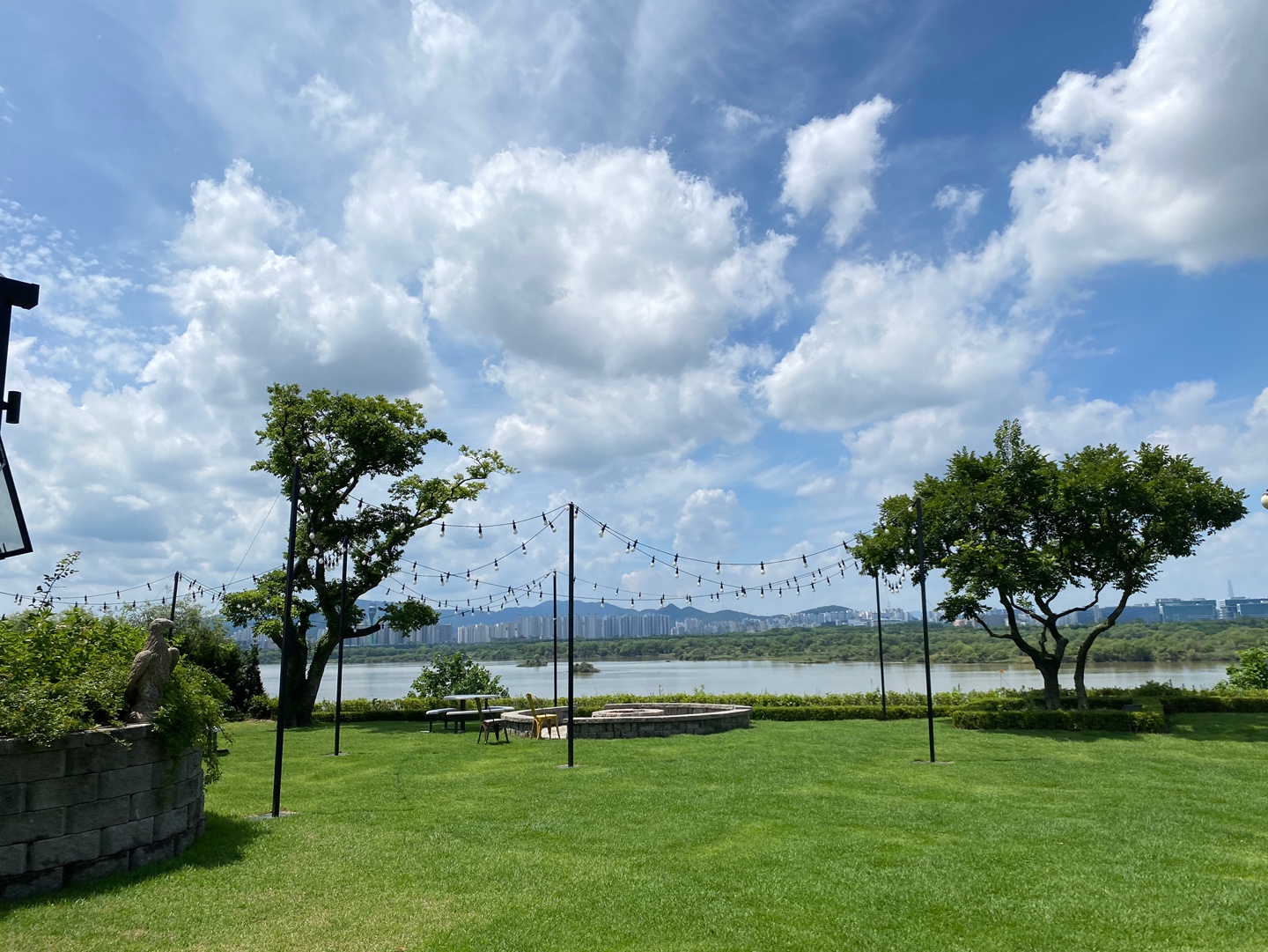 날씨가 굉장히 화창한 여름이라 푸르른 잔디와 한강이 너무 아름다웠어요.