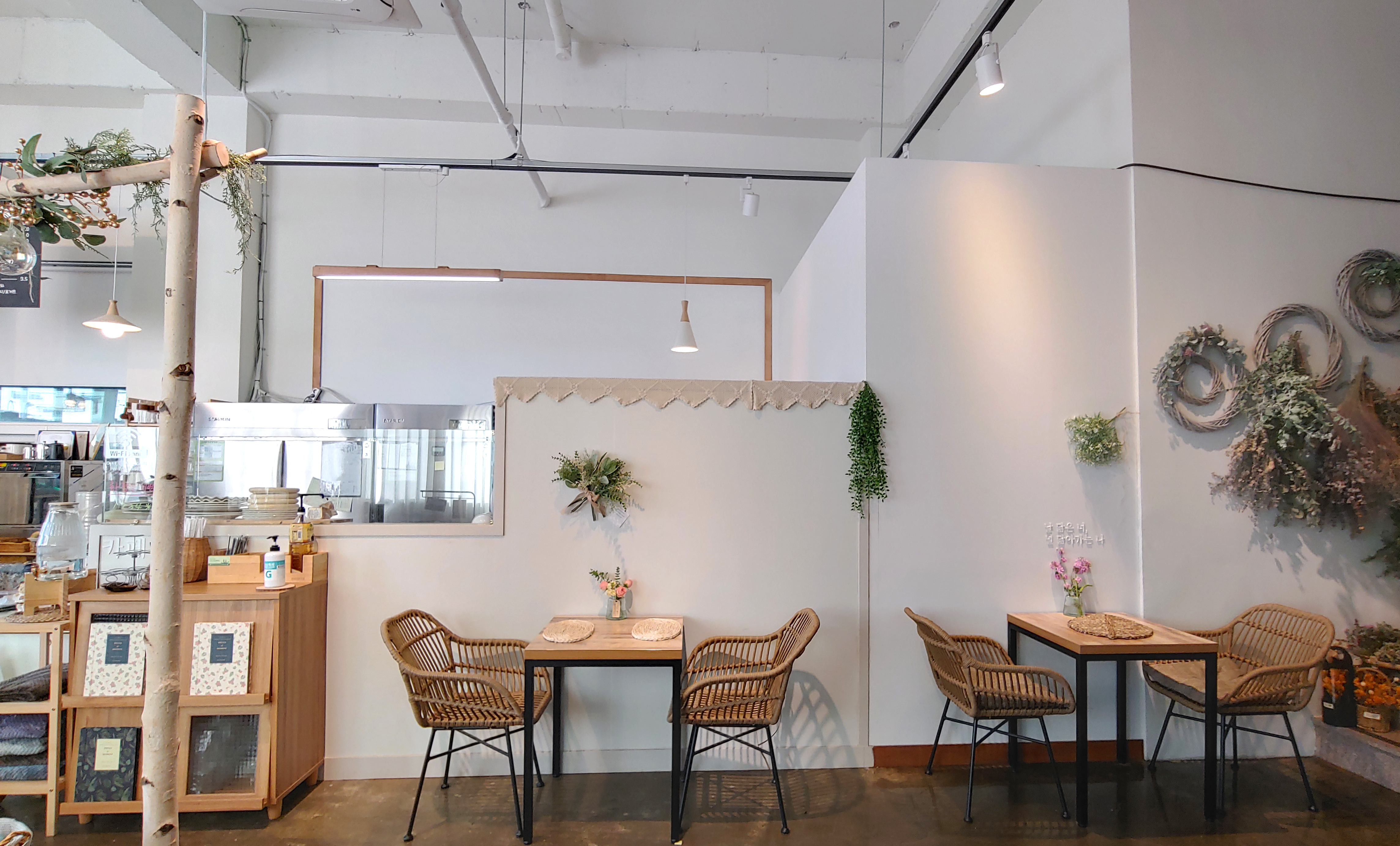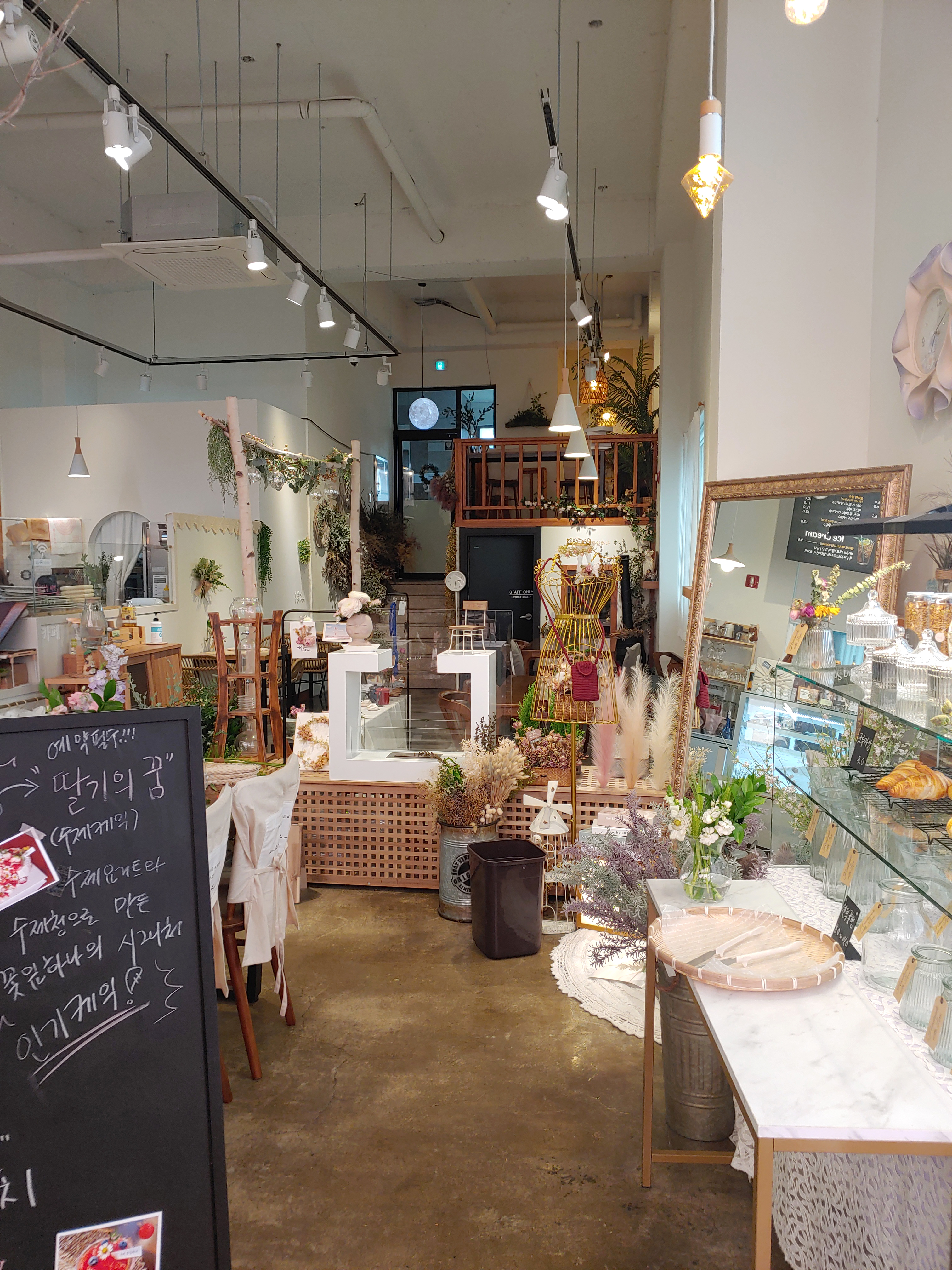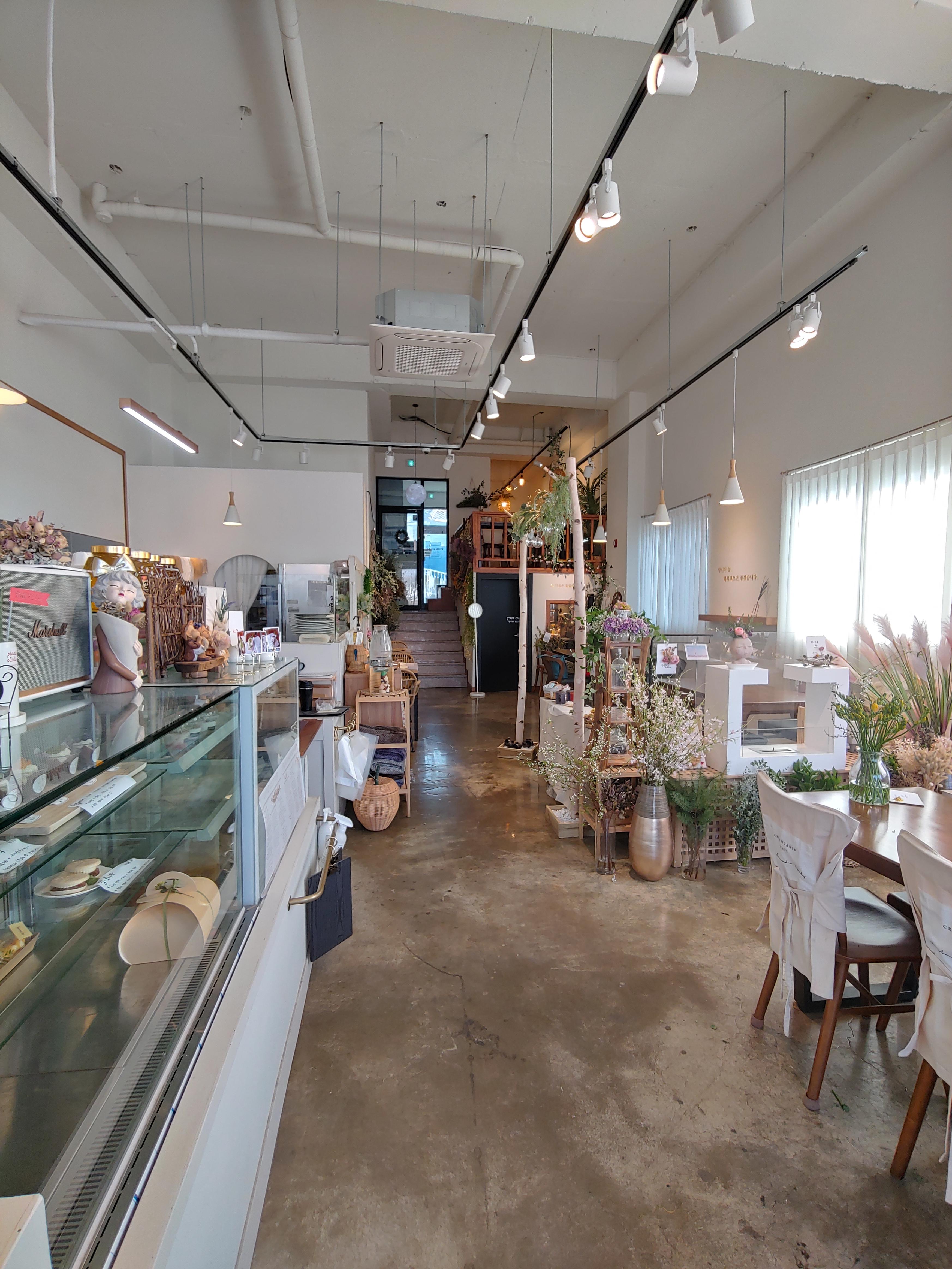 전체적으로 인테리어는 바닥 콘크리트 느낌에 전부 화이트라 그저 좀 깔끔하고 평범할 수 있는 인테리어인데, 모든 것을 꽃과 소품으로만 꾸며서 이렇게 예쁜 카페가 탄생한 것 같았어요.