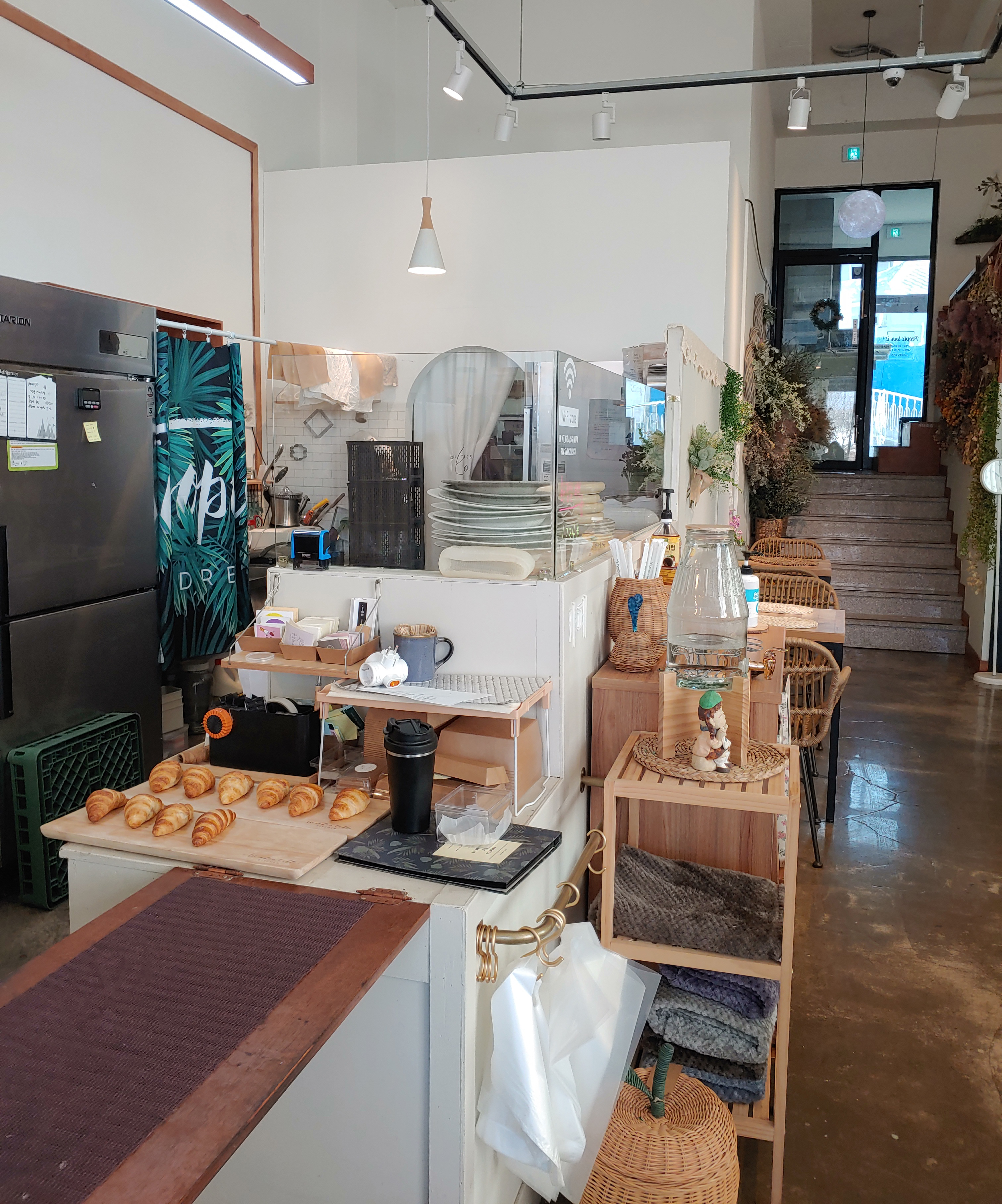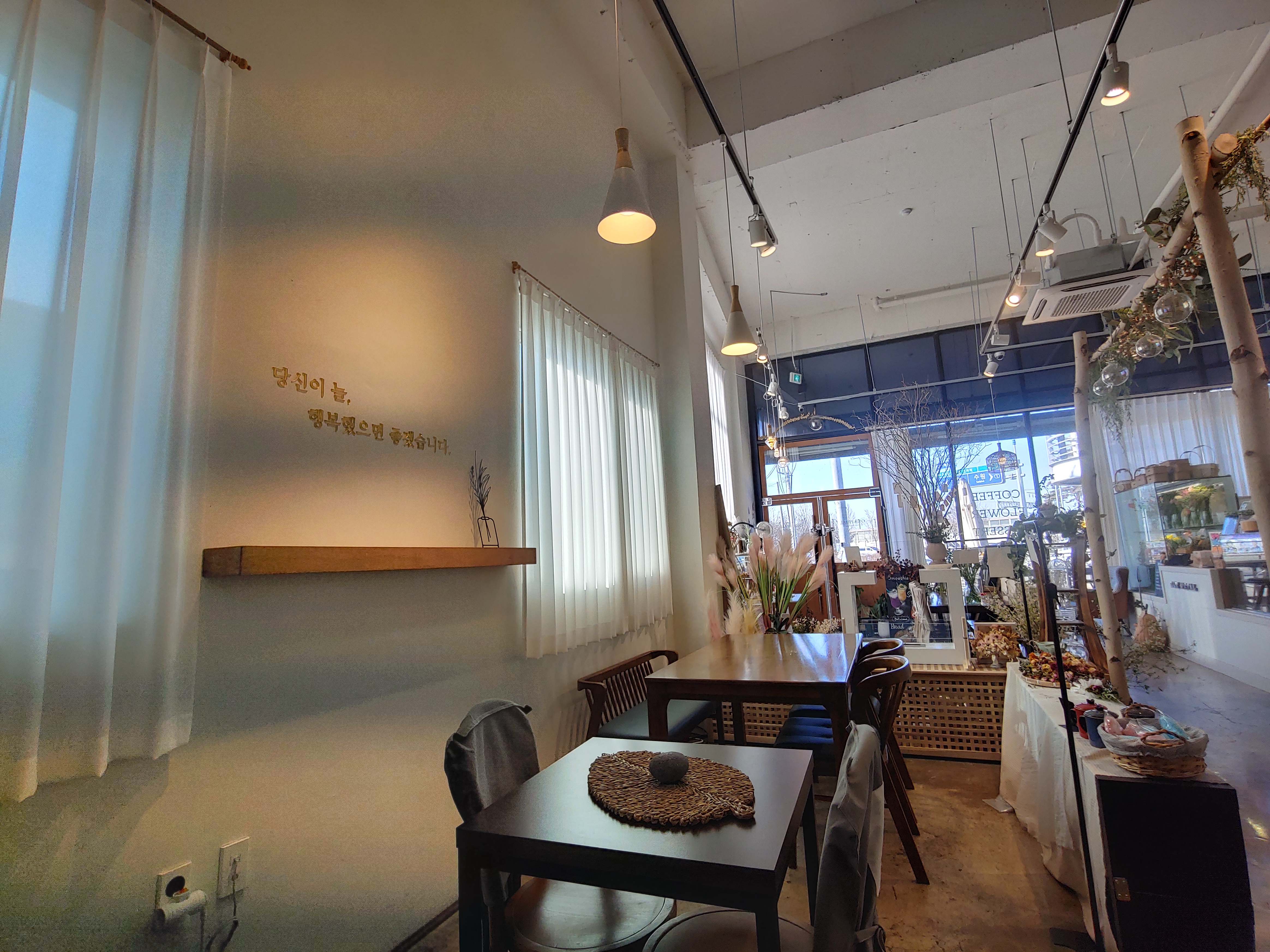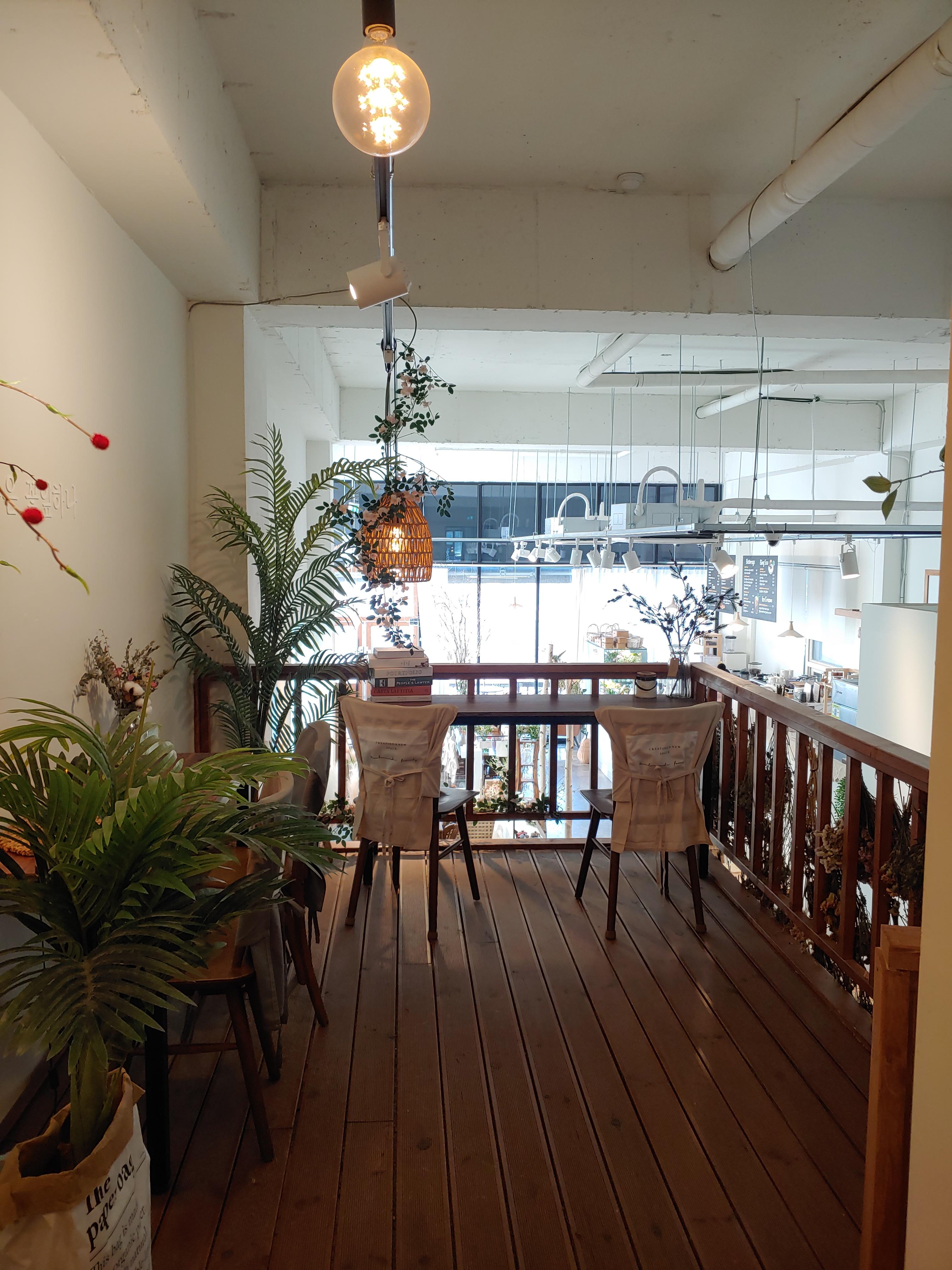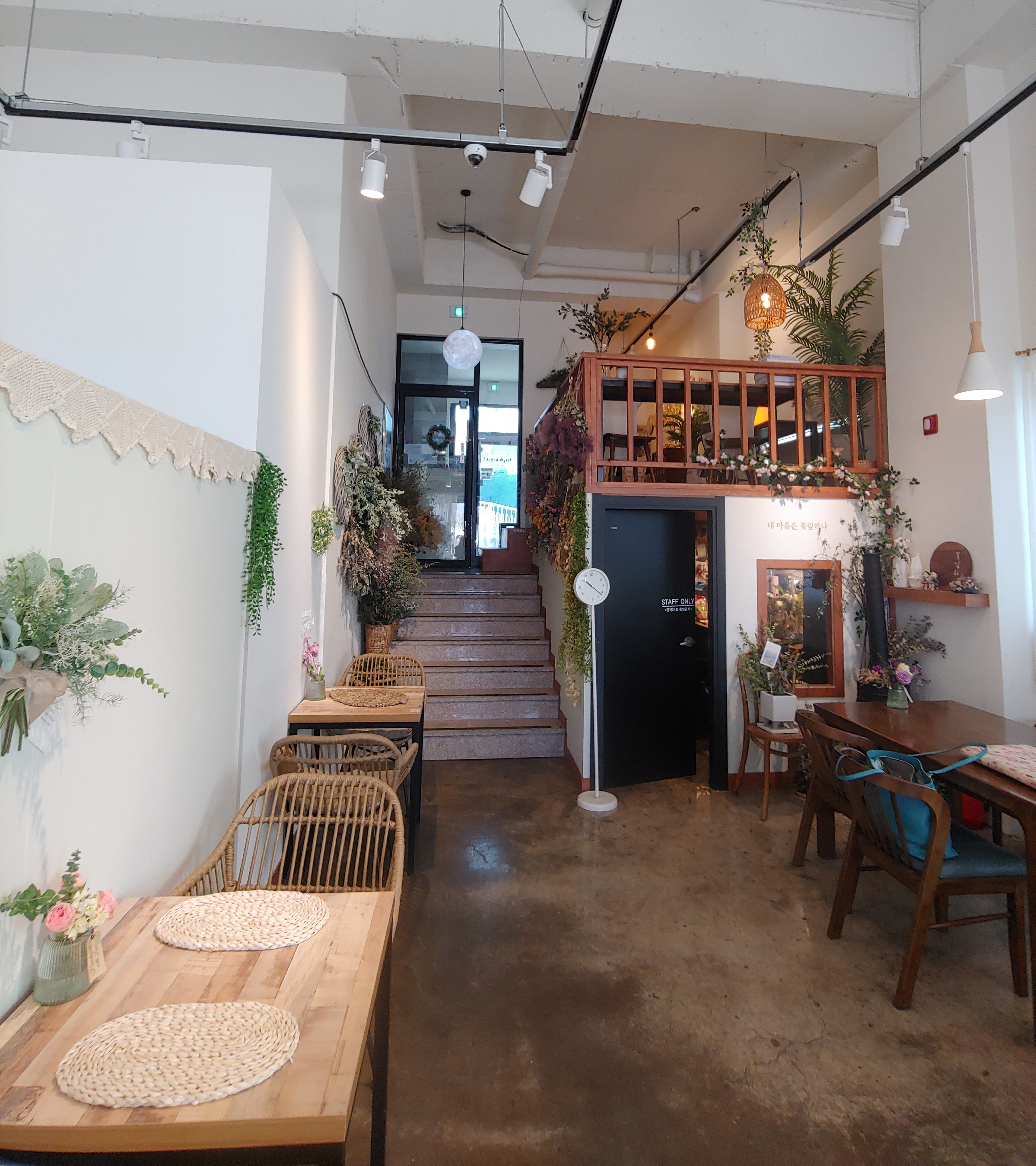 전체적으로 인테리어는 바닥 콘크리트 느낌에 전부 화이트라 그저 좀 깔끔하고 평범할 수 있는 인테리어인데, 모든 것을 꽃과 소품으로만 꾸며서 이렇게 예쁜 카페가 탄생한 것 같았어요.