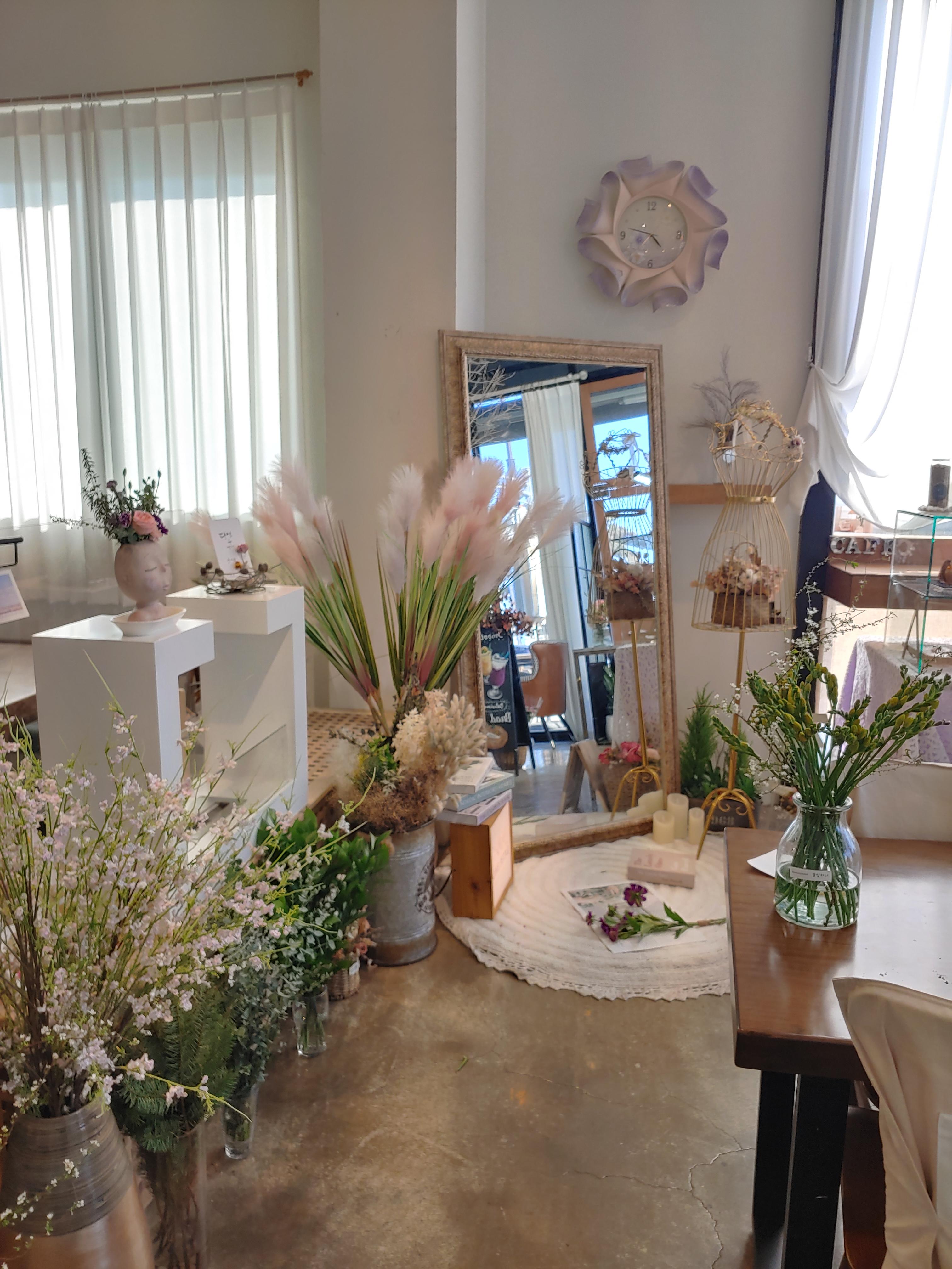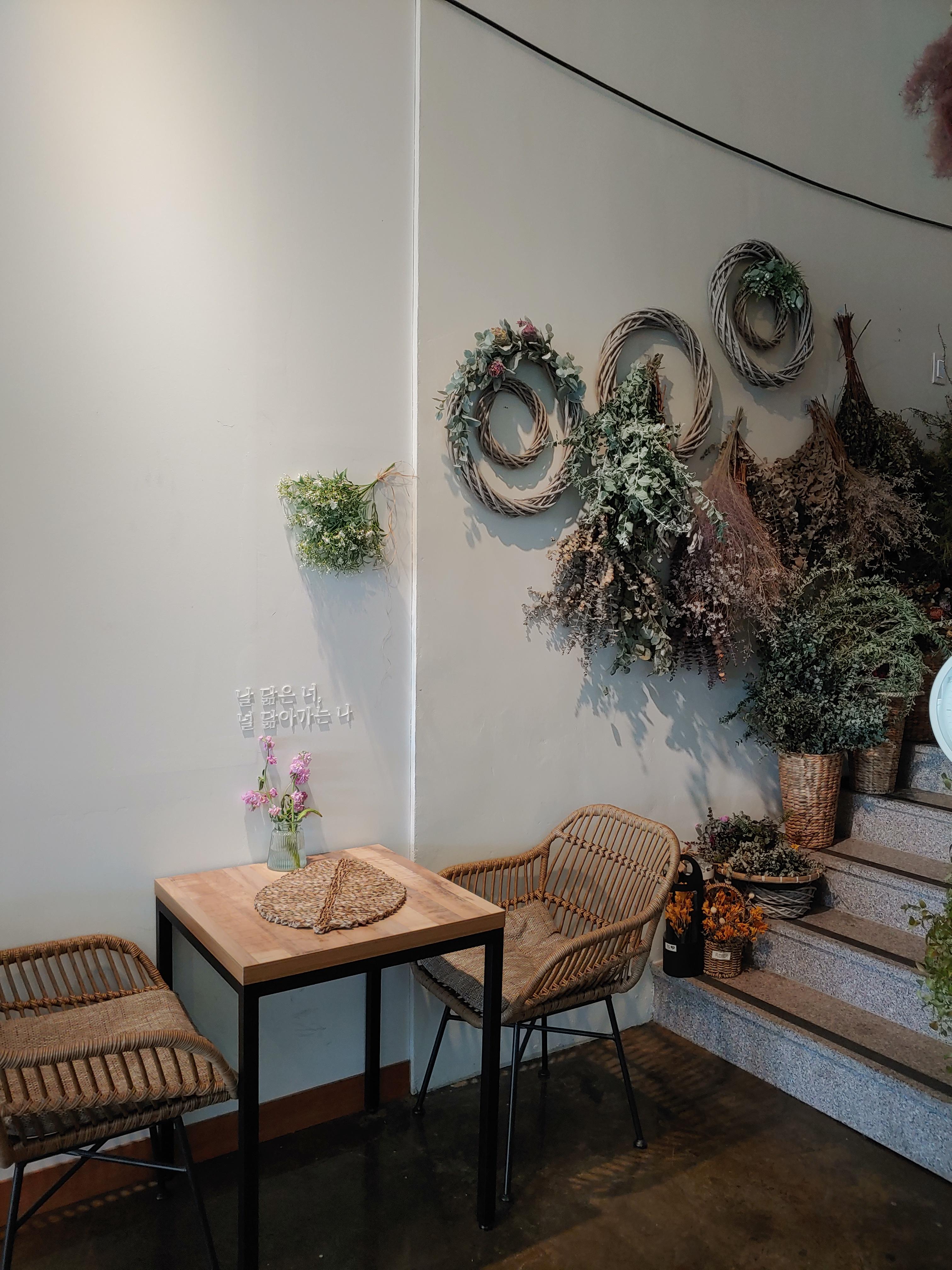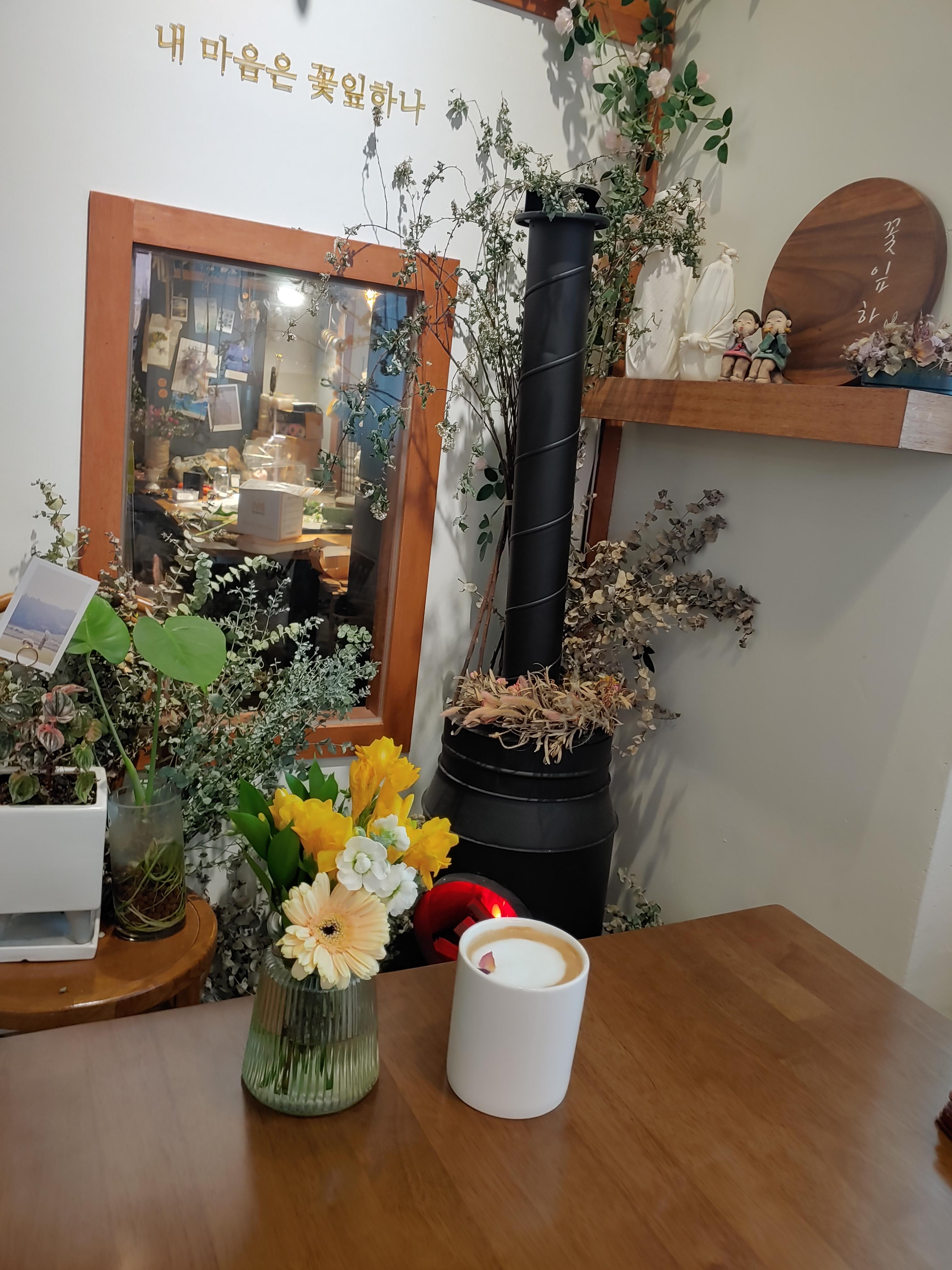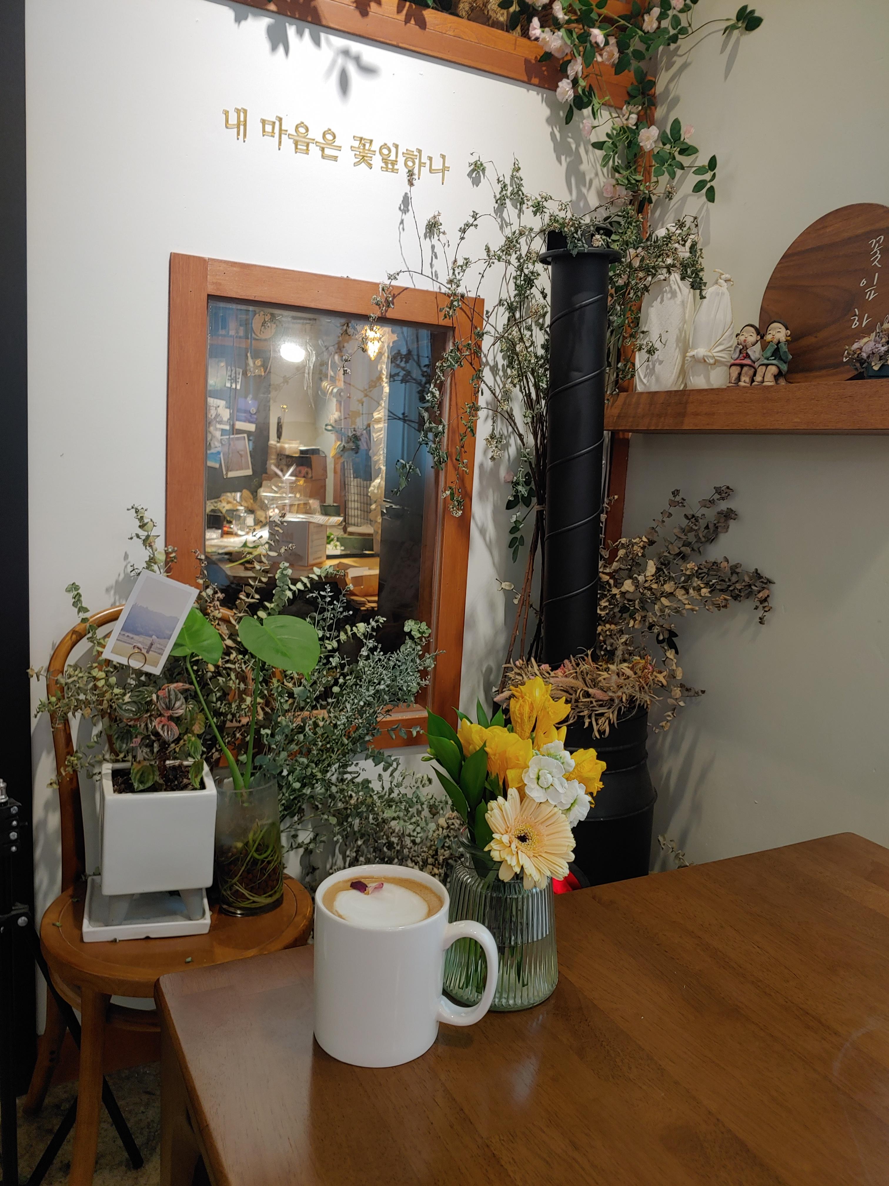 꽃과 카페의 분위기 그리고 다른 소품들을 유기적으로 잘 활용해서 오는 손님들이 음료만 즐기는 게 아니라 공간에서 오는 감성도 편안하게 느낄 수 있도록 꾸민 것 같아요.