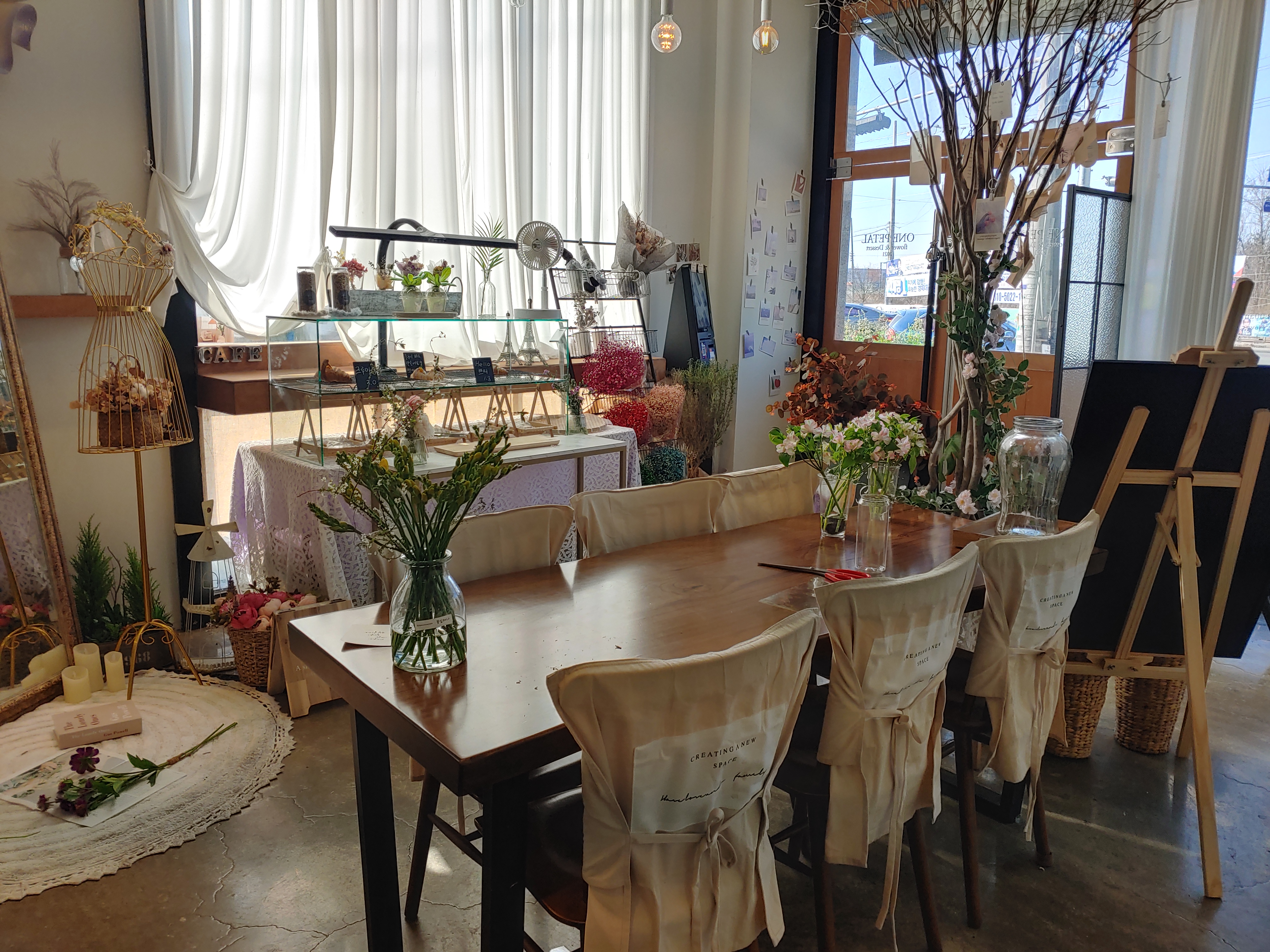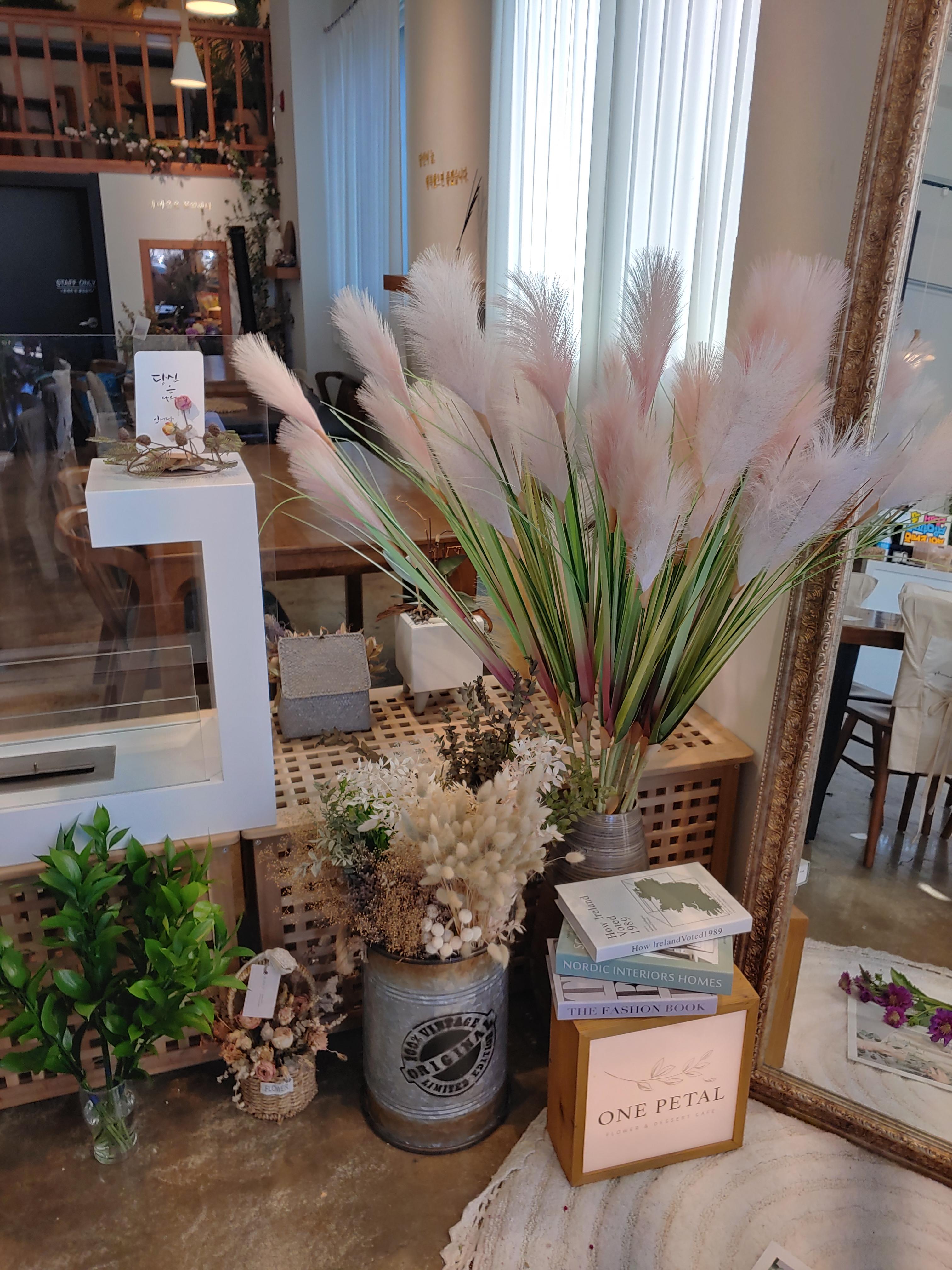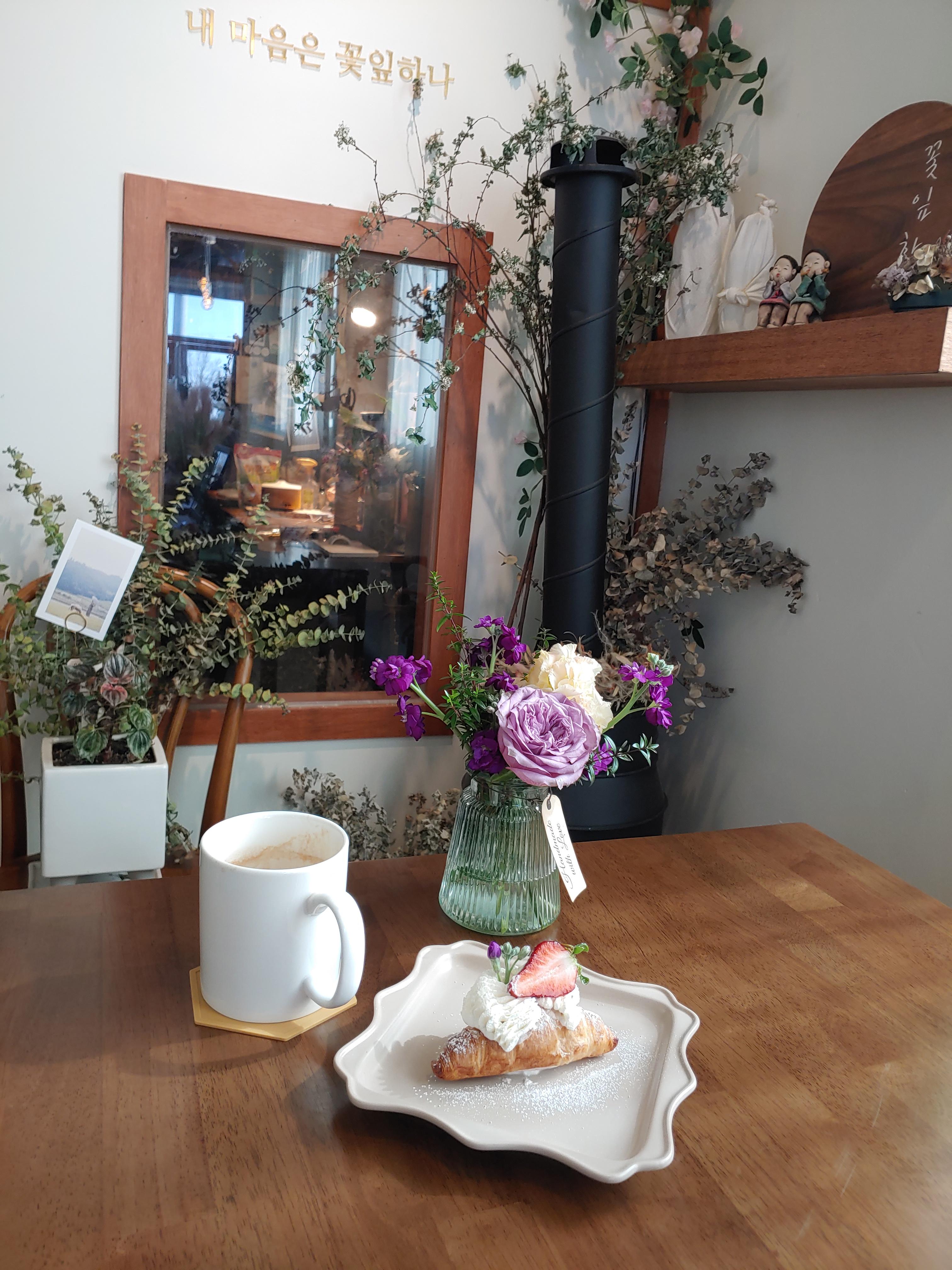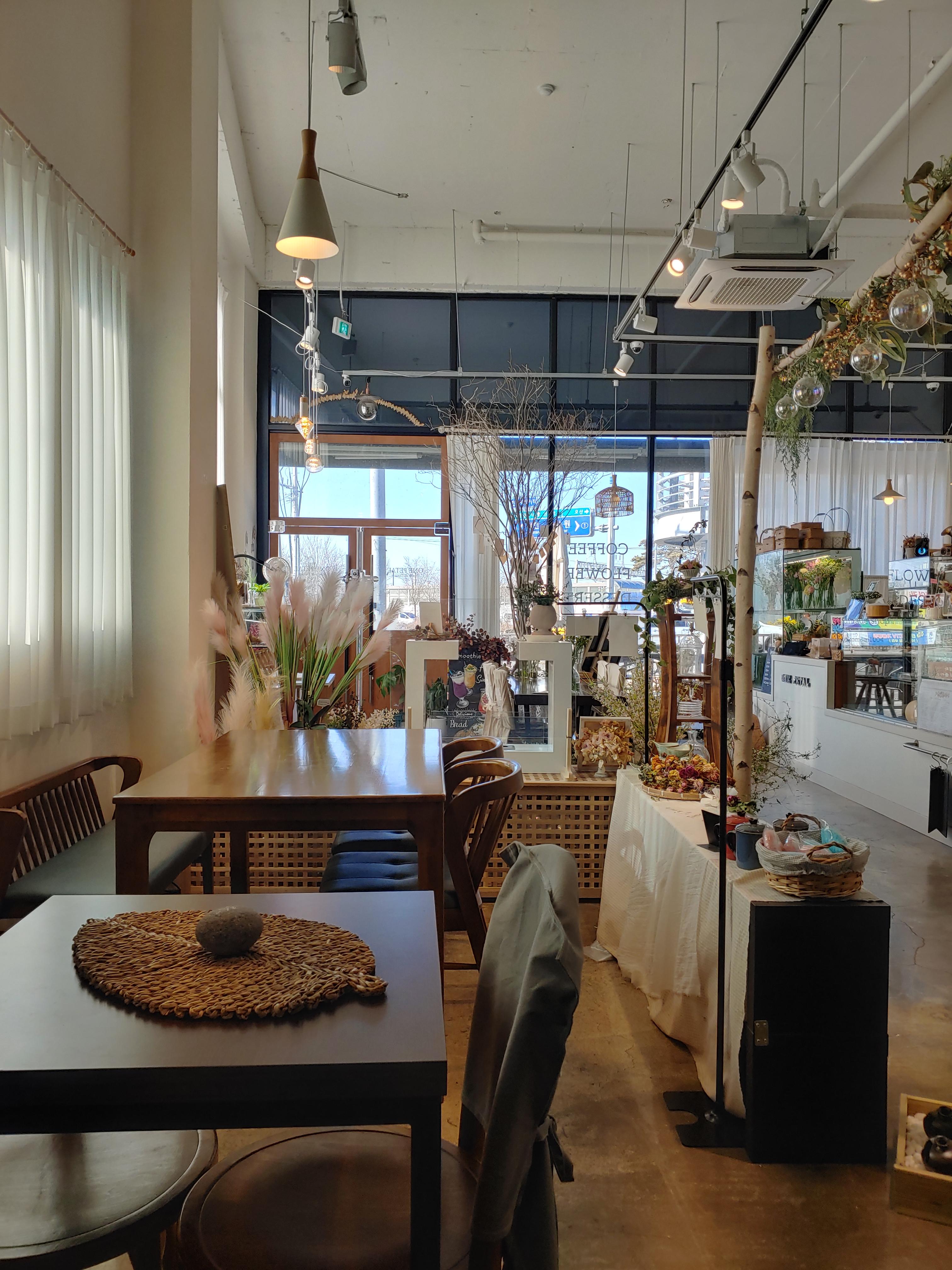 꽃과 카페의 분위기 그리고 다른 소품들을 유기적으로 잘 활용해서 오는 손님들이 음료만 즐기는 게 아니라 공간에서 오는 감성도 편안하게 느낄 수 있도록 꾸민 것 같아요.