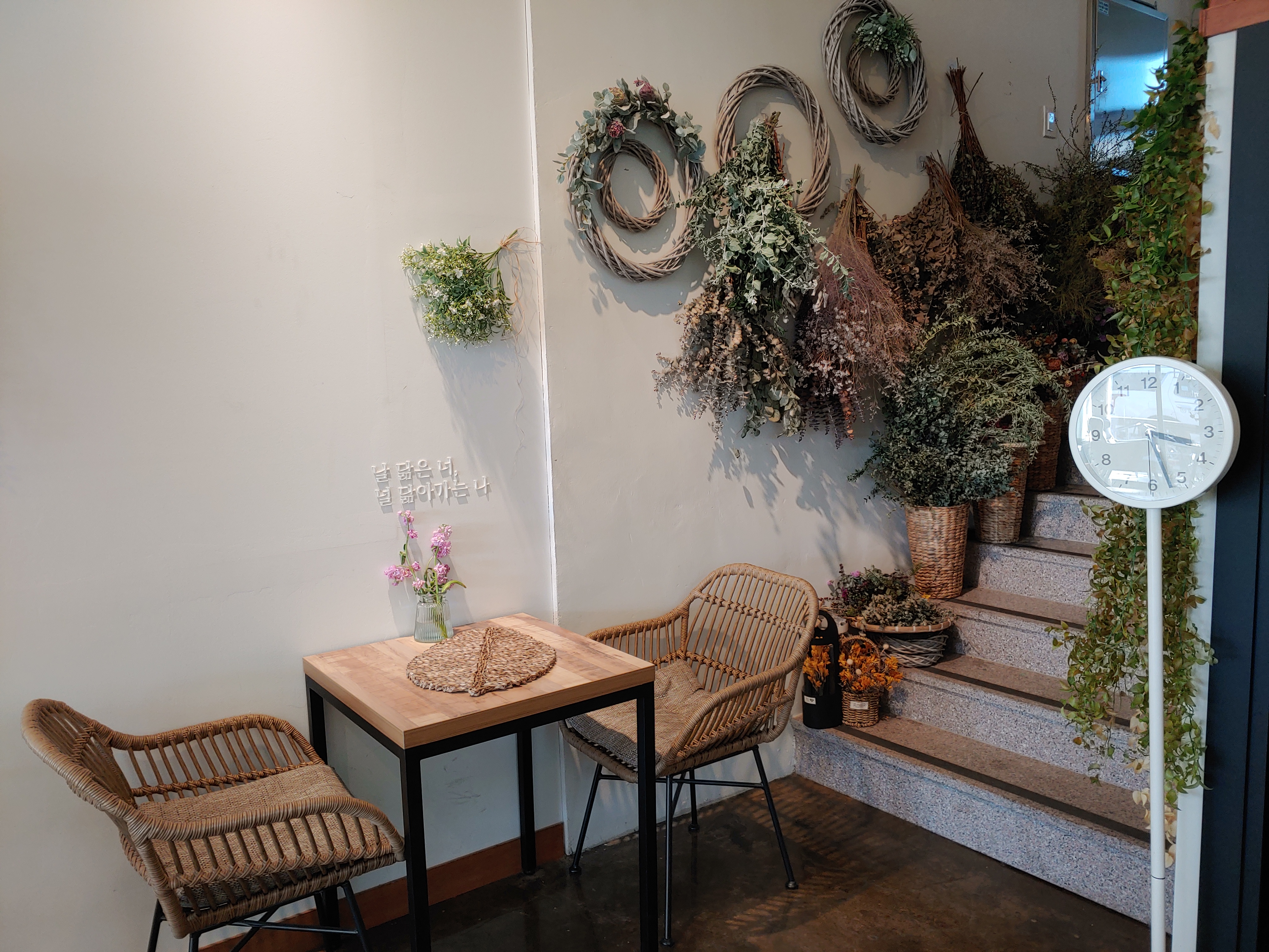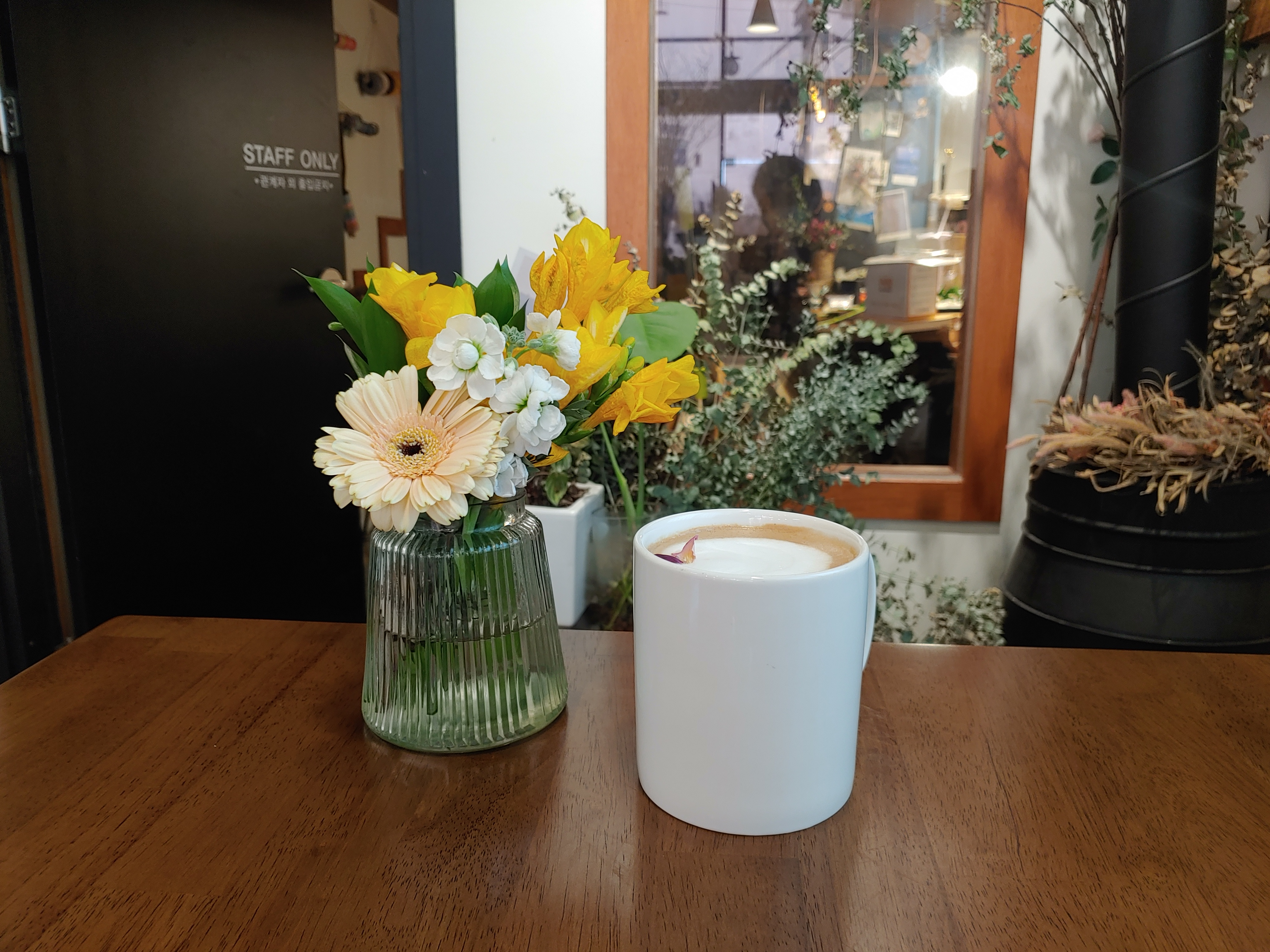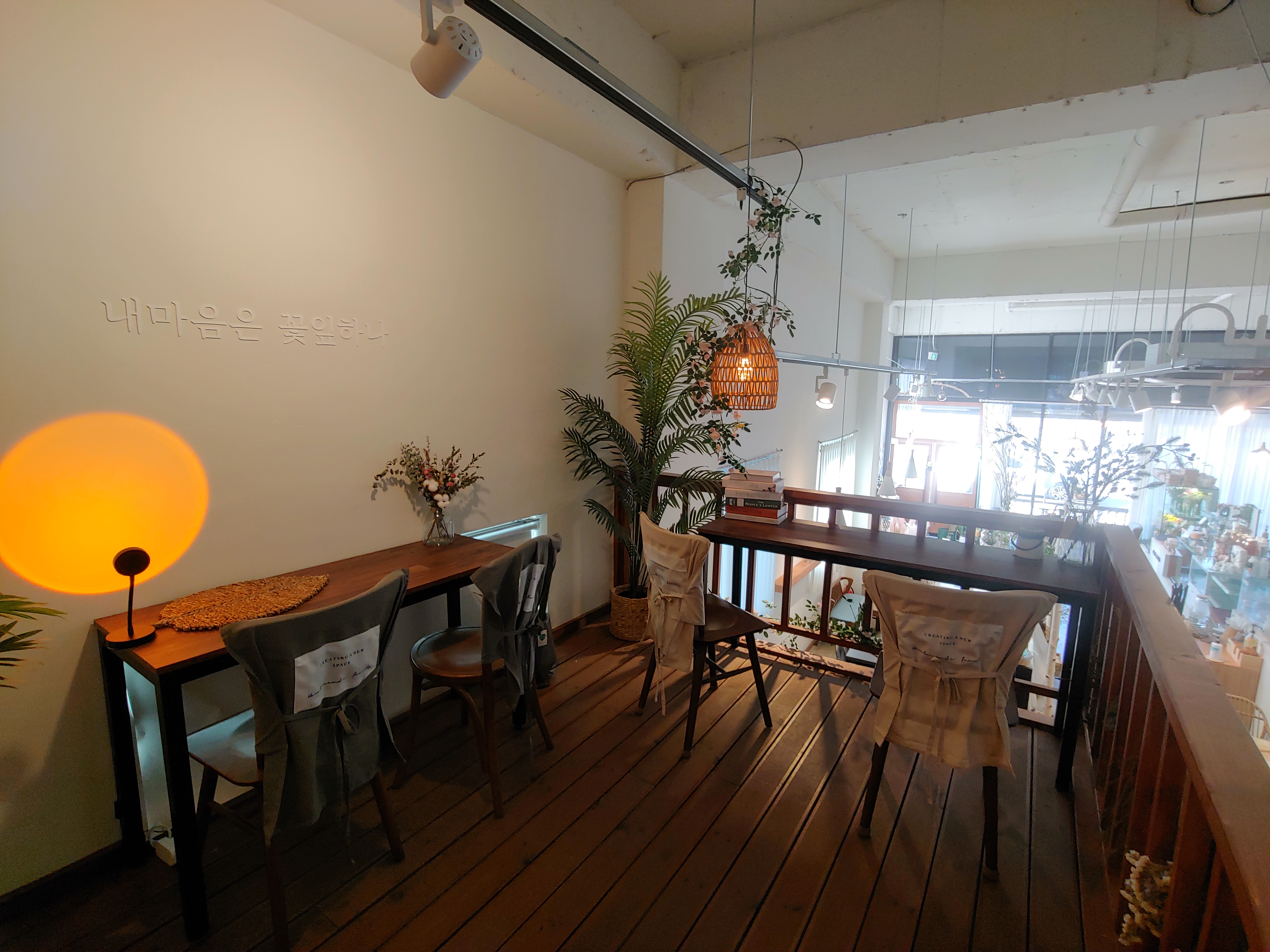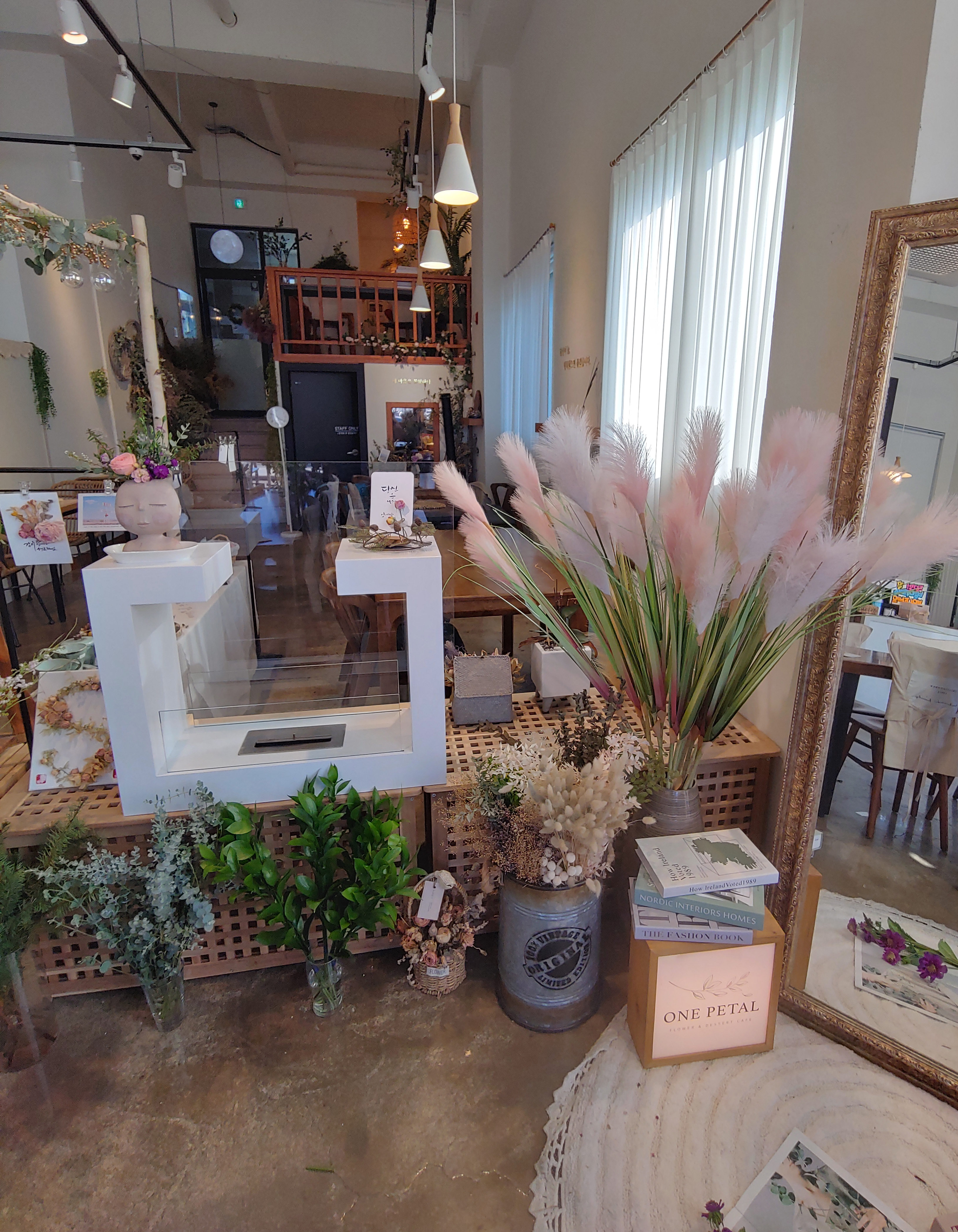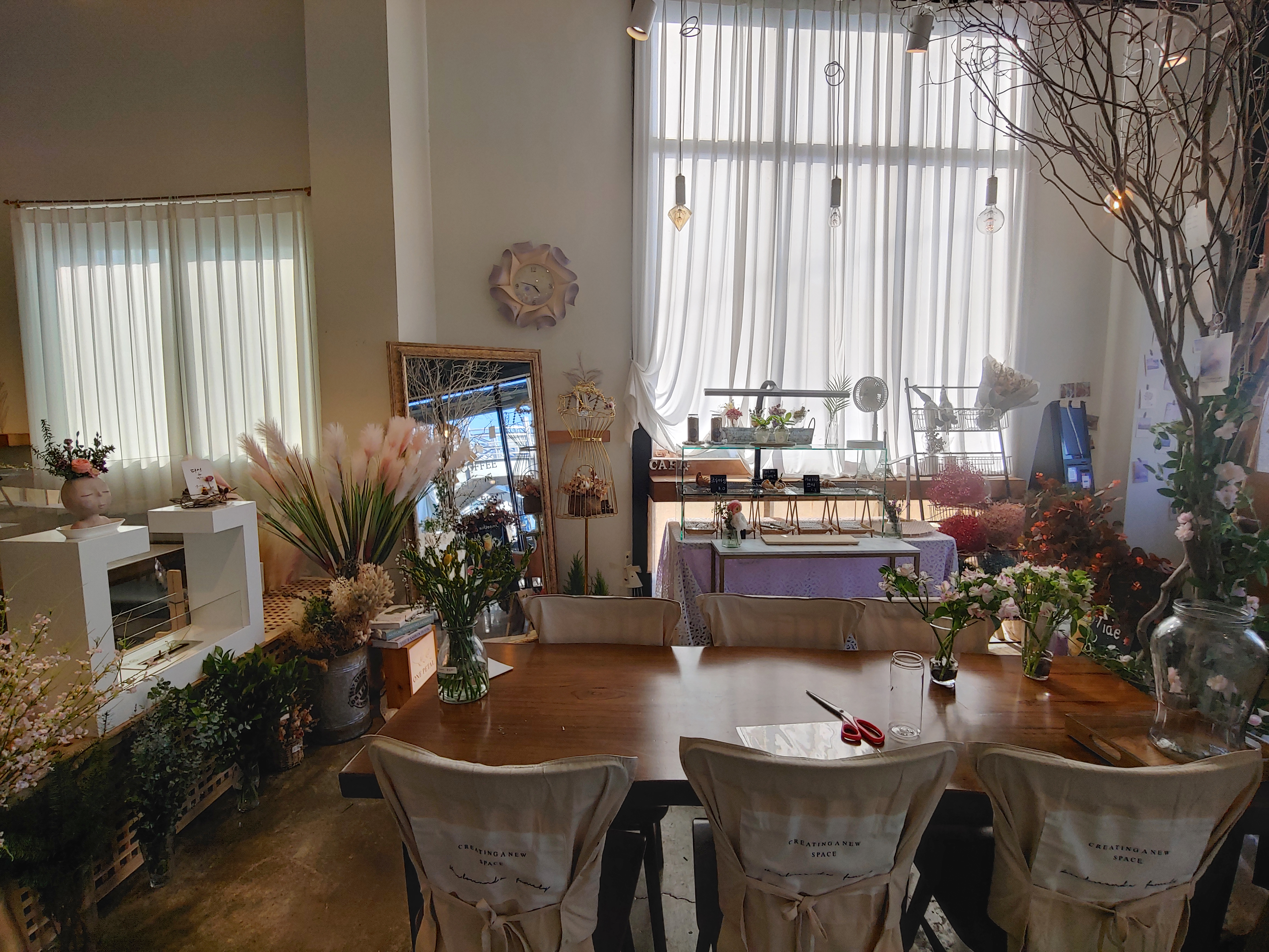 꽃과 카페의 분위기 그리고 다른 소품들을 유기적으로 잘 활용해서 오는 손님들이 음료만 즐기는 게 아니라 공간에서 오는 감성도 편안하게 느낄 수 있도록 꾸민 것 같아요.