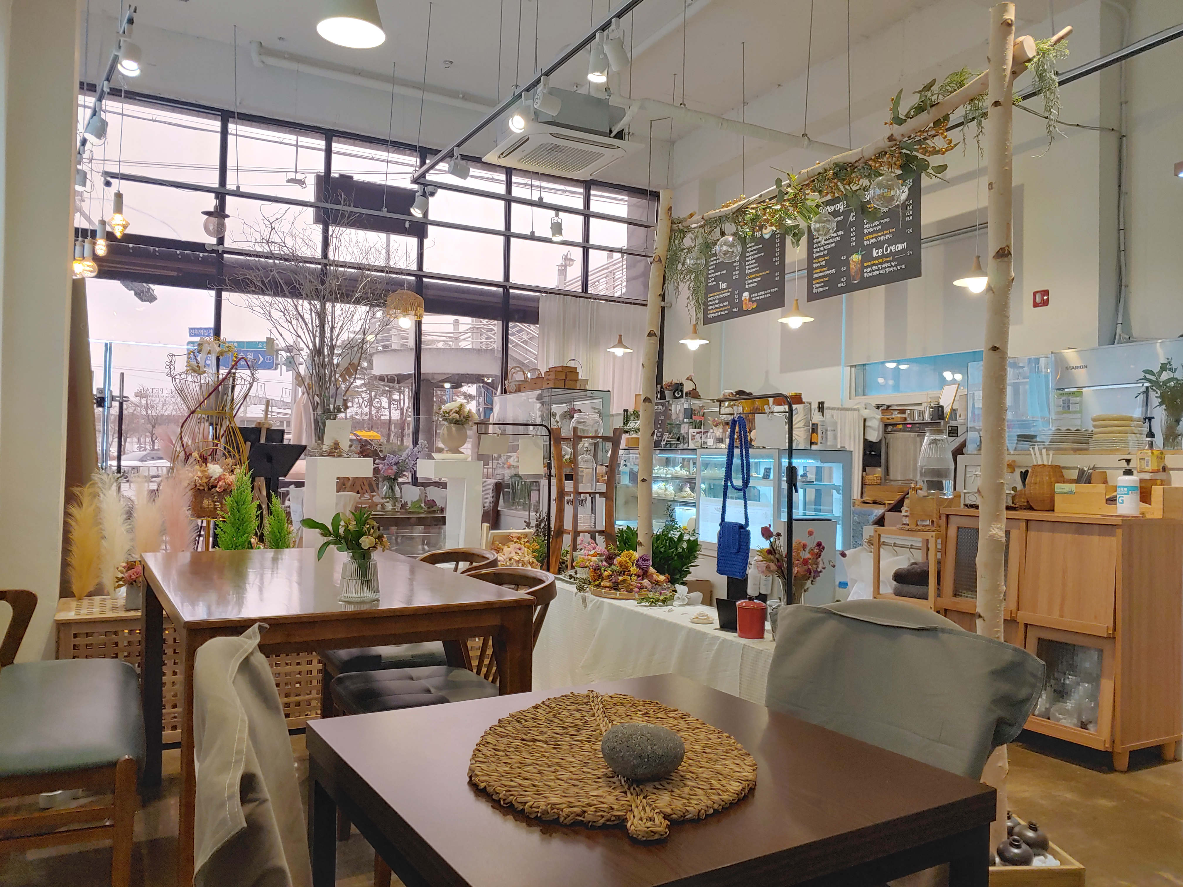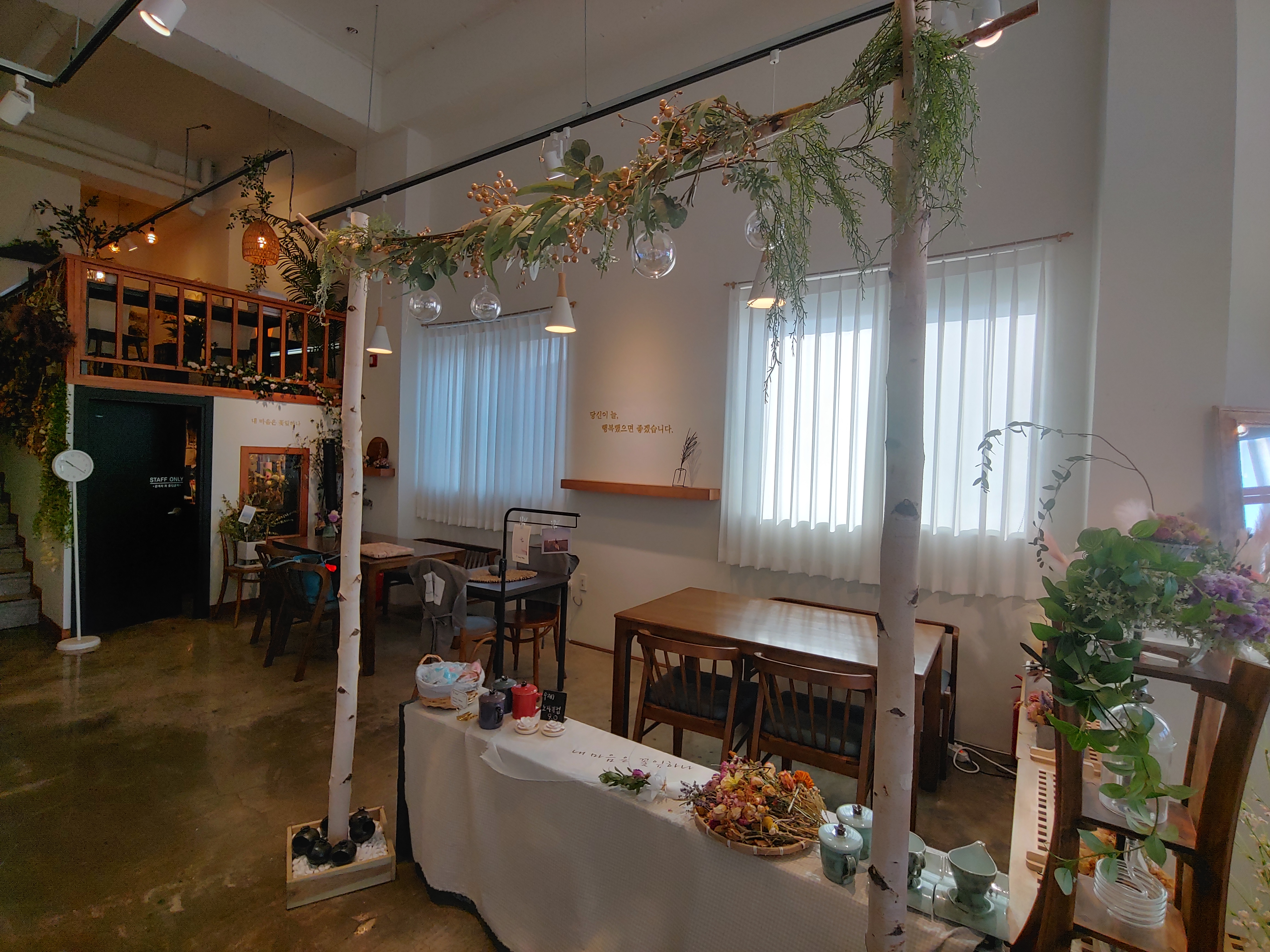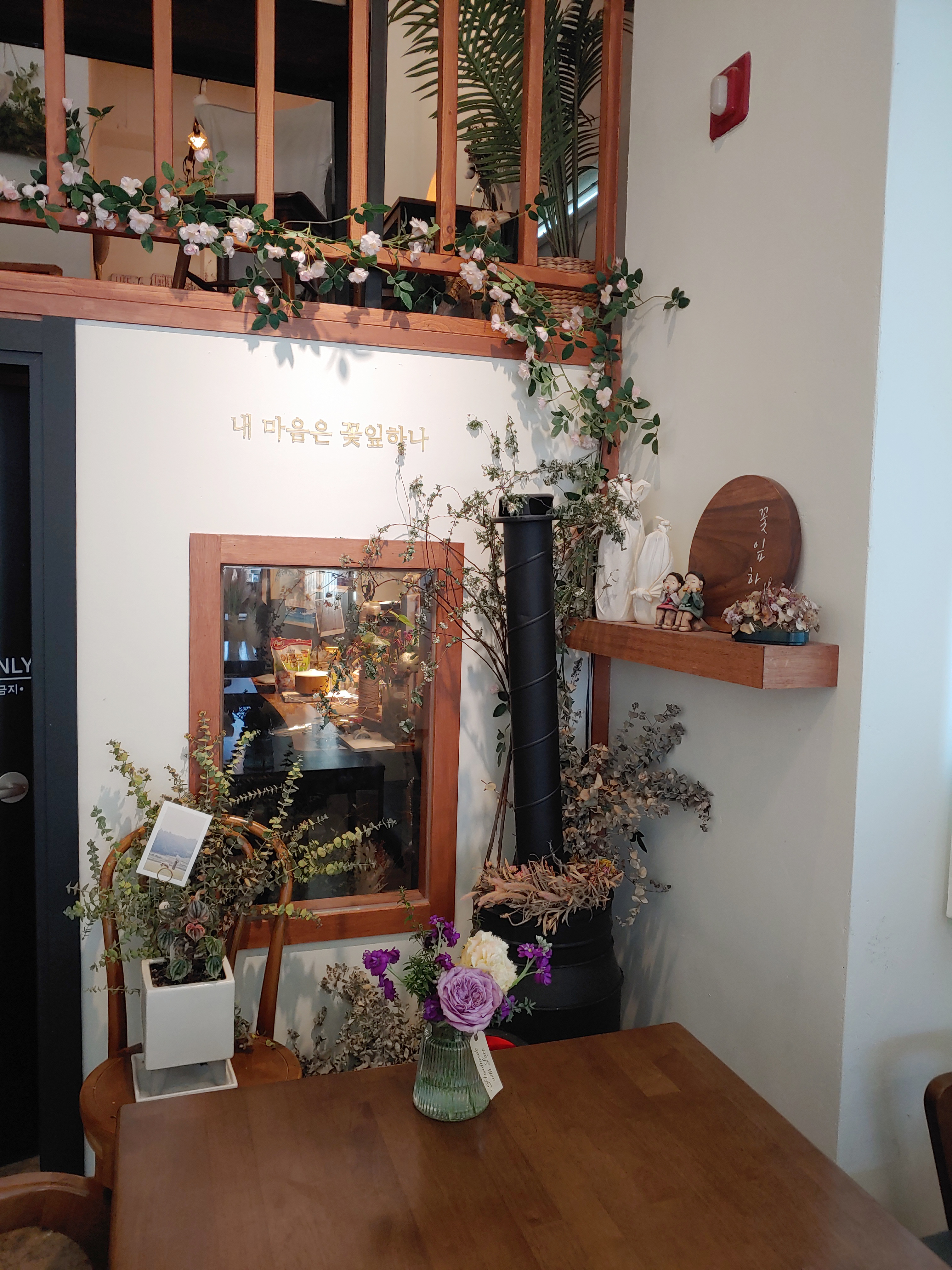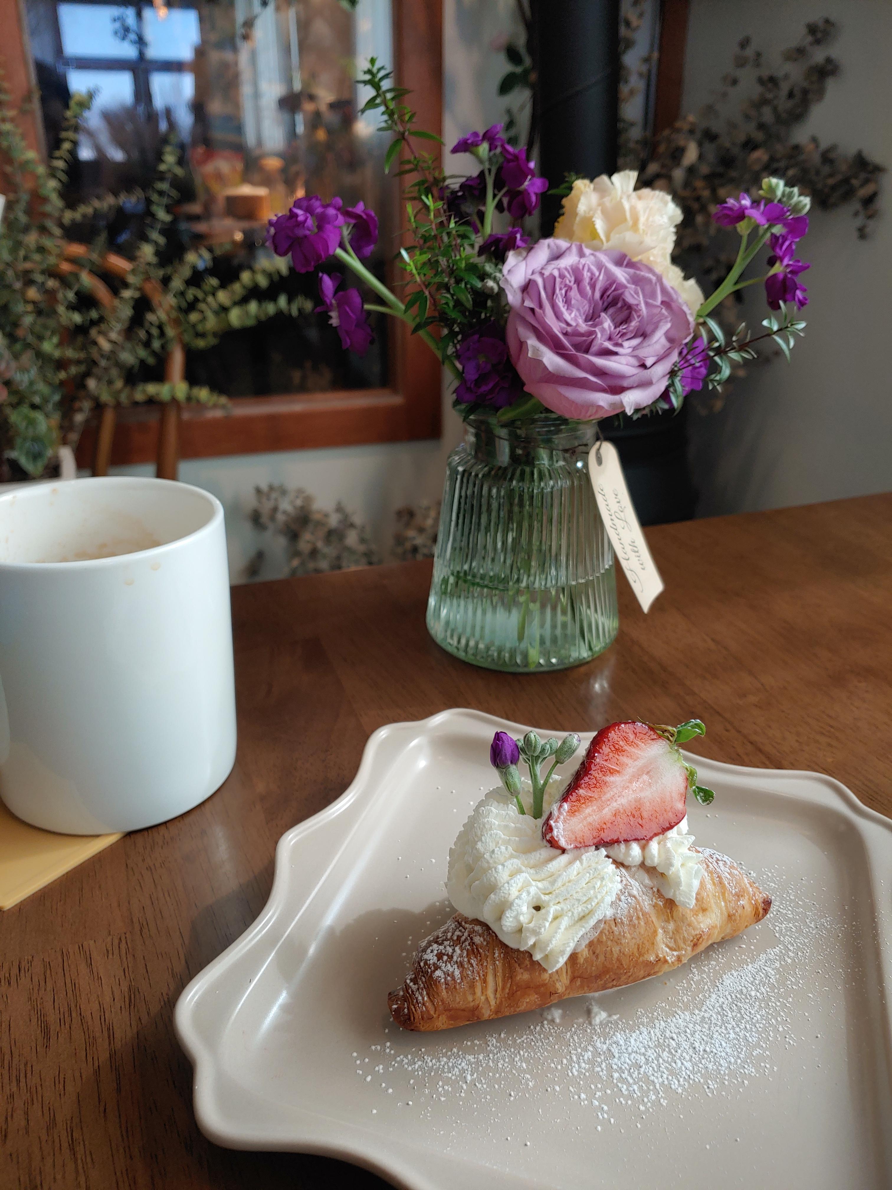 꽃과 카페의 분위기 그리고 다른 소품들을 유기적으로 잘 활용해서 오는 손님들이 음료만 즐기는 게 아니라 공간에서 오는 감성도 편안하게 느낄 수 있도록 꾸민 것 같아요.