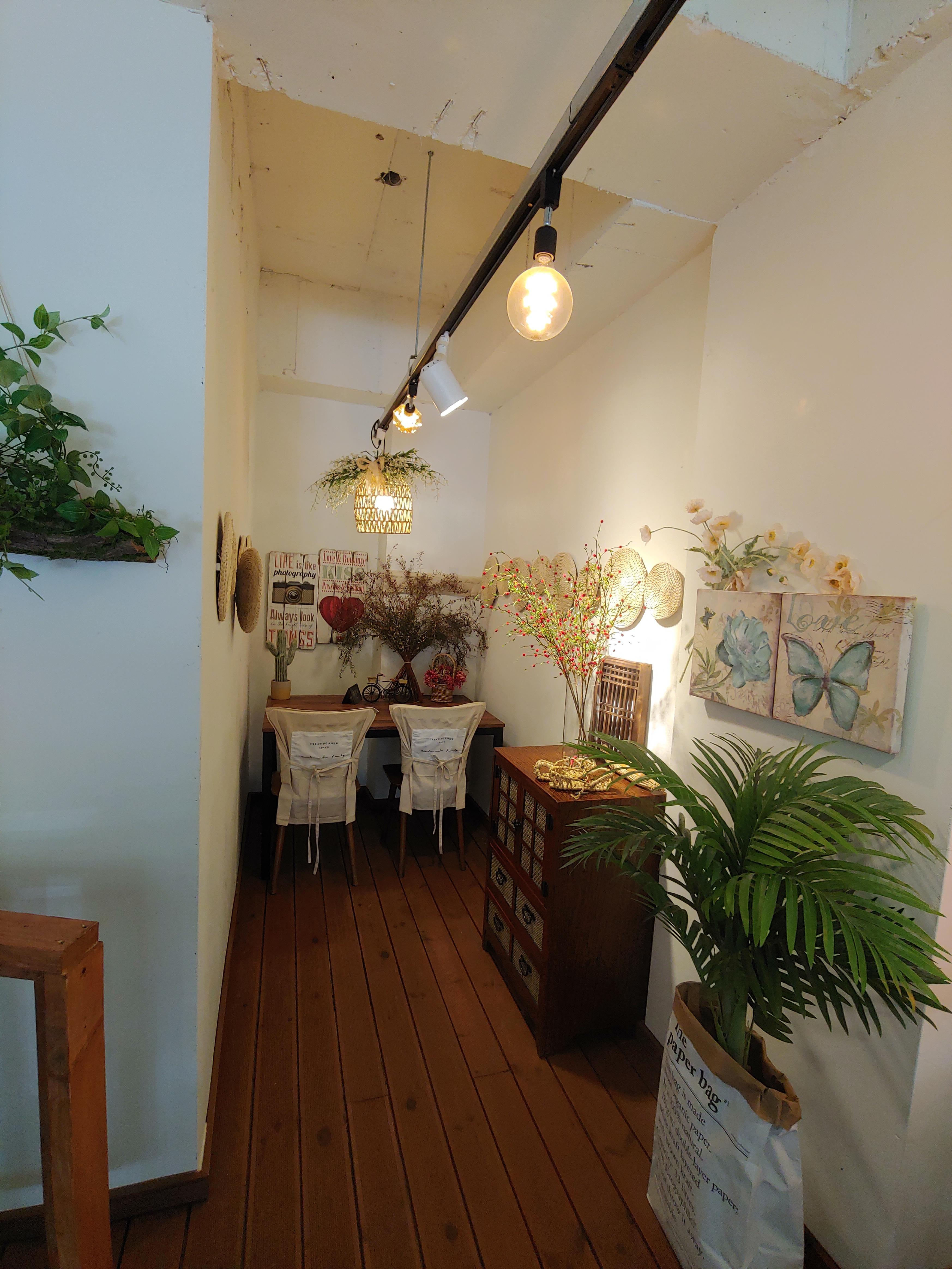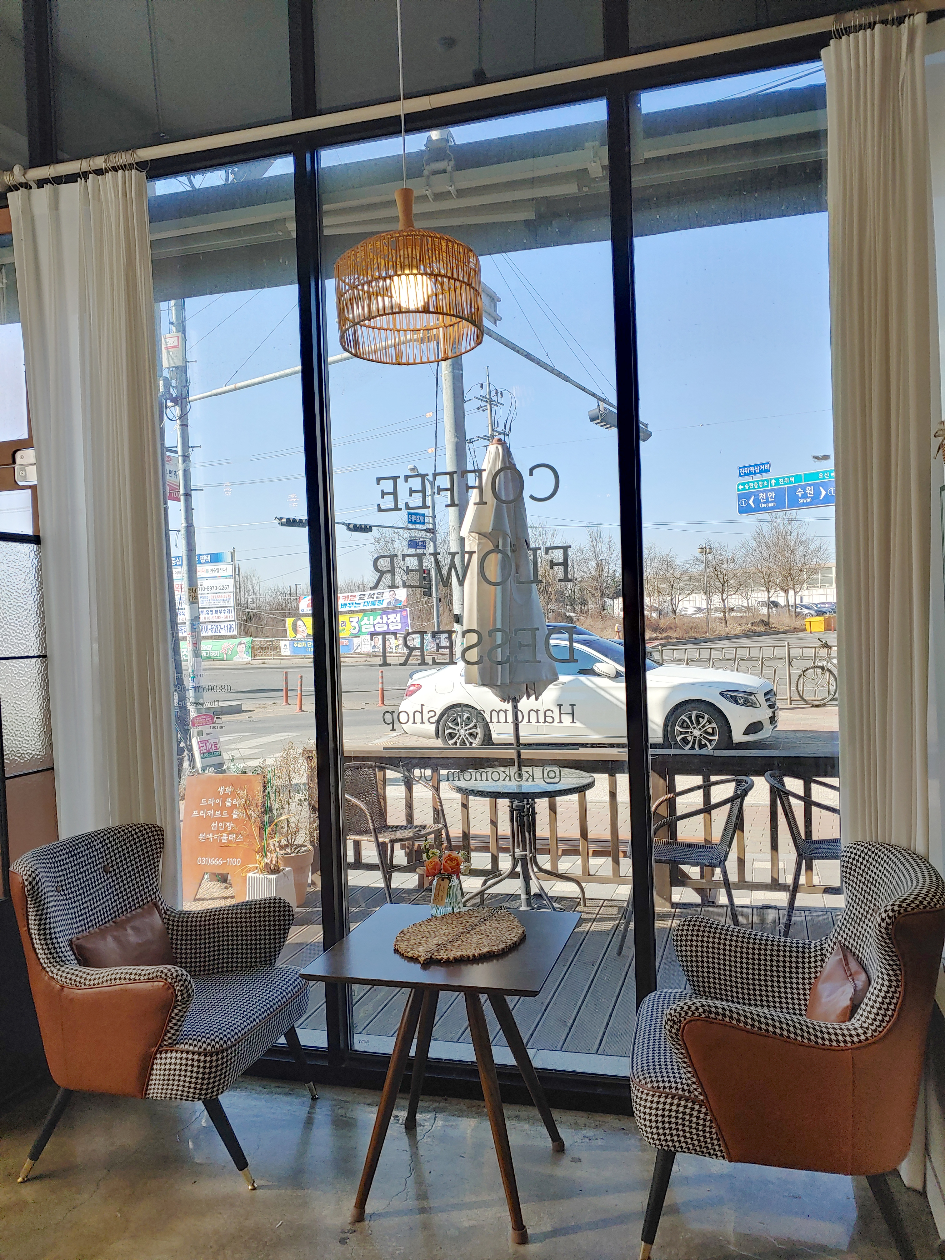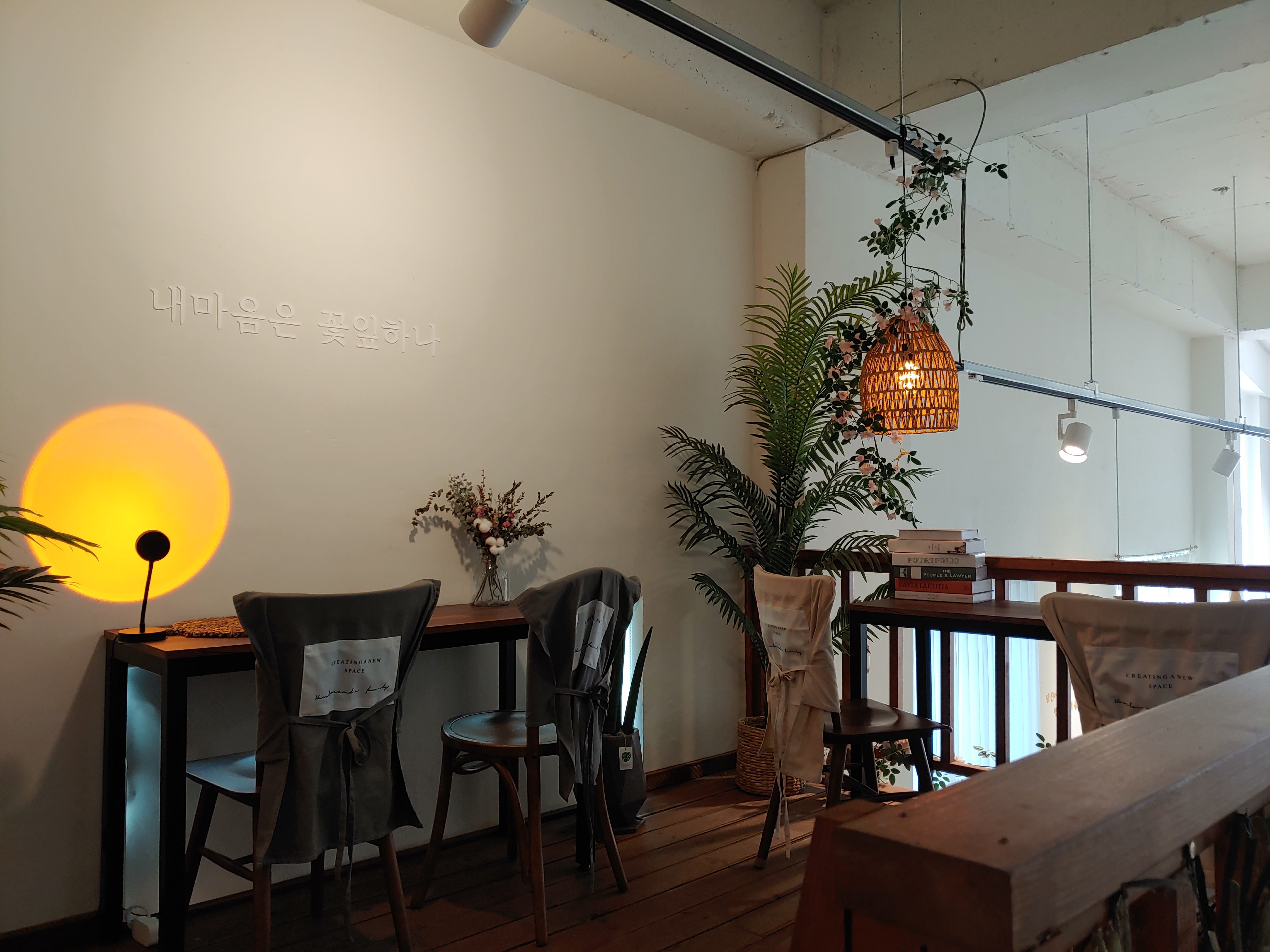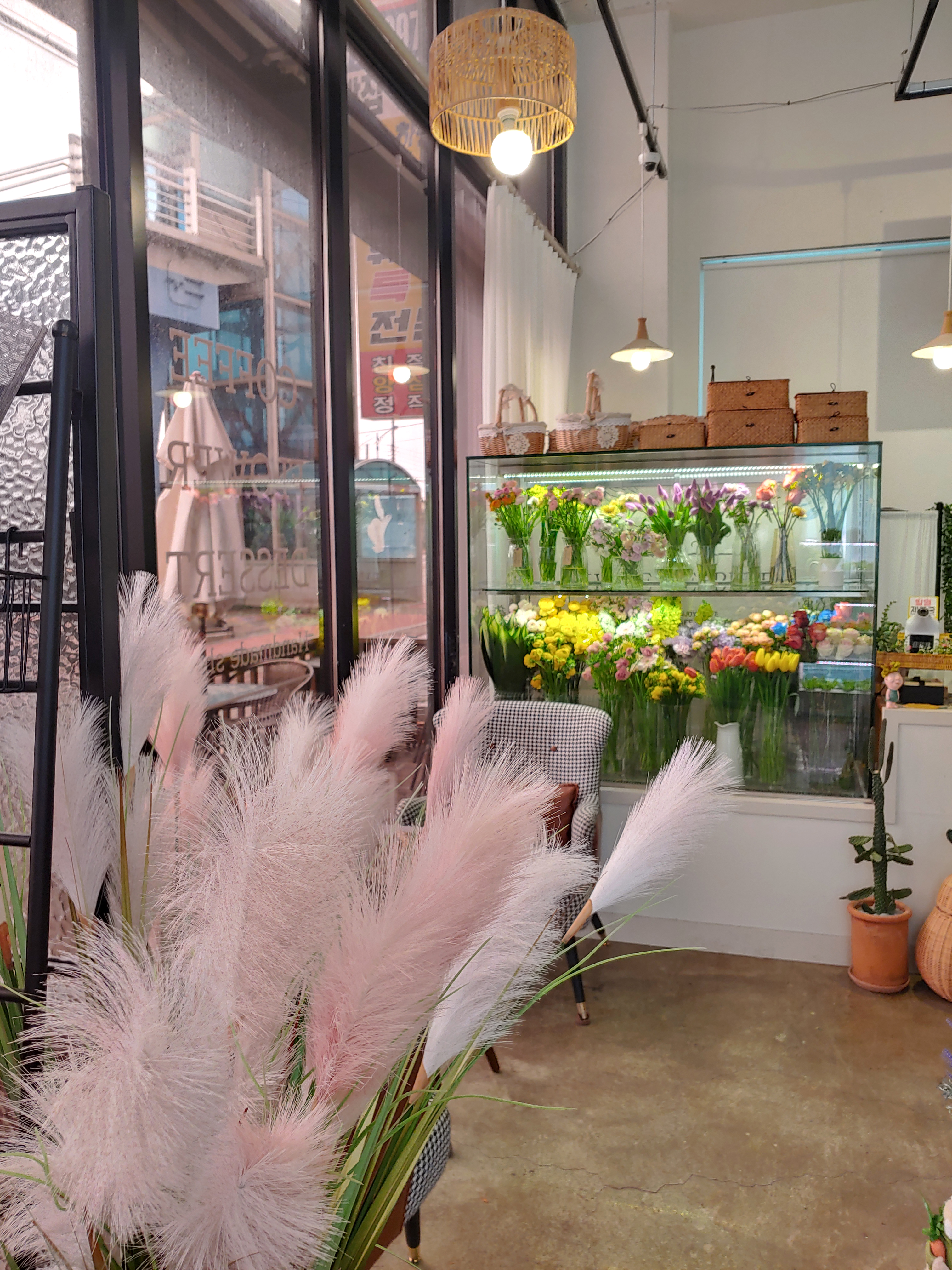 꽃과 카페의 분위기 그리고 다른 소품들을 유기적으로 잘 활용해서 오는 손님들이 음료만 즐기는 게 아니라 공간에서 오는 감성도 편안하게 느낄 수 있도록 꾸민 것 같아요.